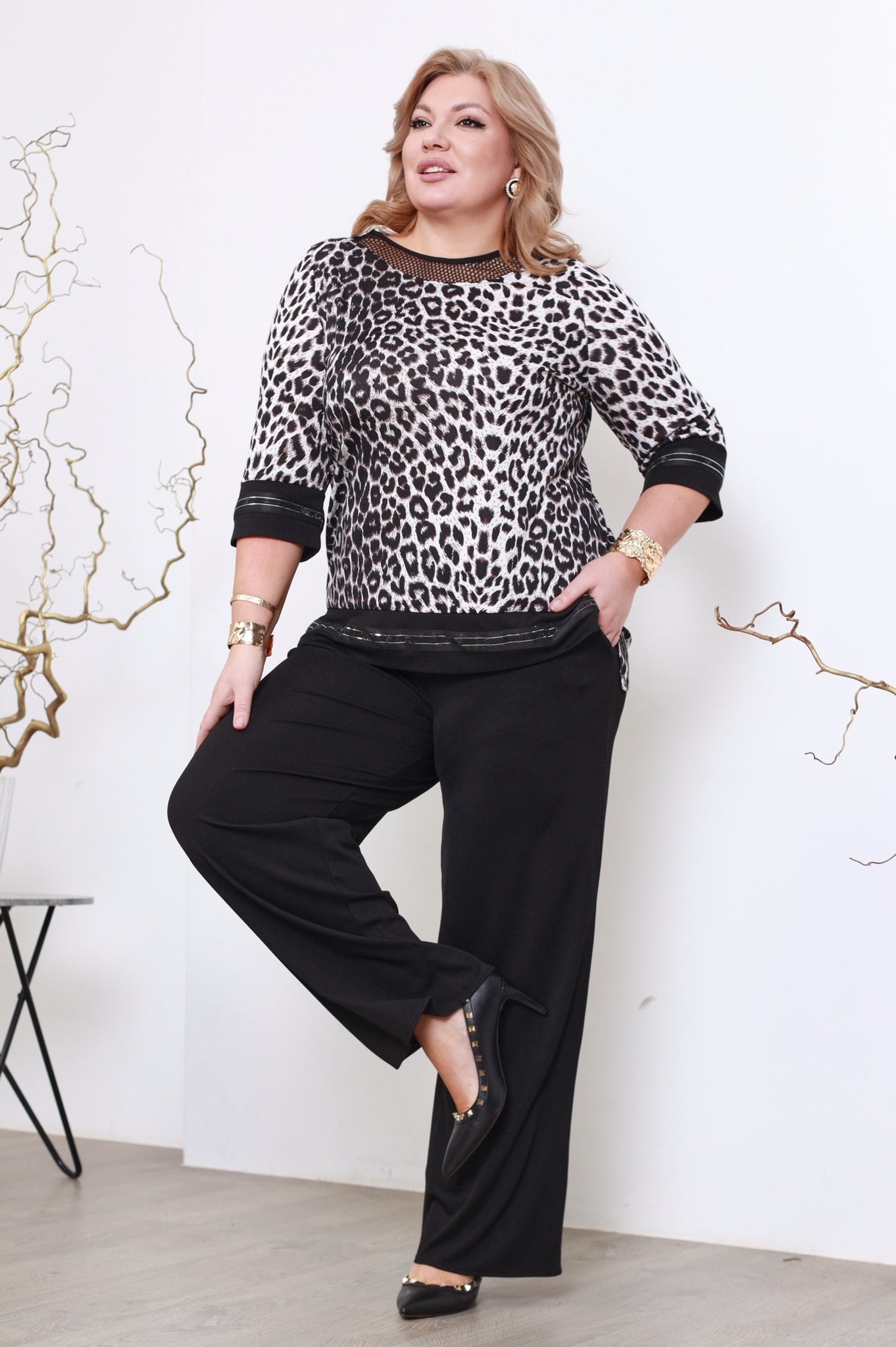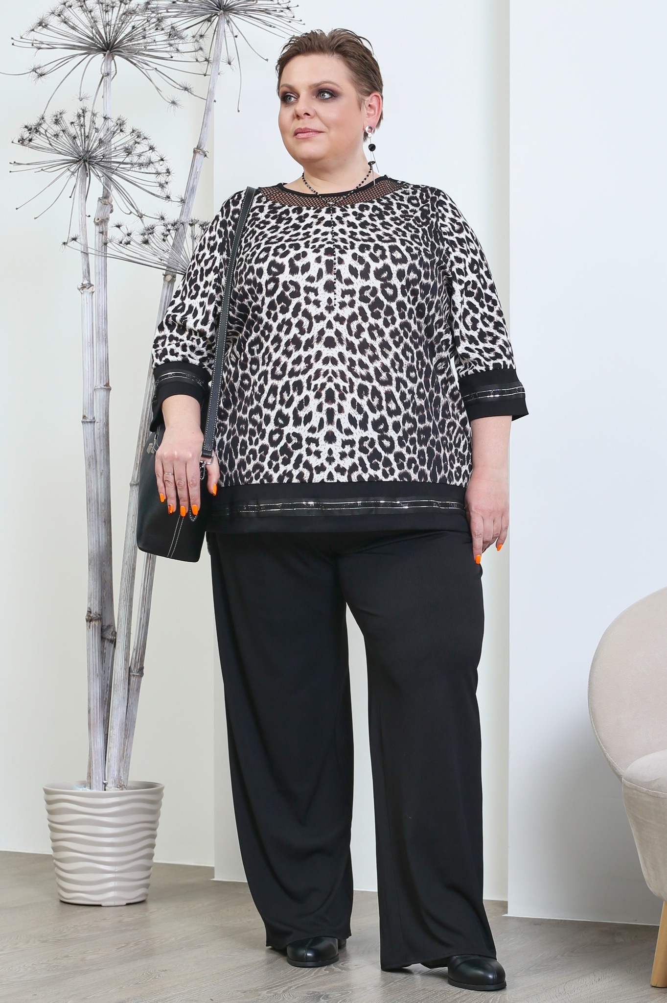 Стильный костюм из мягкого трикотажа состоит из туники и брюк. свободные к низу брюки отлично сидят за счет эластичной резинки на поясе. по бокам практичные вшивные карманы. туника свободного силуэта искусно обыгрывает фигуру и не сковывает движений. круглый вырез горловины декорирован нежной сеточкой, что добавляет модели женственности. рукава длиной 3/4, как и низ туники оформлен контрастными вставками со стразами, что освежает образ и добавляет нарядности. удлиненная спинка и небольшие разрезы по бокам способствуют оптимальной посадке по фигуре. костюм отлично подойдёт для прогулок в прохладную погоду.