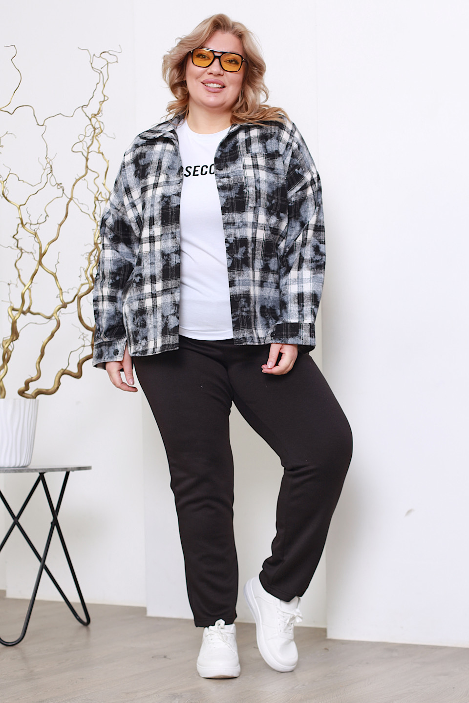 Костюм из мягкого материала состоит из удлиненной рубашки, футболки и брюк. брюки отлично сидят за счет широкой эластичной резинки на поясе. по бокам практичные карманы. рубашка прямого кроя. круглый вырез оформлен классическим отложным воротником. рукава полной длины с приспущенной проймой по низу дополнены манжетами на пуговках. модель застёгивается на оригинальные пуговки под планку. объемный накладной карман на груди добавляет модели оригинальности, а актуальный принт в клетку добавляет динамичности. футболка прямого кроя декорирована оригинальной надписью. костюм превосходно сочетается как с каблуками для создания нарядного образа, так и с кедами для более повседневного стиля. модель также можно носить по отдельности.