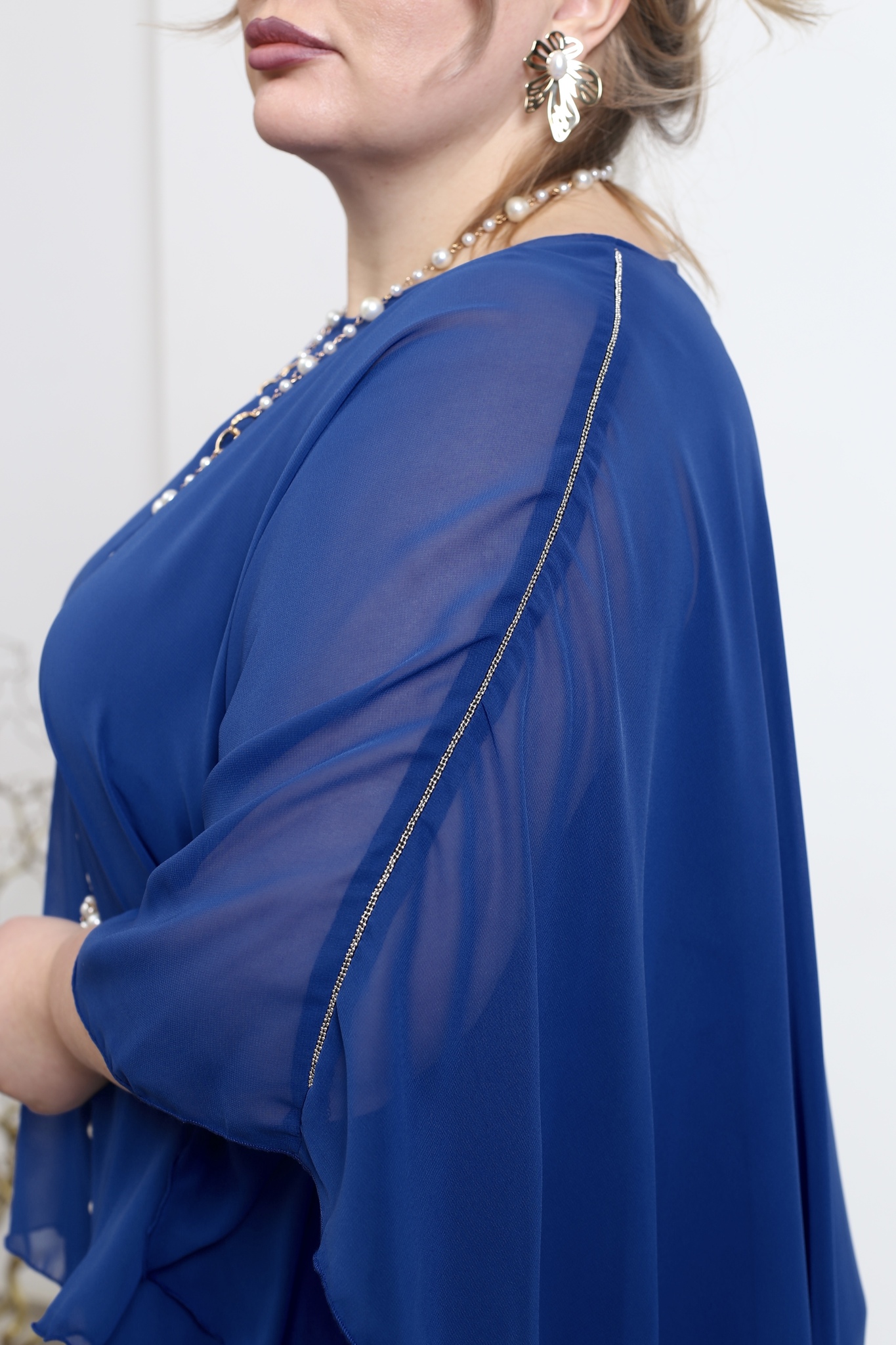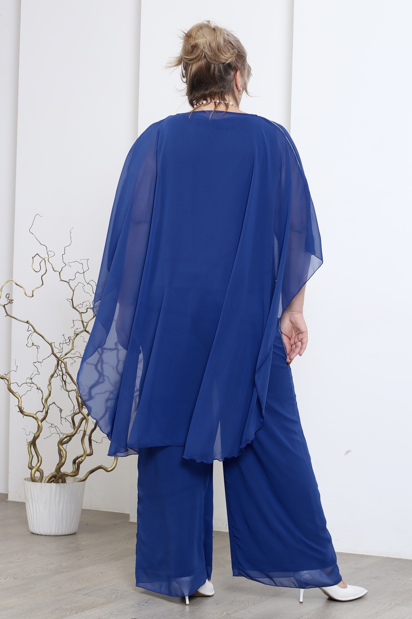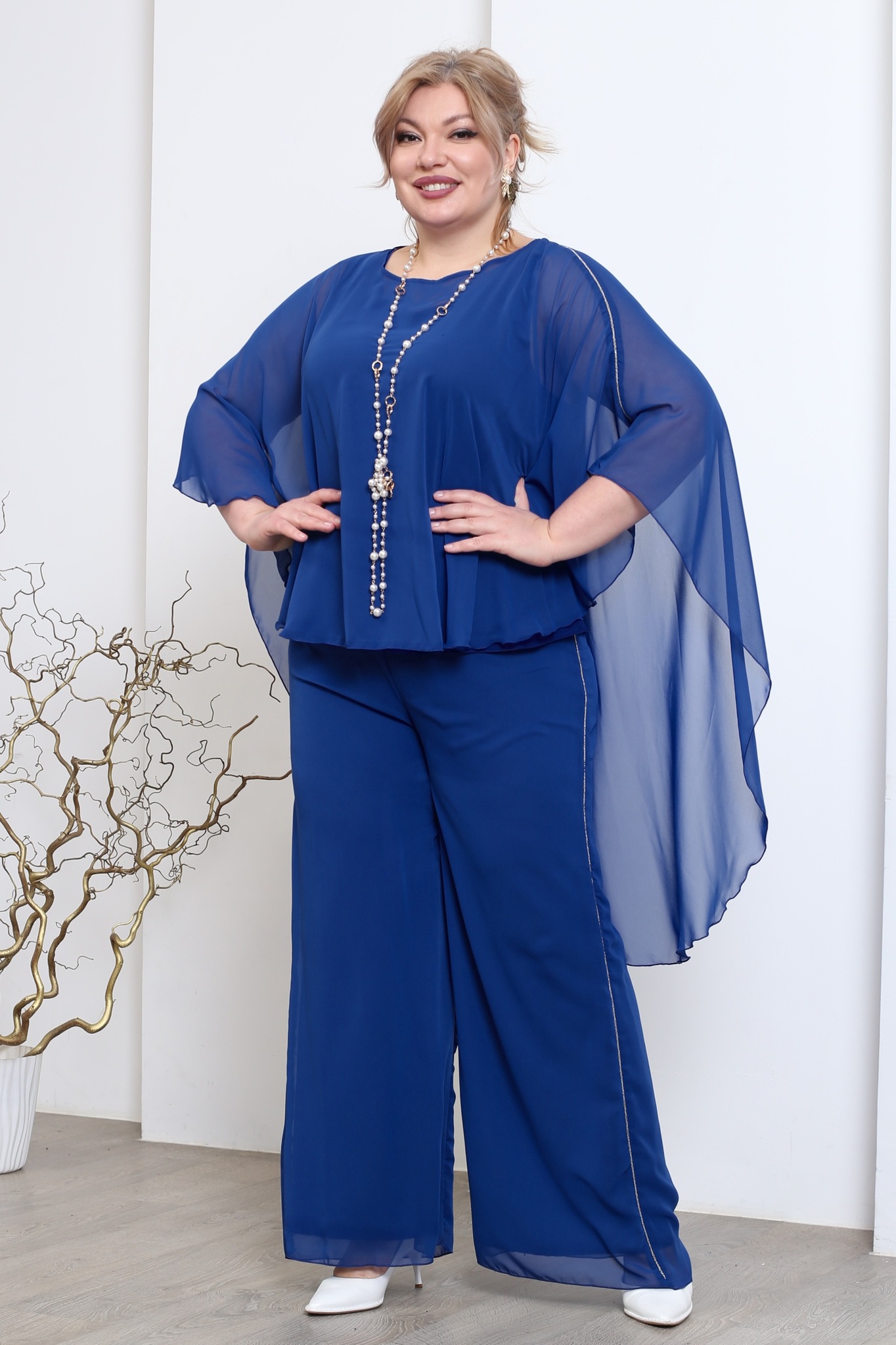 Стильный костюм из мягкого струящегося шифона на эластичной подкладе состоит из кофты и брюк. удобные брюки-палаццо свободного кроя имеют завышенную линию талии. тонкая вставка из серебряных нитей по бокам зрительно вытягивают ноги и визуально стройнят. шифоновый верх искусно скрывает мелкие недостатки фигуры. брюки отлично сидят за счет комфортной резинки на поясе.