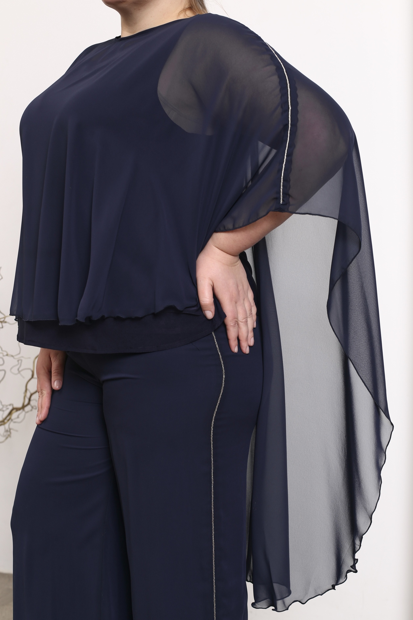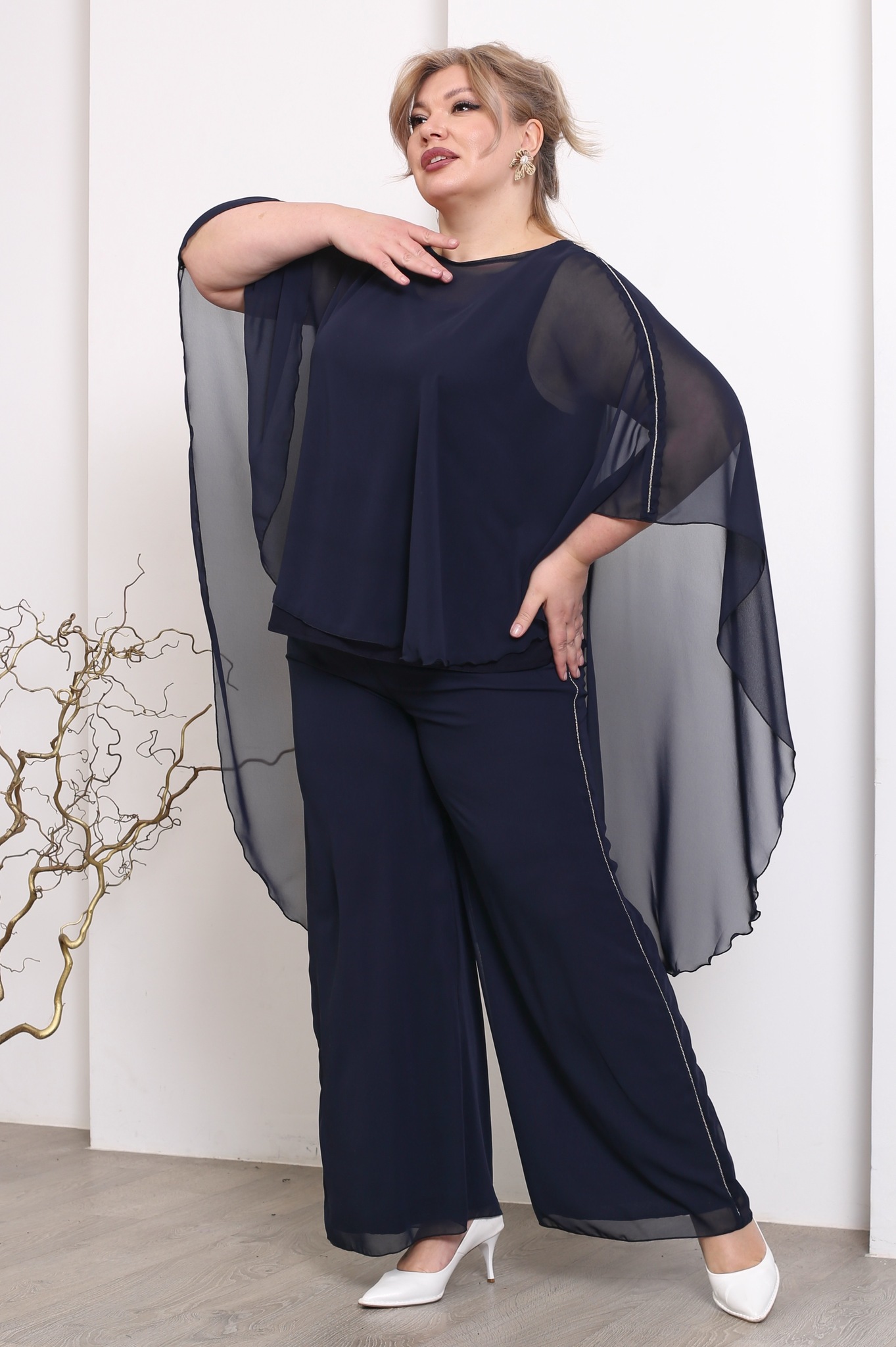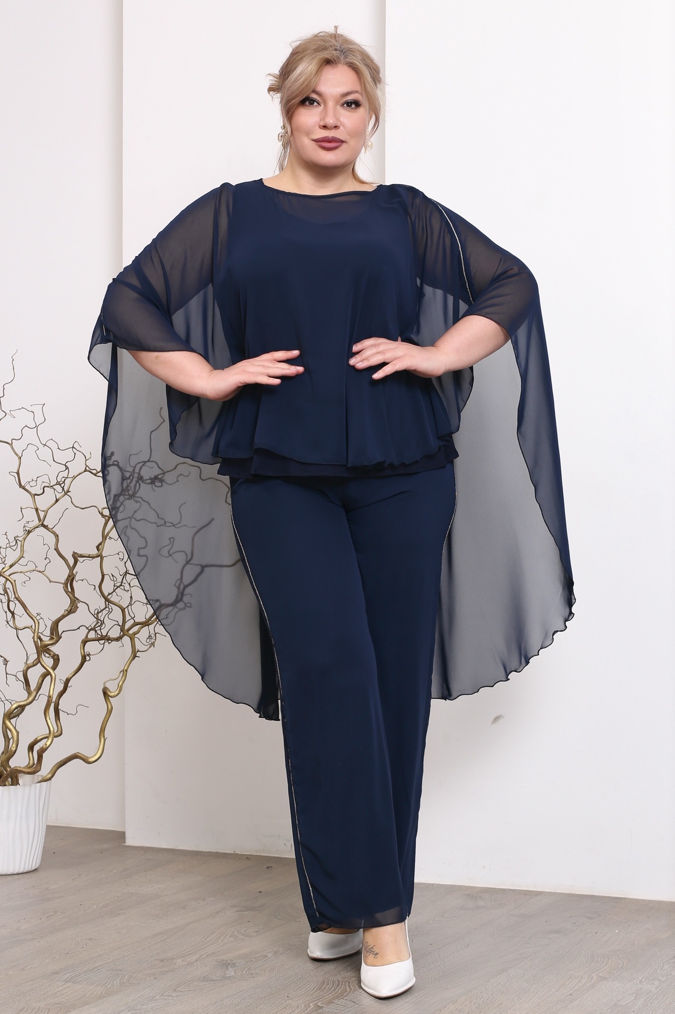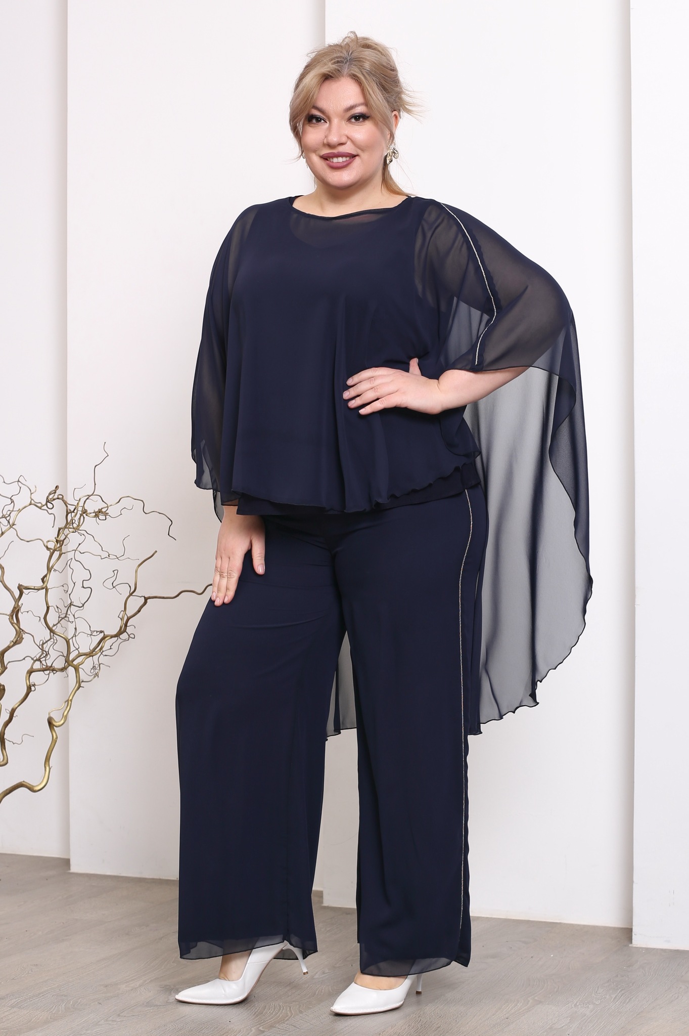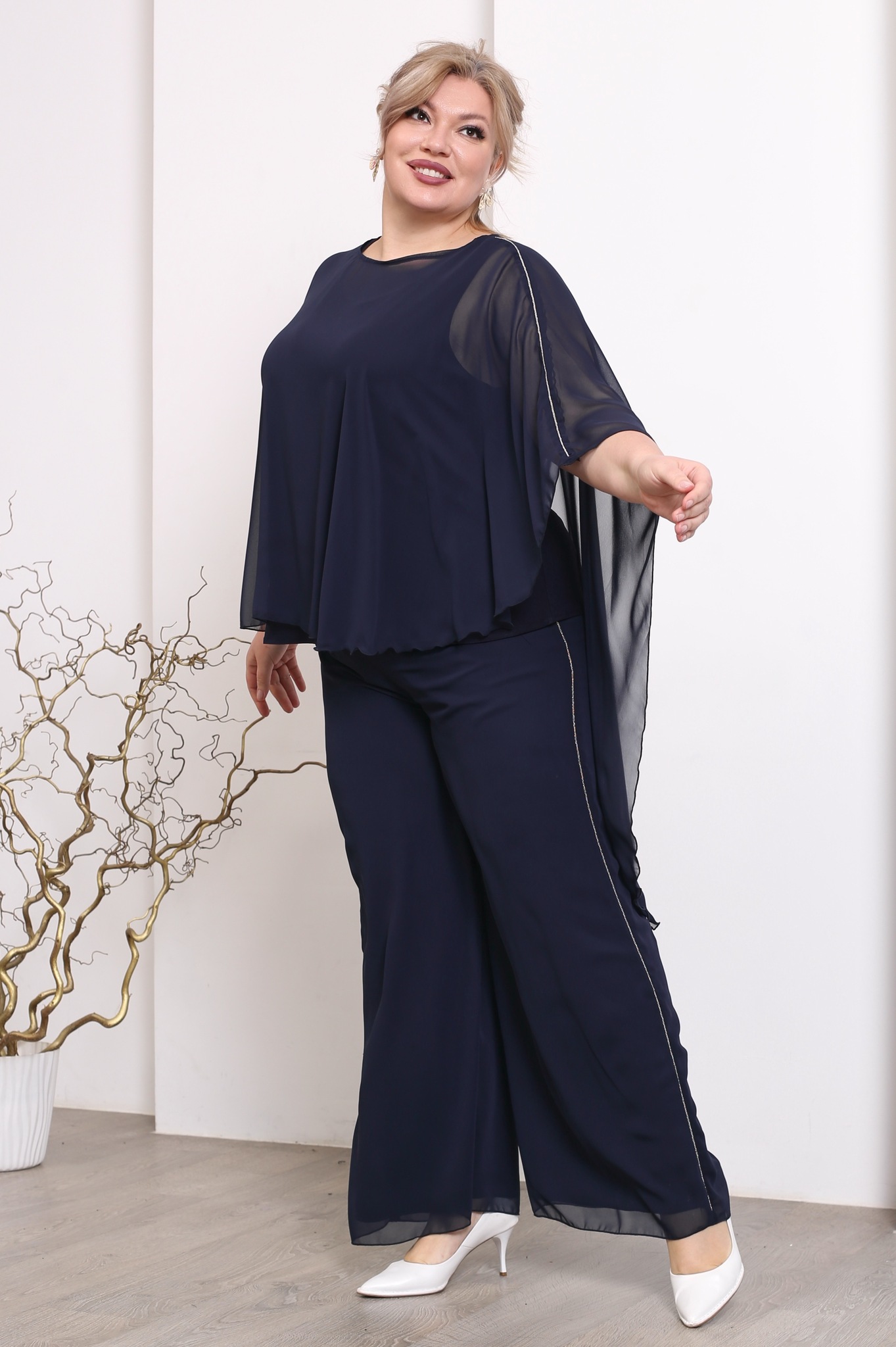 Стильный костюм из мягкого струящегося шифона на эластичной подкладе состоит из кофты и брюк. удобные брюки-палаццо свободного кроя имеют завышенную линию талии. тонкая вставка из серебряных нитей по бокам зрительно вытягивают ноги и визуально стройнят. шифоновый верх искусно скрывает мелкие недостатки фигуры. брюки отлично сидят за счет комфортной резинки на поясе.