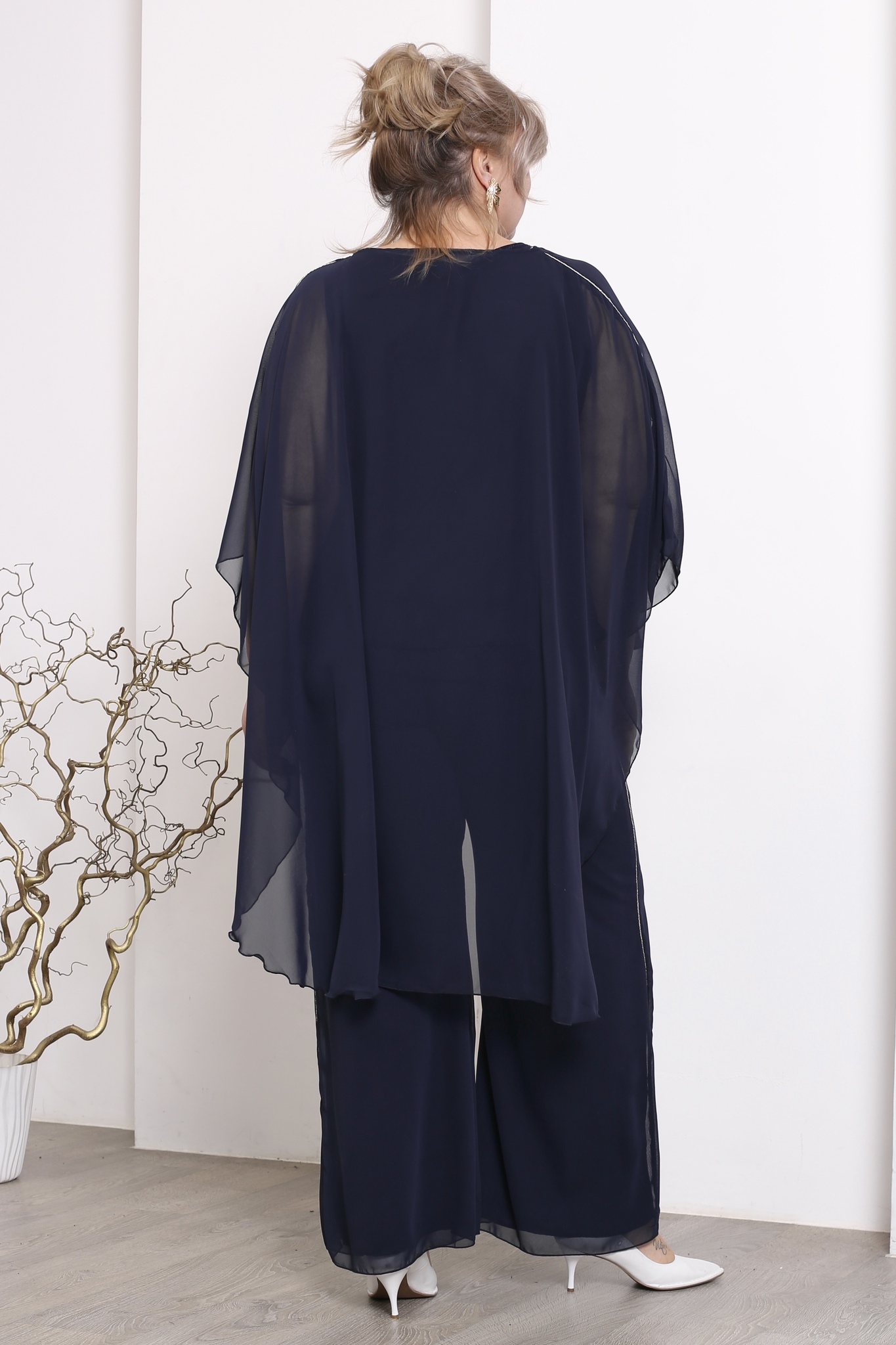 Костюм брючный шифон с длинной спинкой темно-синий