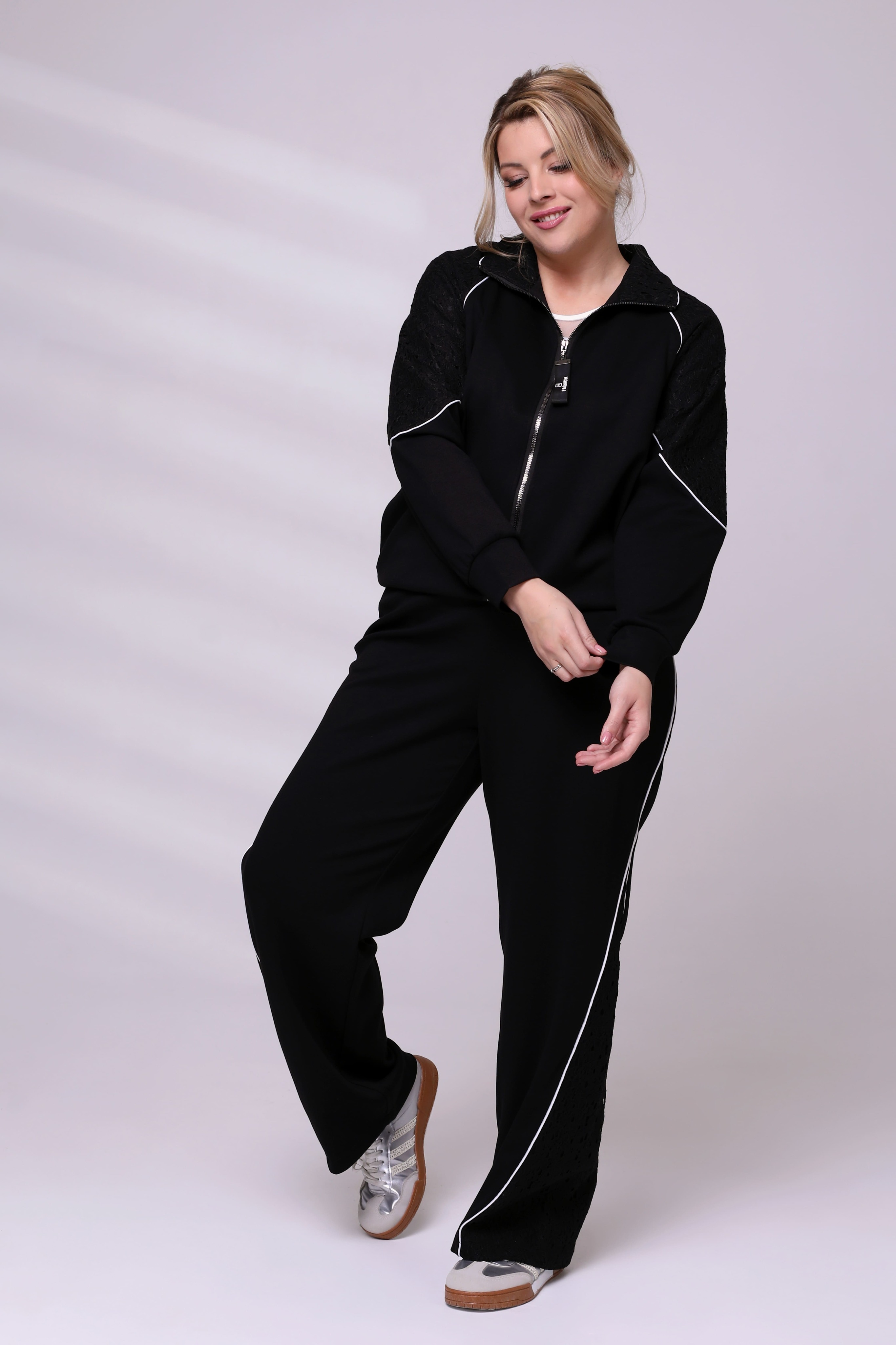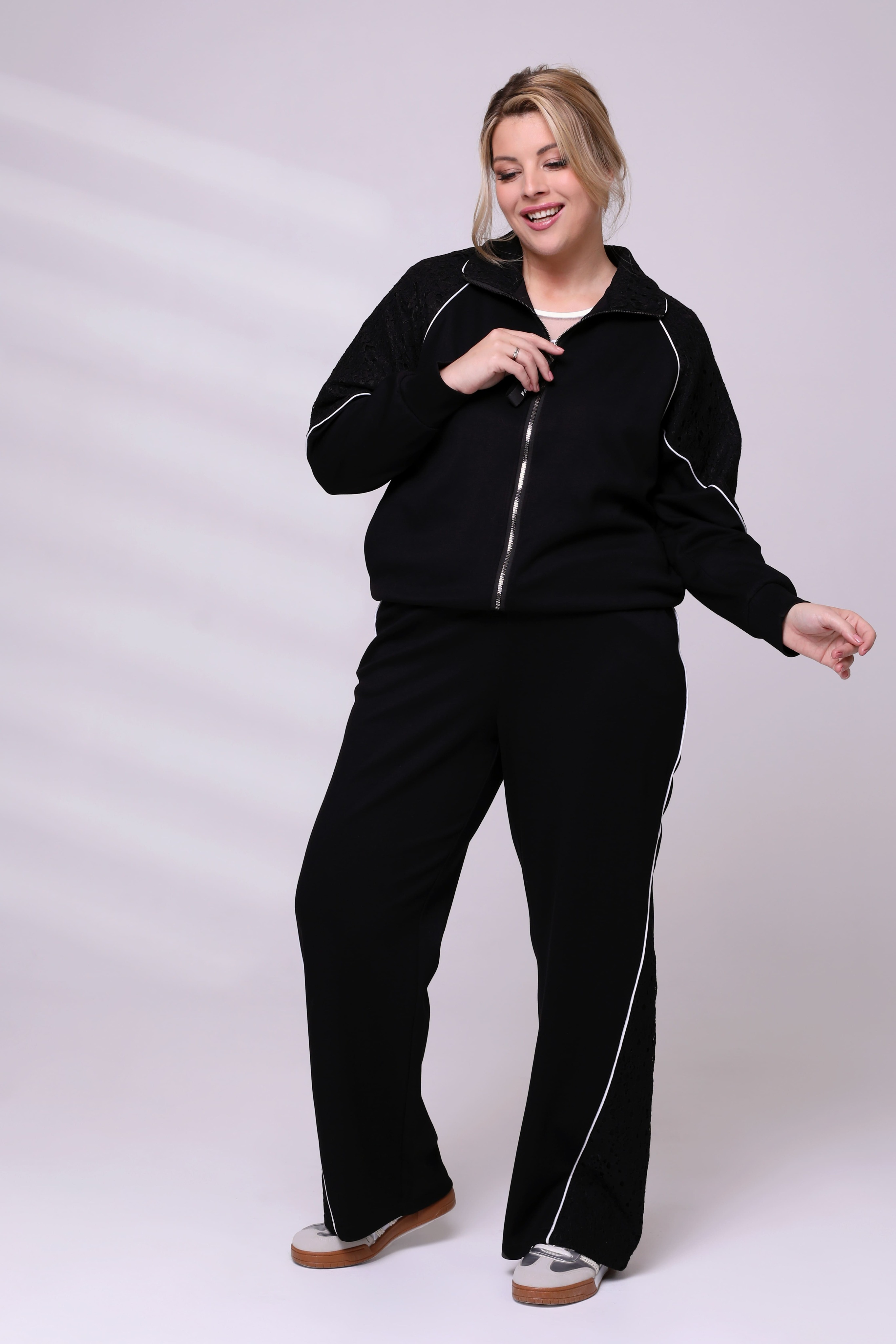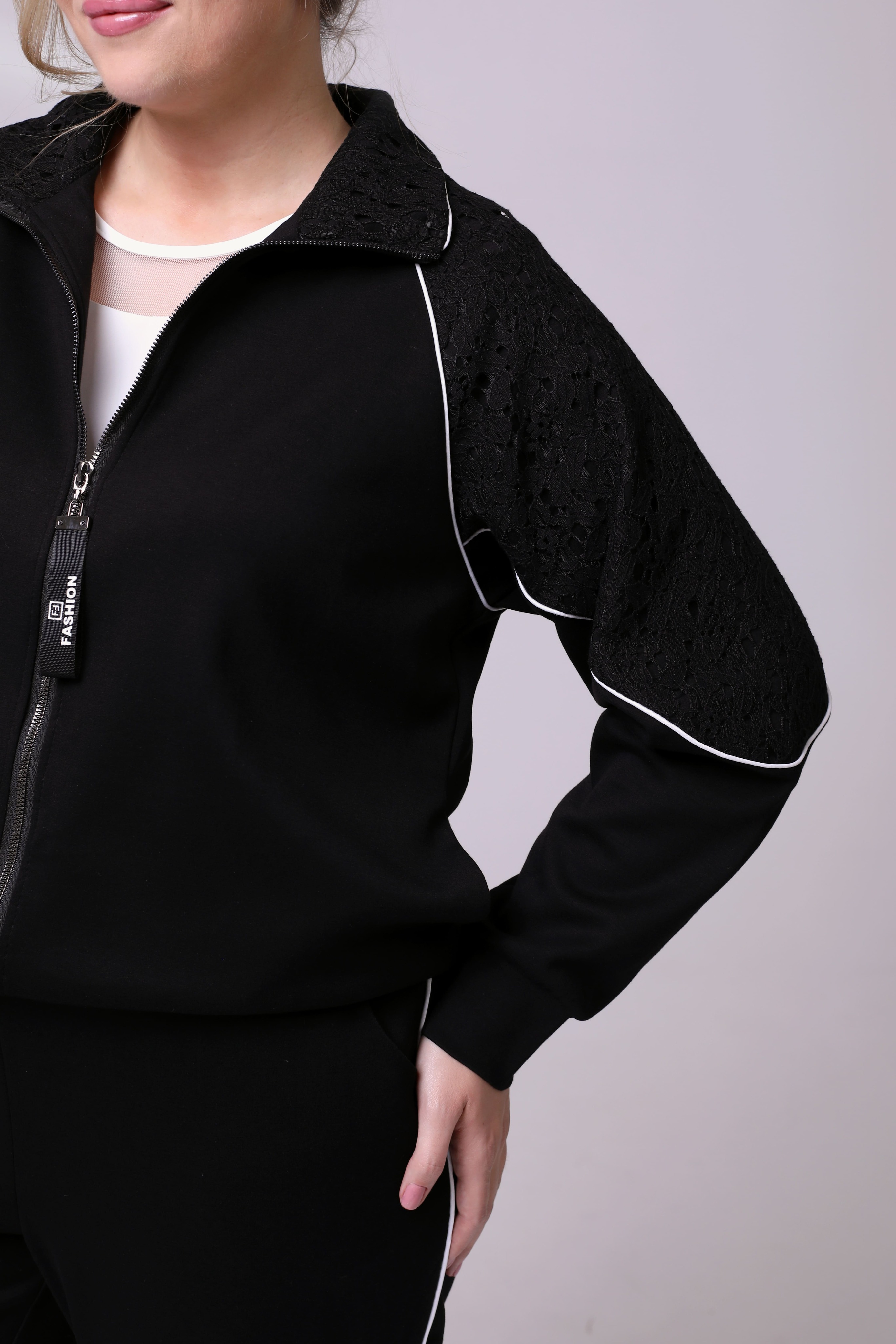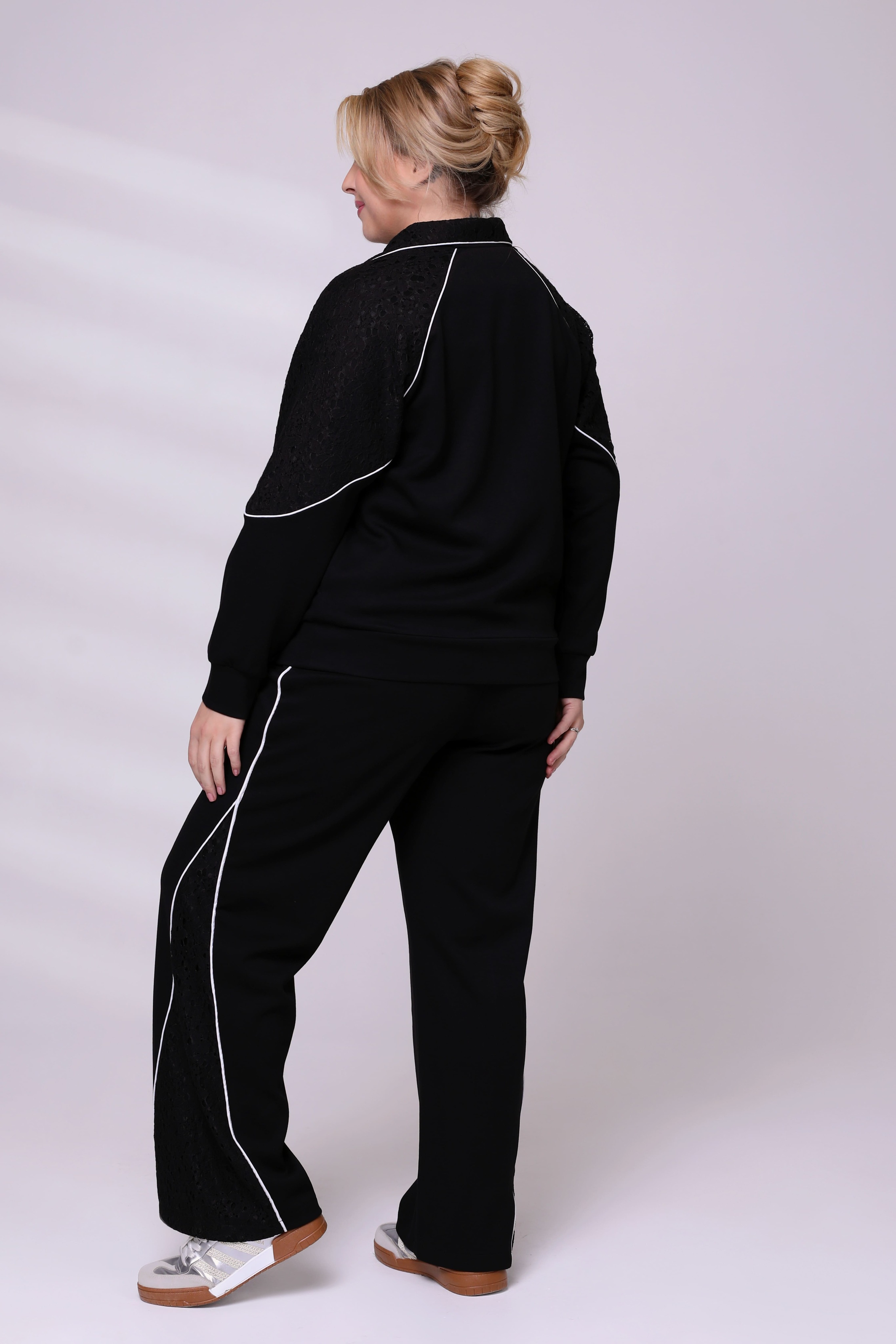 Стильная кофта присобрана по низу на притачную резинку. круглый вырез дополнен стойкой-воротником, который защитит шею от ветра. рукава-реглан полной длины по низу оформлены широкими манжетами. кофта застёгивается спереди по всей длине на молнию. контрастные строчки на кофте и брюках освежают образ и добавляют динамичности. прорезные карманы оформлены листочками. стильный костюм отлично подходит для тренировок и прогулок в прохладную ветреную погоду.