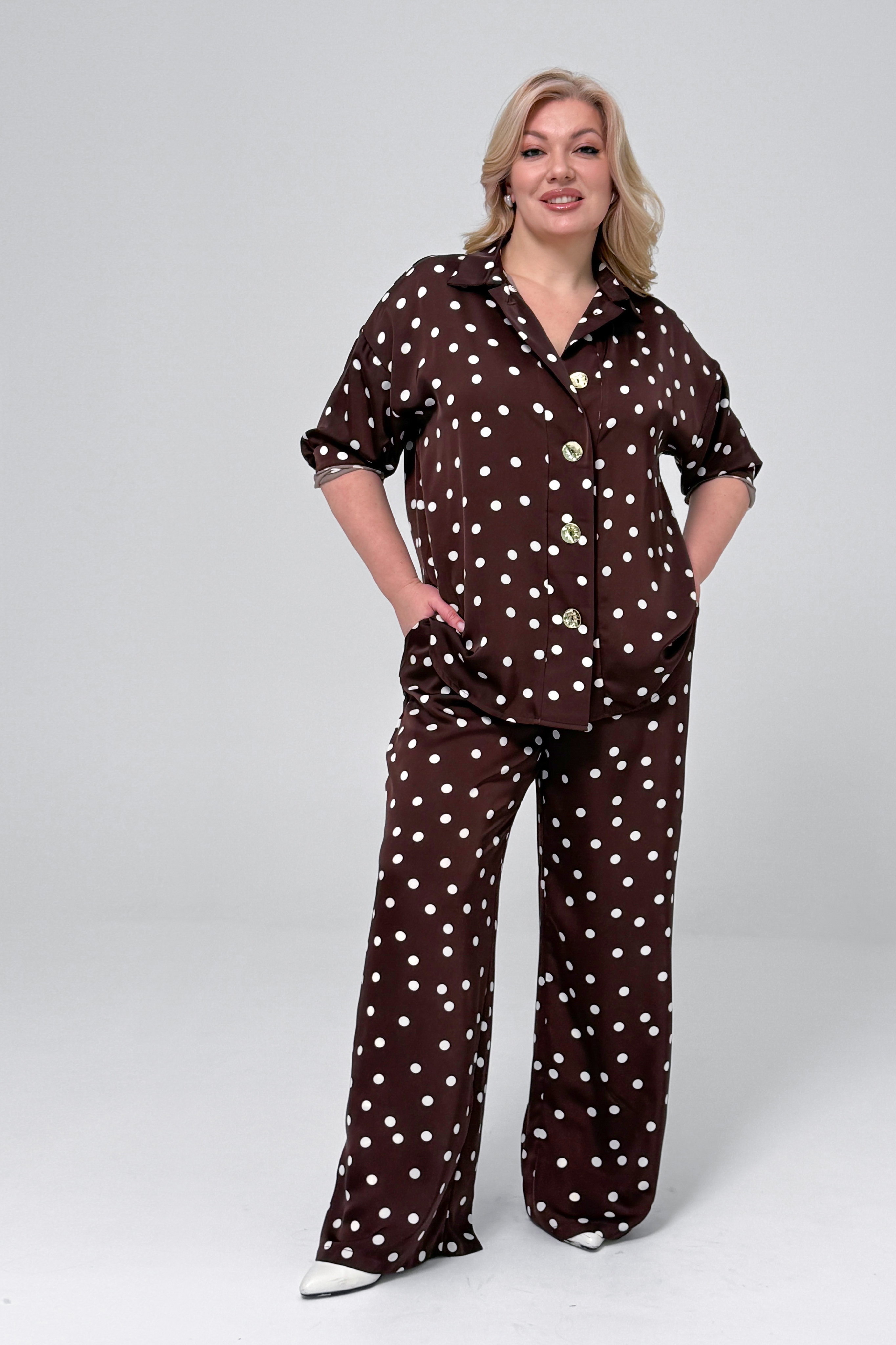 Удлиненная рубашка прямого кроя. v-образный вырез оформлен классическим отложным воротником. приспущенные рукава длиной 3/4 по низу присобраны манжетами. модель застёгивается на оригинальные пуговки под планку. актуальный гороховый принт добавляет динамичности. костюм превосходно сочетается как с обувью на каблуках для создания нарядного образа, так и с кедами для более повседневного стиля. элементы модели можно также носить по отдельности.