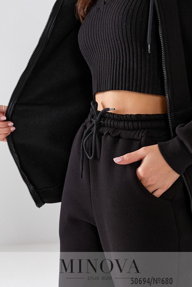 Спортивный костюм который имеет кофту свободного кроя с капюшоном и карманом кенгуру. застегивается на удобную молнию, что добавляет практичности вашему образу. брюки удобные на резинке и имеют два кармана для хранения необходимых вещей. низ костюма завершен манжетами, что добавляет дополнительный стиль. этот комплект - идеальный выбор для отдыха или повседневных дел, где удобство сочетается со стилем. почувствуйте комфорт и выглядите стильно в этом костюме. На модели представлен размер 42-44 Ориентировочные замеры по готовому изделию: Кофта: 42-44 р-р: длина изделия: 69см, ог - 104см, об - 94см. 46-48 р-р: длина изделия: 69см, ог - 110см, об - 102см. Брюки: 42-44 р-р: длина брюк по внутреннему шву 74см, длина брюк по внешнему шву с учетом пояса 106см, от - 66/82см, об -90см. 46-48 р-р: длина брюк по внутреннему шву 74см, длина брюк по внешнему шву с учетом пояса 106см, от - 70/88см, об -98см. Рекомендации по уходу: деликатная стирка *замеры могут отличаться от указанных на +-2см в зависимости от особенностей ткани, техническим Особенностям пошива, степенью усадки ткани **в зависимости от цветопередачи вашего монитора, оттенок изделия может немного отличаться ***в зависимости от партии фурнитура в изделии может меняться