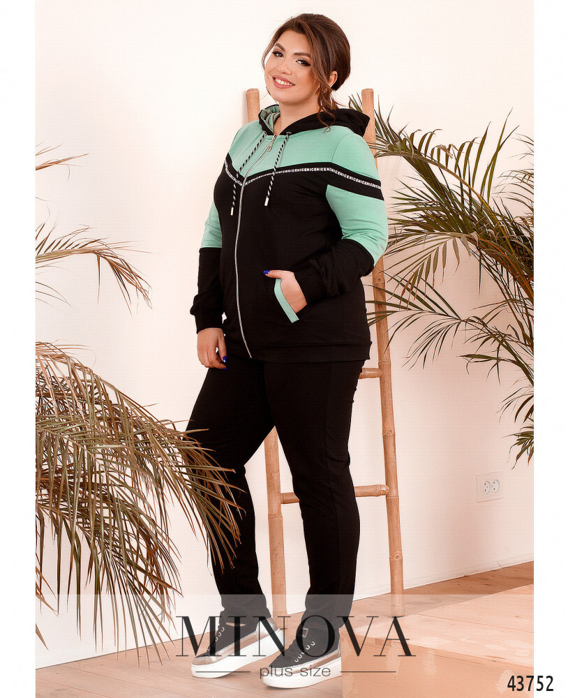 Оригинальный костюм батал, худи застёгивается на молнию спереди по центру, через капюшон пропущен шнурок. худи декорировано яркой лентой с принтом спереди и на рукавах. по бокам - врезные карманы, рукава и подол с манжетом. брюки с высокой талией, в пояс вшита резинка, по бокам - врезные карманы.