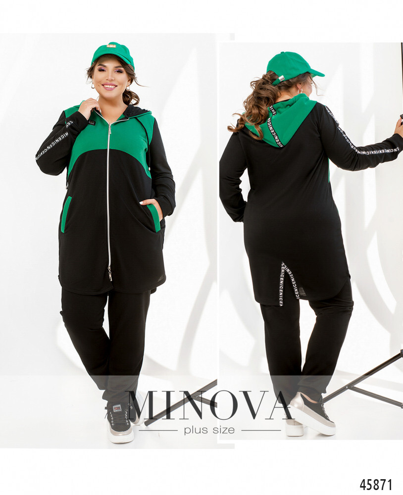 Приятный повседневный костюм большого размера с длинной кофтой на молнии. по бокам на курточке врезные карманы, в наличии капюшон со шнурком. рукава с лампасами. брюки со вшитой в пояс резинкой, с карманами, без застёжек, посадка высокая.