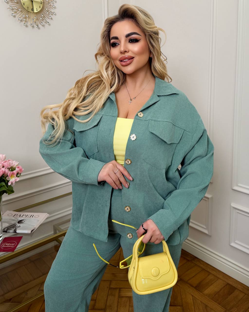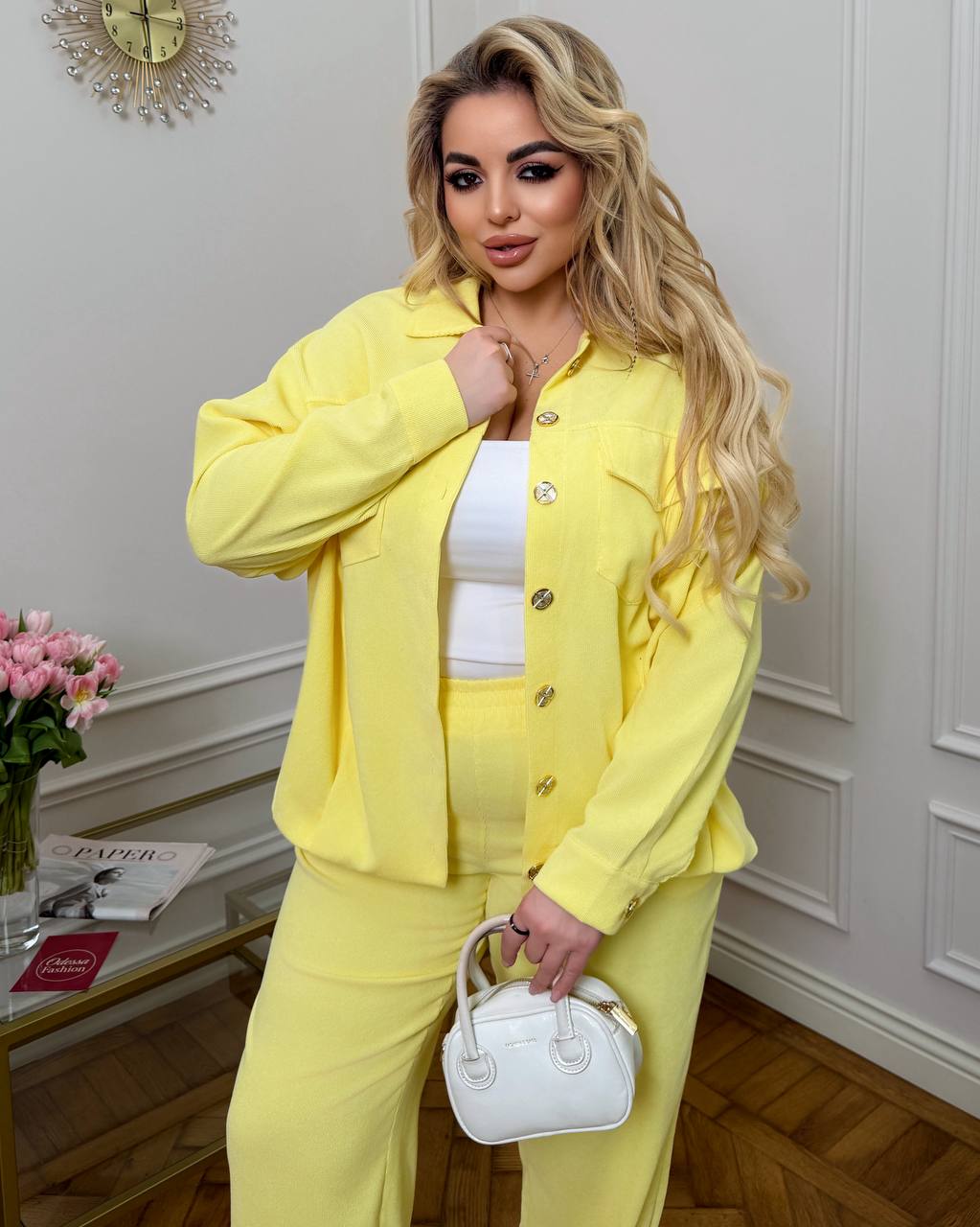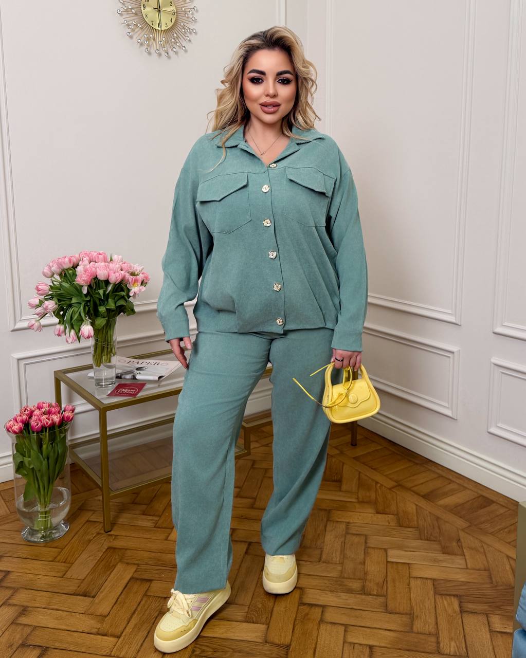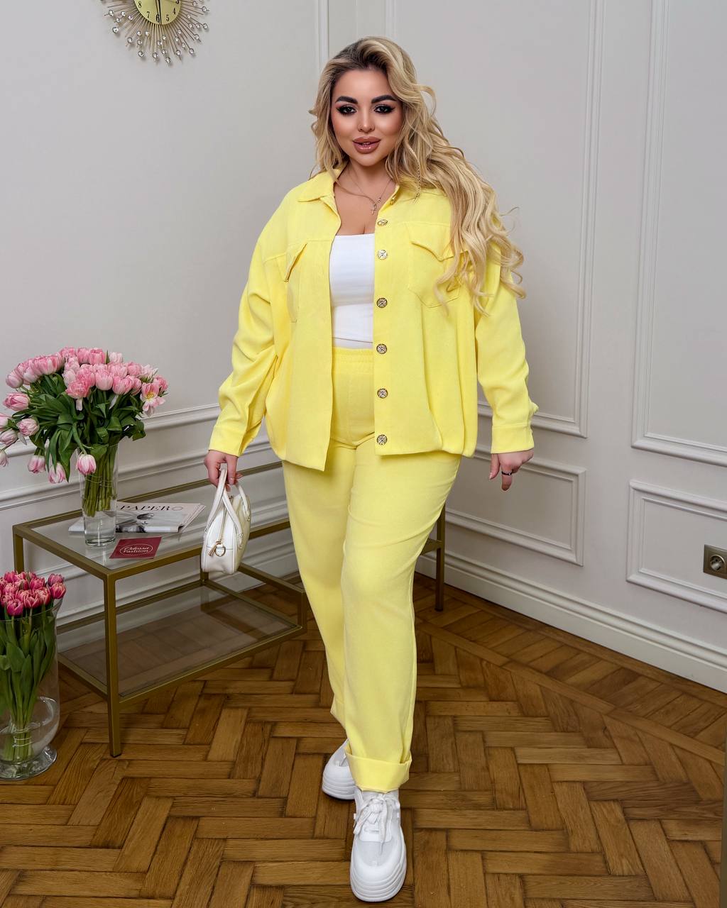 Костюм состоит из рубашки-жакета на пуговицах и удобных брюк с высокой посадкой.