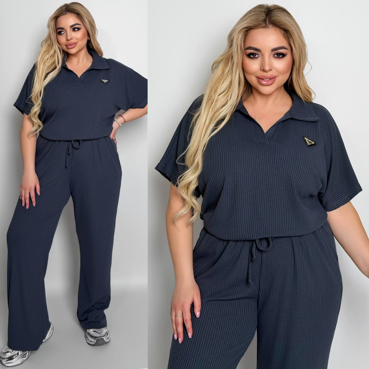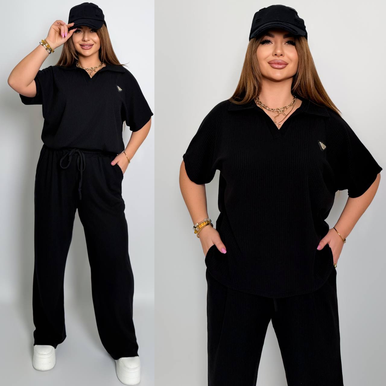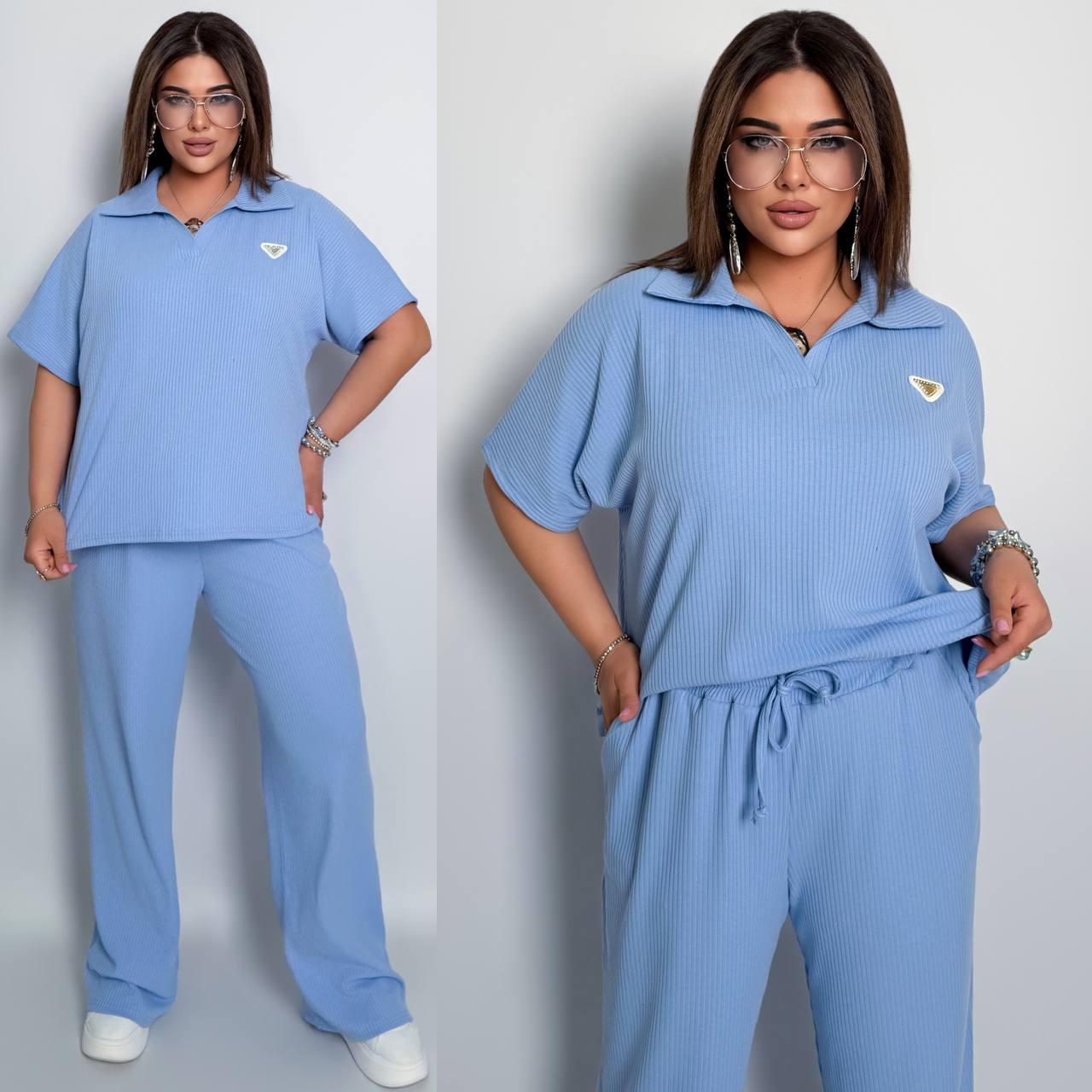 Стильный комфортный костюм “barcelona” из трикотажа рубчик хб стрейч: футболка в стиле поло оверсайз, штаны прямые расширены с высокой посадкой с карманами в боковых швах, с кулиской на поясе