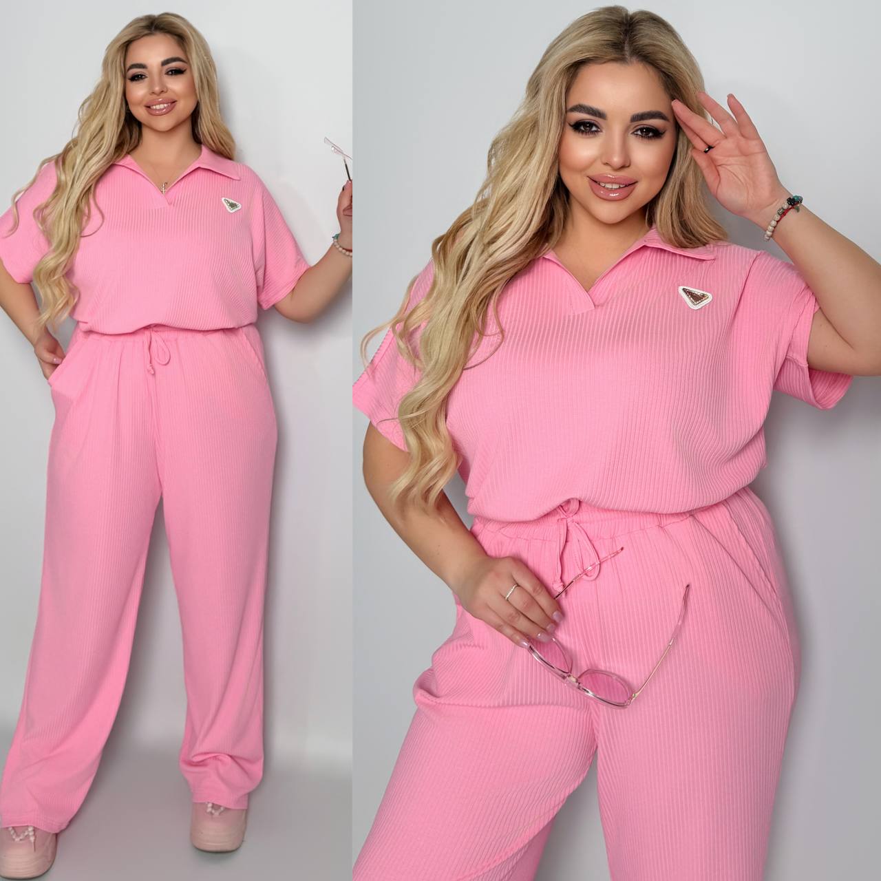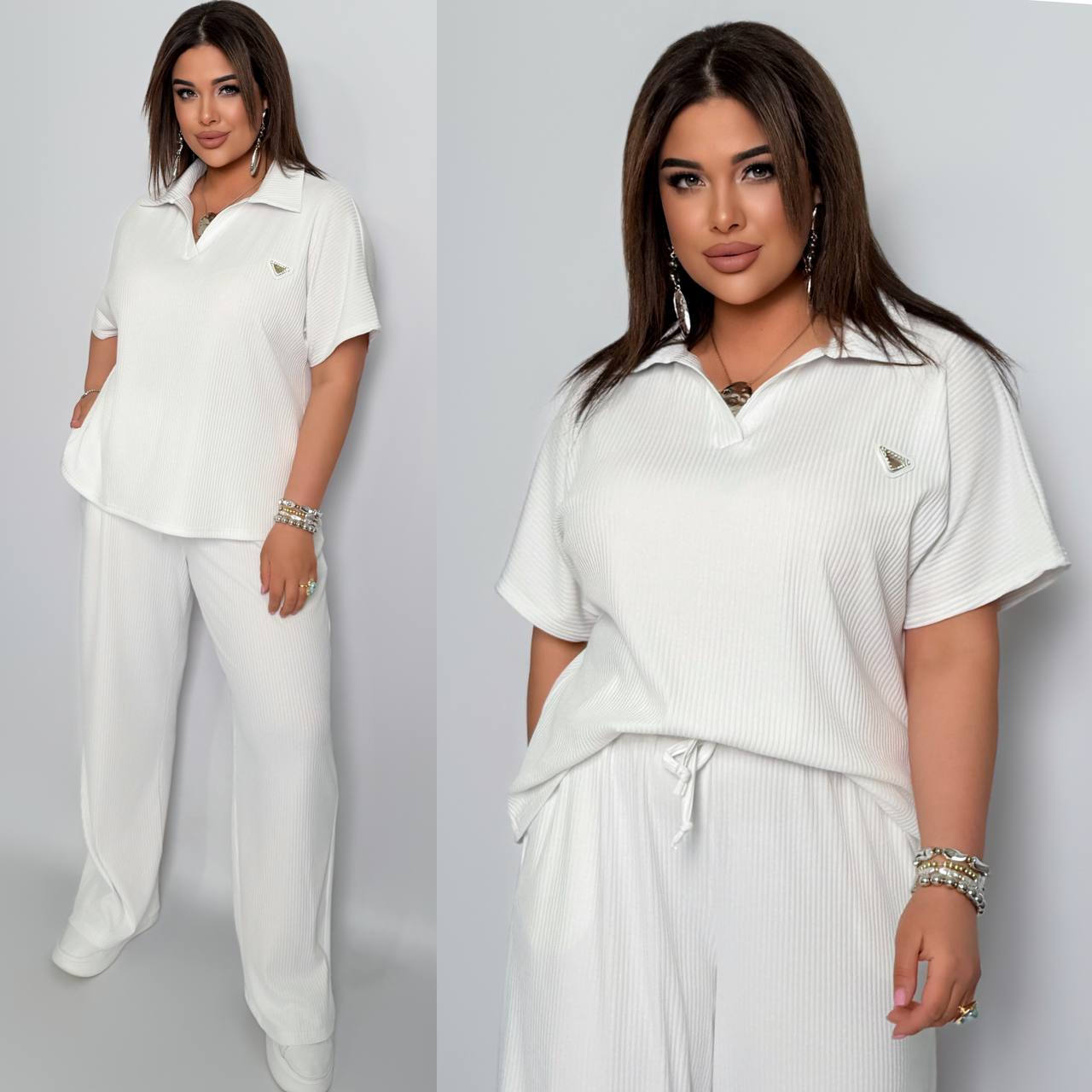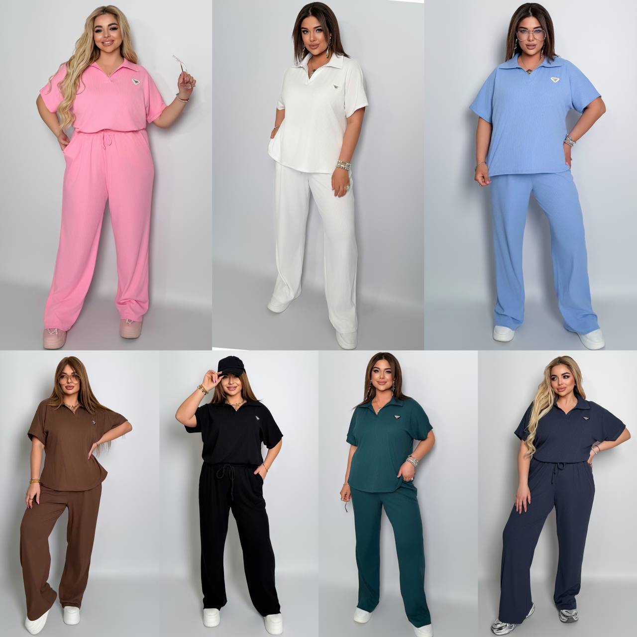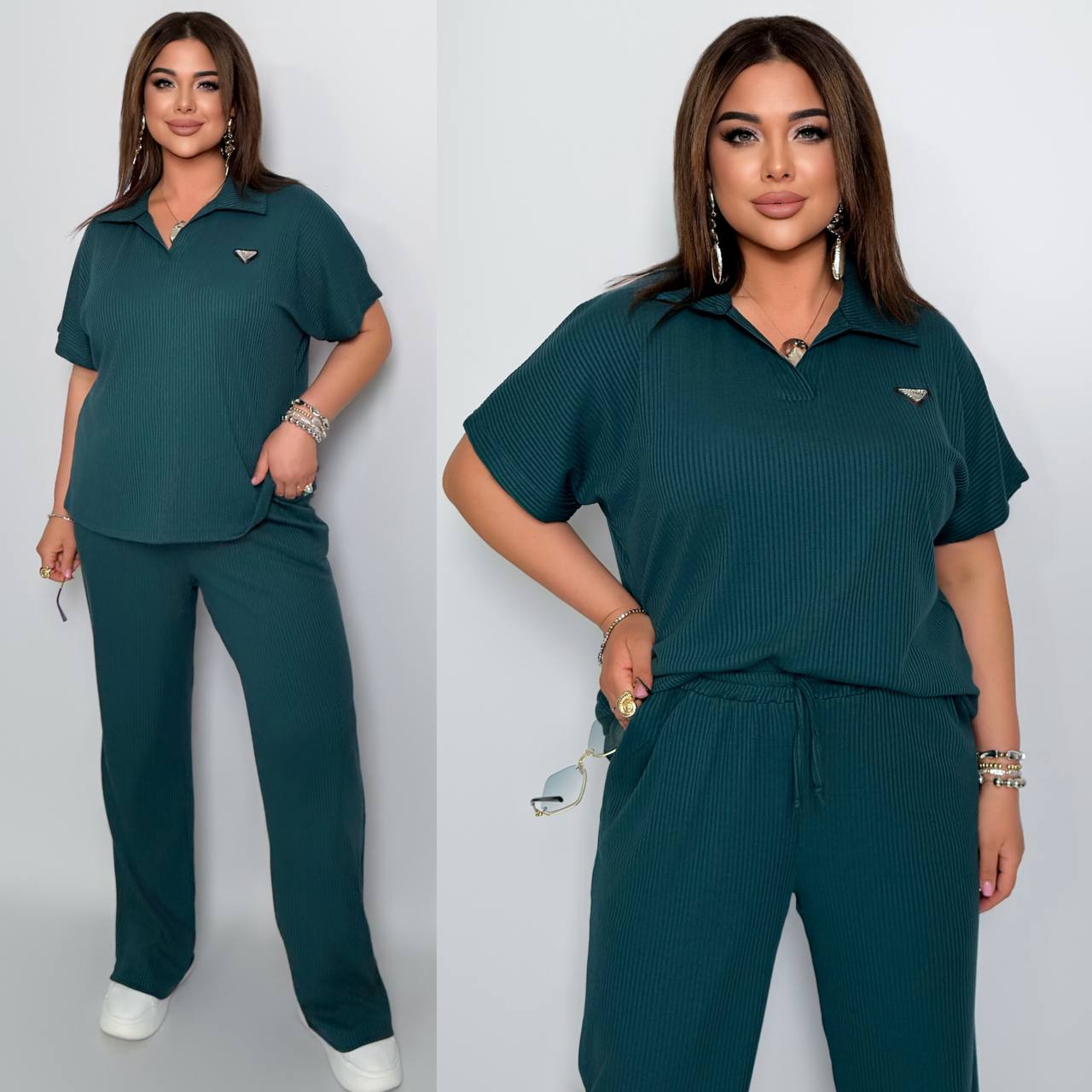 Стильный комфортный костюм “barcelona” из трикотажа рубчик хб стрейч: футболка в стиле поло оверсайз, штаны прямые расширены с высокой посадкой с карманами в боковых швах, с кулиской на поясе