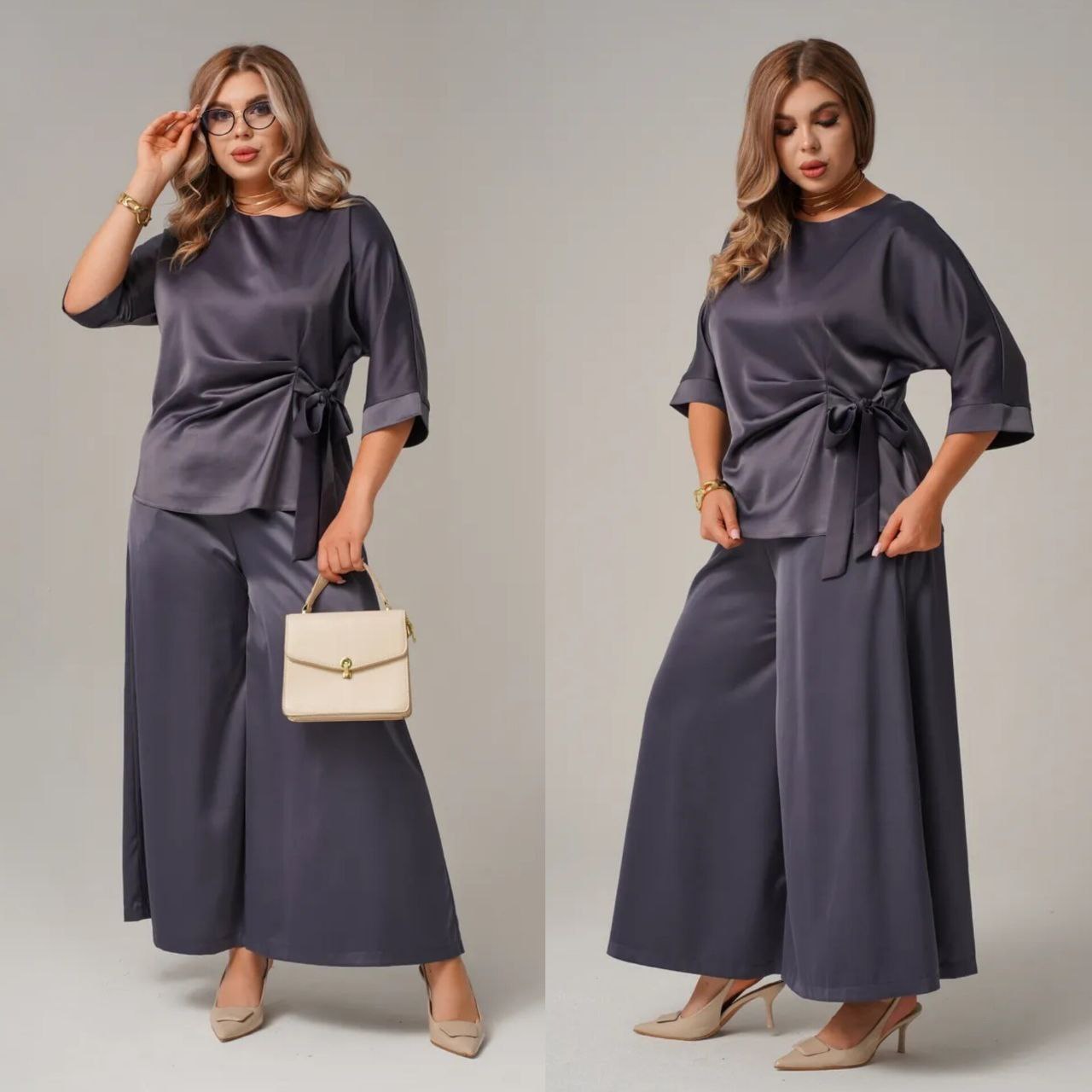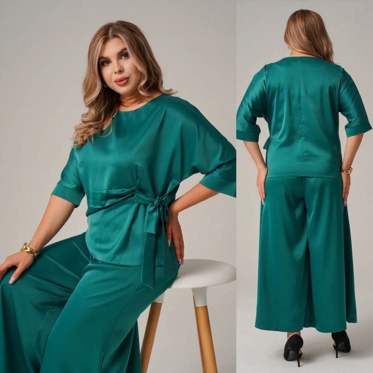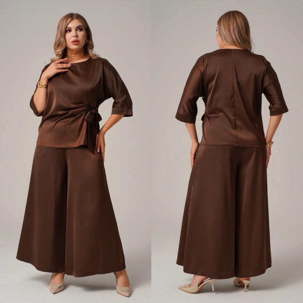 Комфортный, универсальный и очень эффектный костюм как для повседневного образа, так и для особых событий. блуза с асимметричной завязкой формирует красивый силуэт, а широкие брюки создают эффект вытянутой фигуры, пояс на резинке. ткань мягко ложится по фигуре, выглядит дорого и комфортно в ношении.