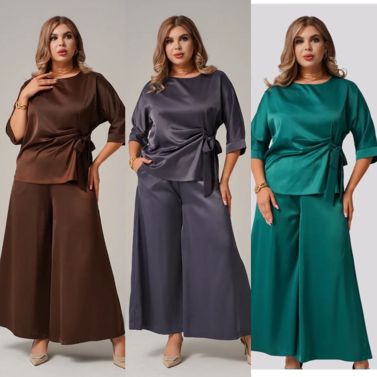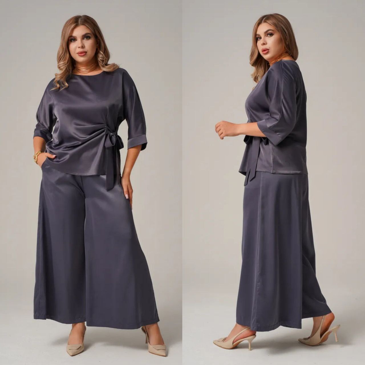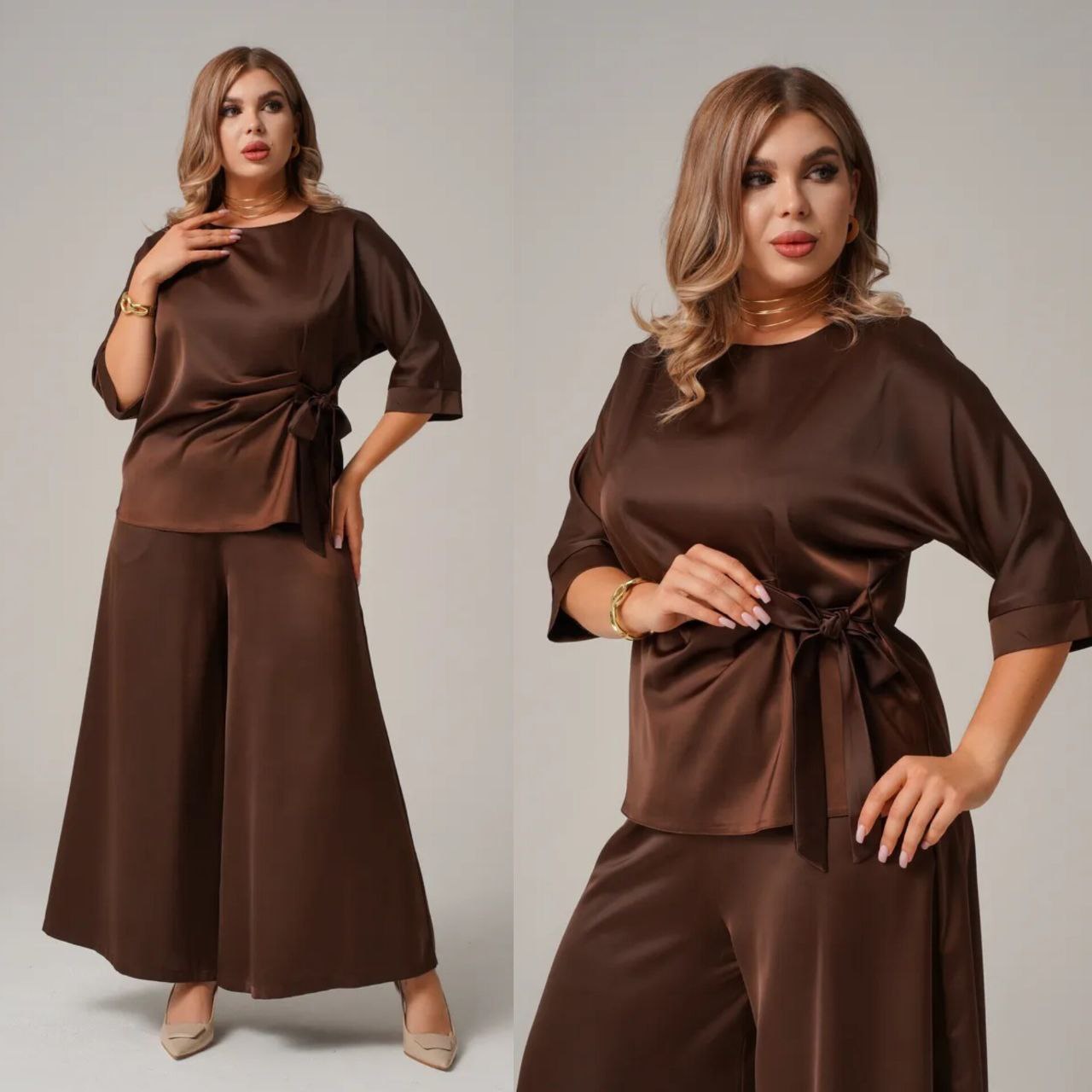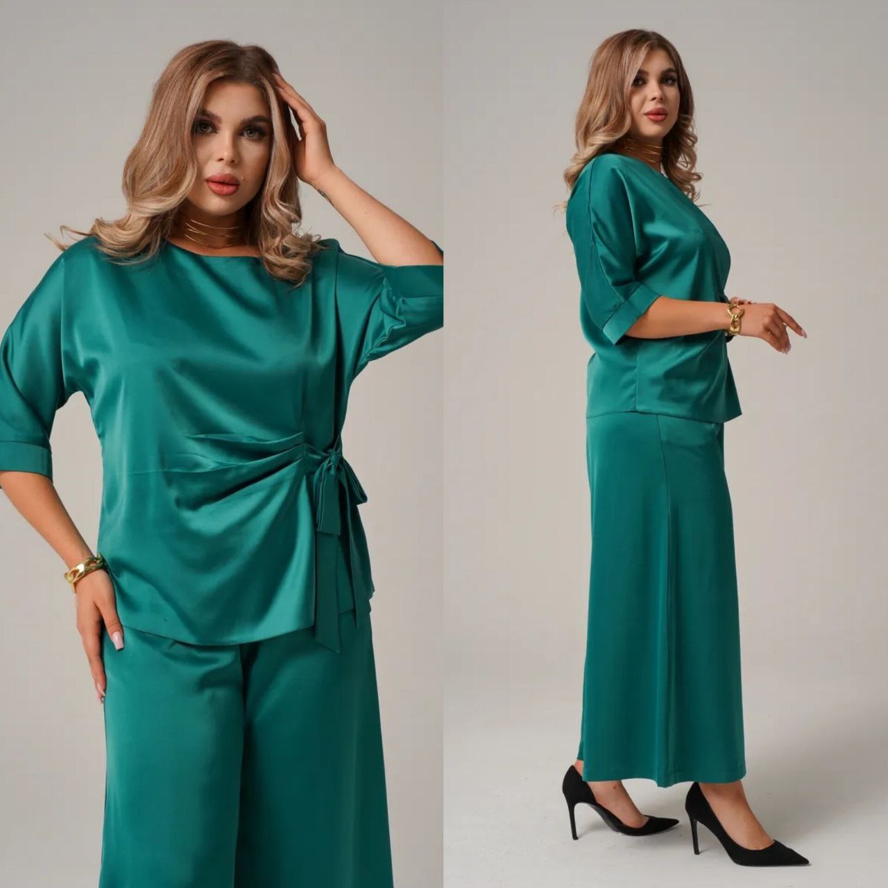 Комфортный, универсальный и очень эффектный костюм как для повседневного образа, так и для особых событий. блуза с асимметричной завязкой формирует красивый силуэт, а широкие брюки создают эффект вытянутой фигуры, пояс на резинке. ткань мягко ложится по фигуре, выглядит дорого и комфортно в ношении.