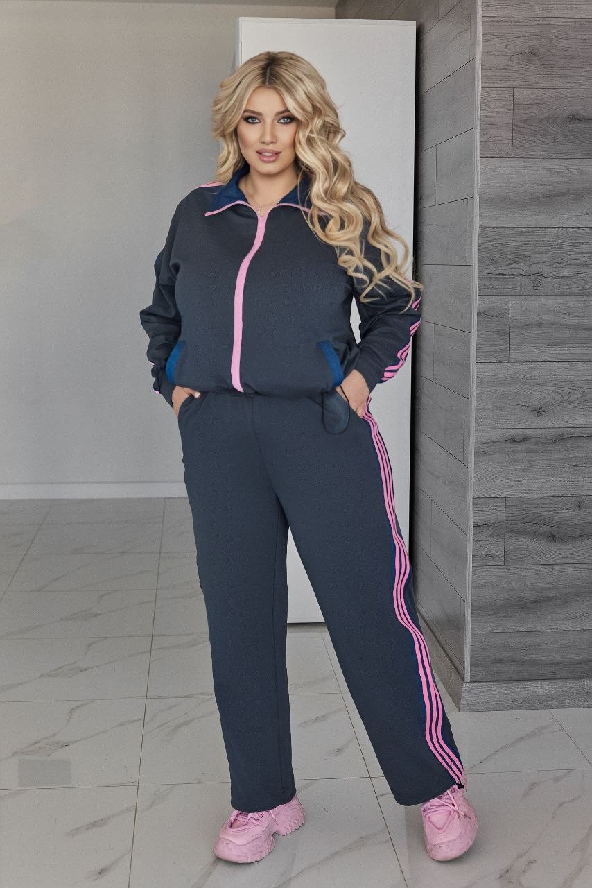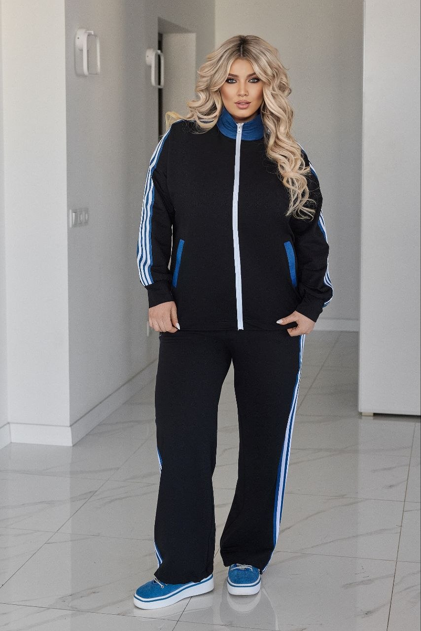 Стильный костюм в спортивном стиле с акцентом на современные детали.
