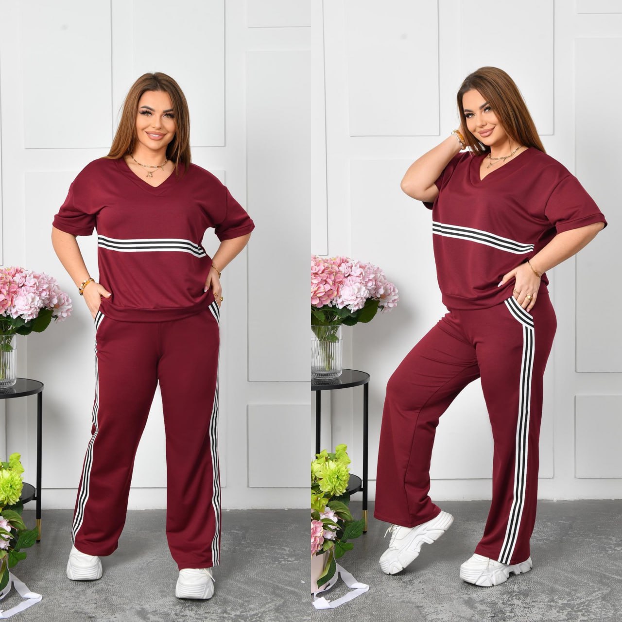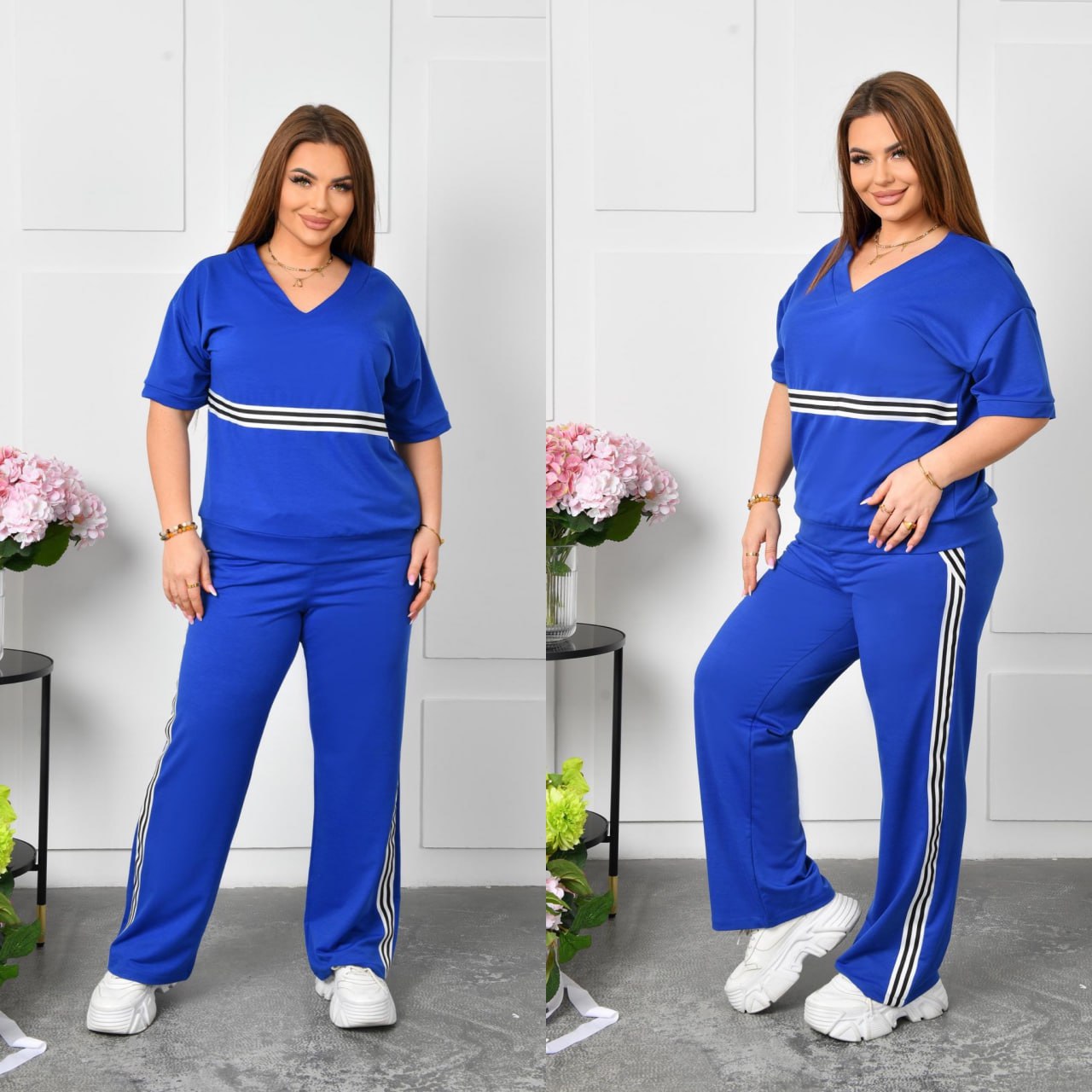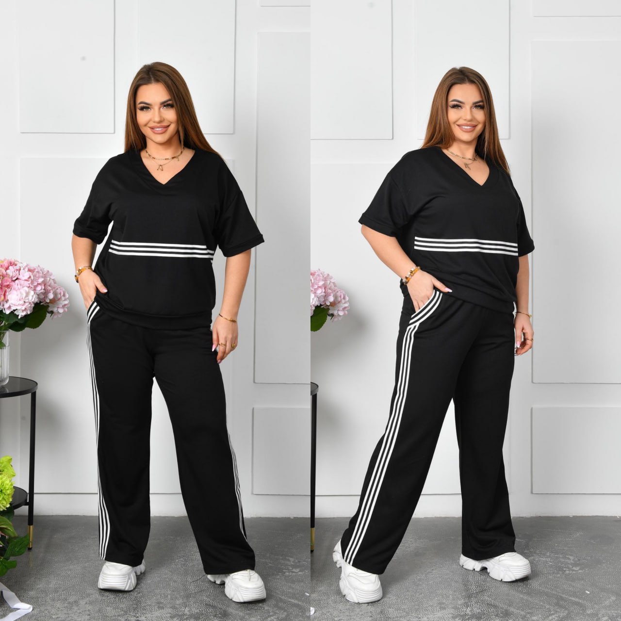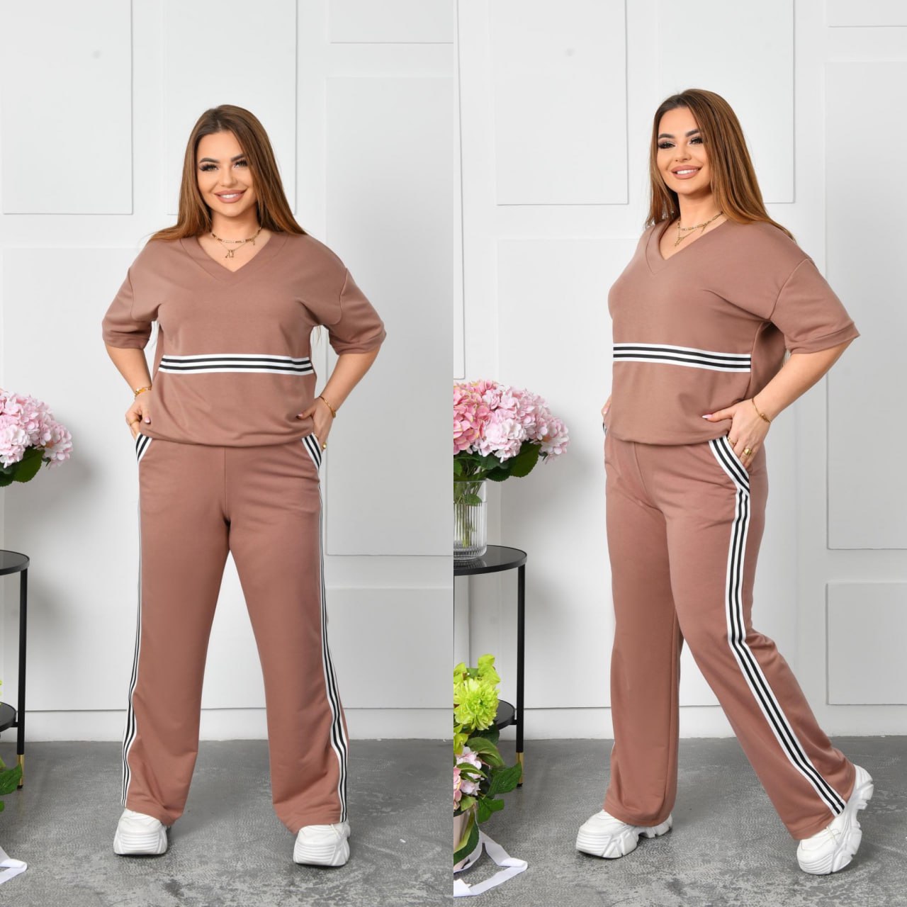 Стильный повседневный костюм, который идеально подходит для комфортных прогулок и повседневной носки, изготовлен из качественного трикотажа двунитки со средней растяжимостью. такая ткань обеспечивает оптимальное сочетание эластичности и удобства, что позволяет чувствовать себя комфортно в течение всего дня.