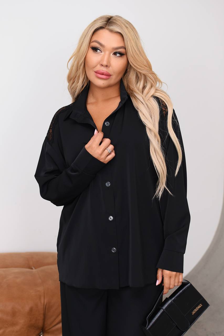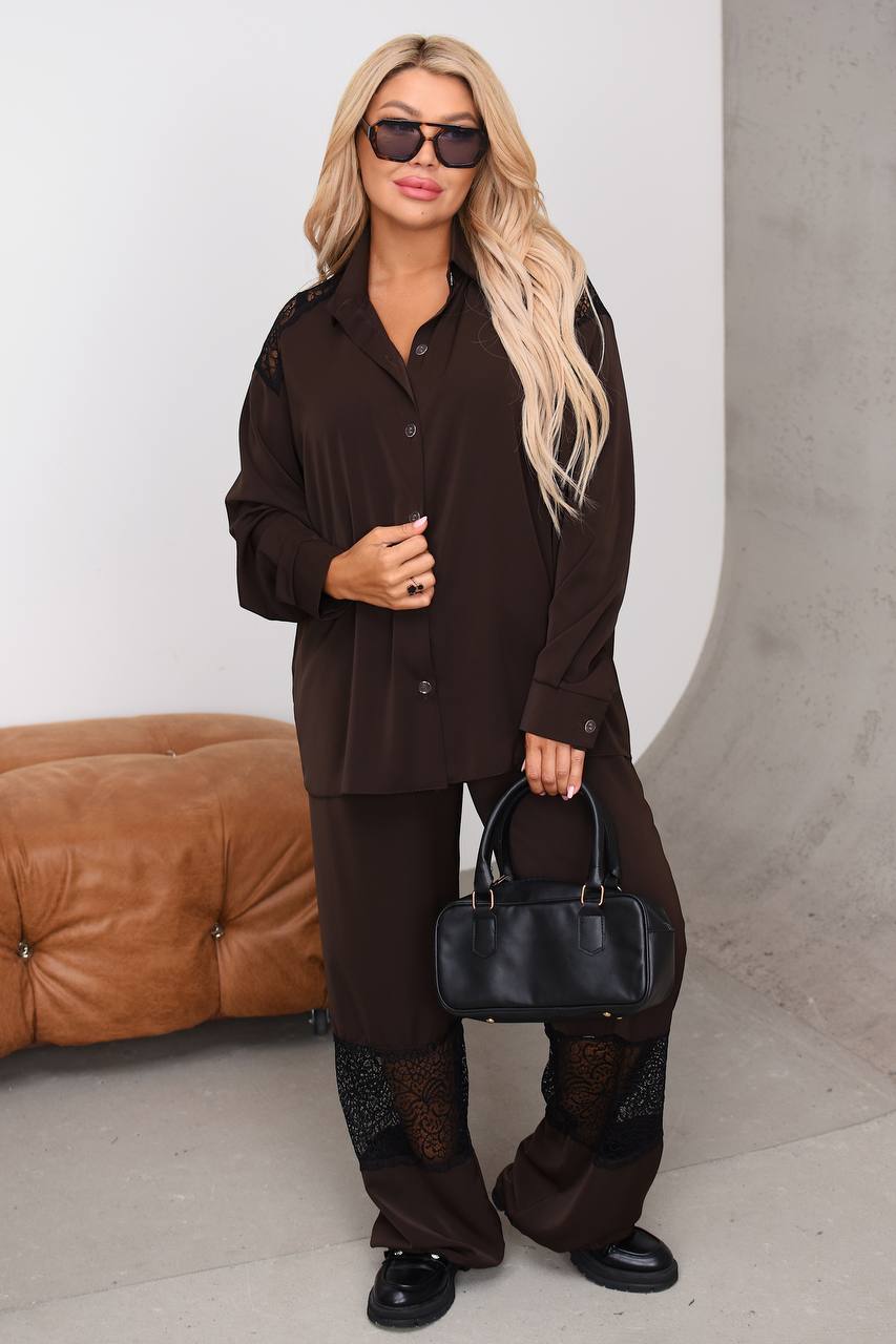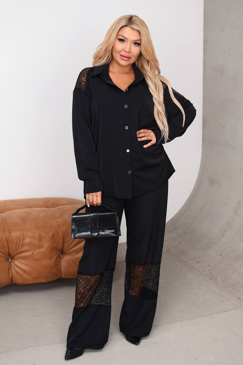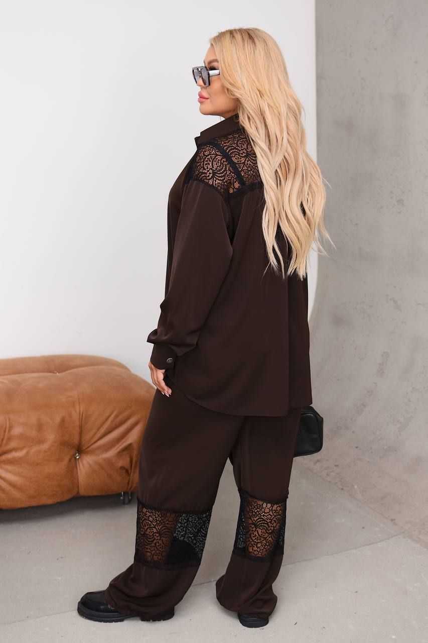 Рубашка на пуговицах, воротник стойкая, по спинке вставка дорогое кружево. штаны палаццо талия на резинке, низ финкаторы с помощью которых можно регулировать ширину, вставки кружево.