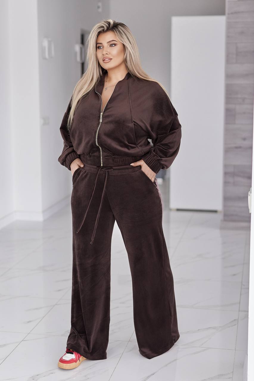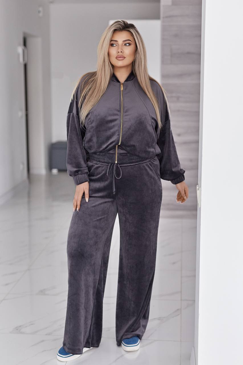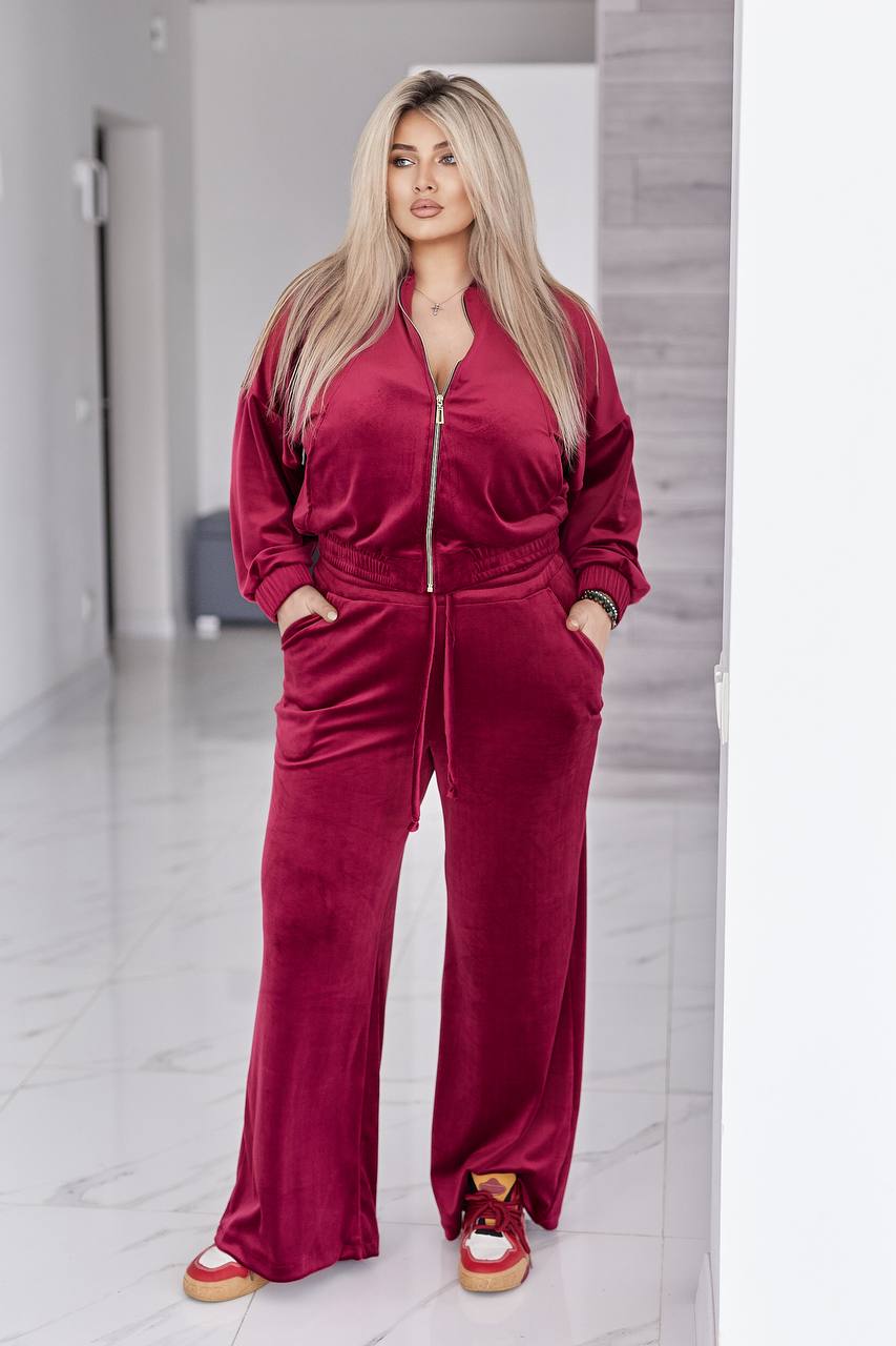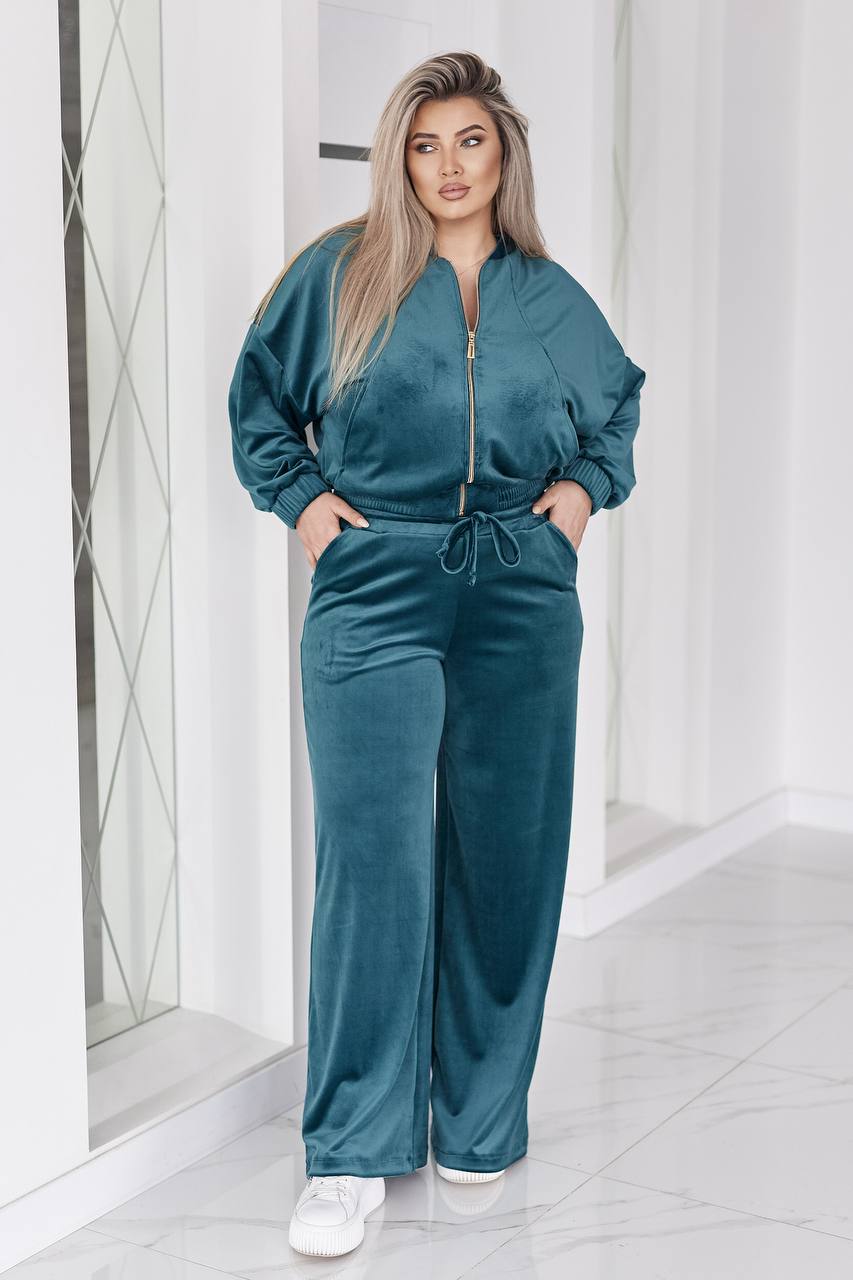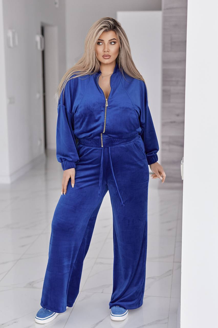 Велюровый бархатный костюм состоит из кофты и брюк. кофта свободного кроя oversize, с застежкой молнией и стойкой воротником. в рельефных швах спереди есть карманы. рукав со спущенной линией плеча, манжеты на рукавах и низ кофты на широкой эластичной резинке.
