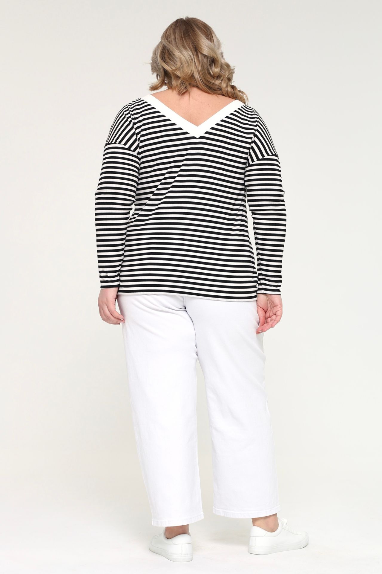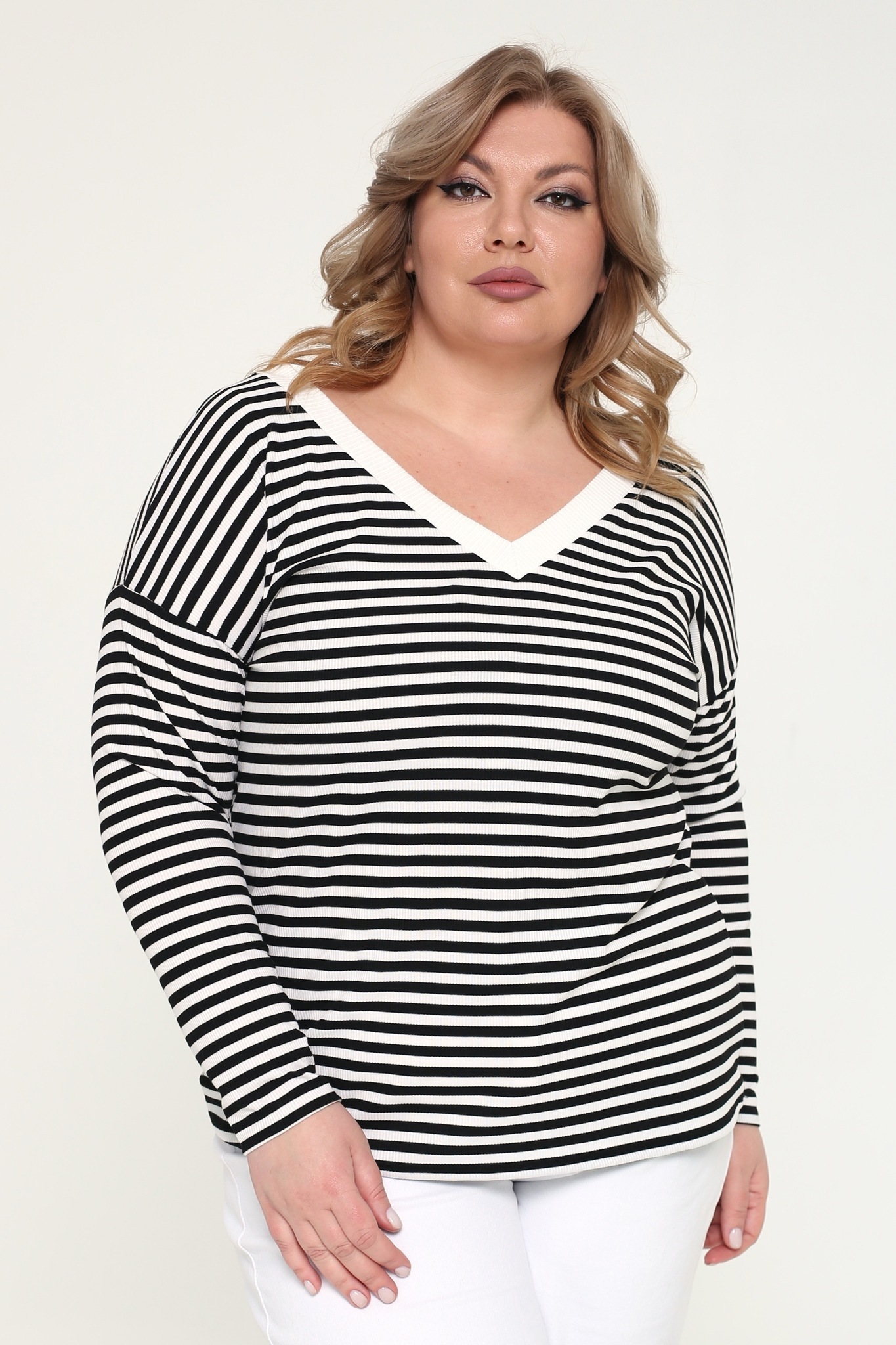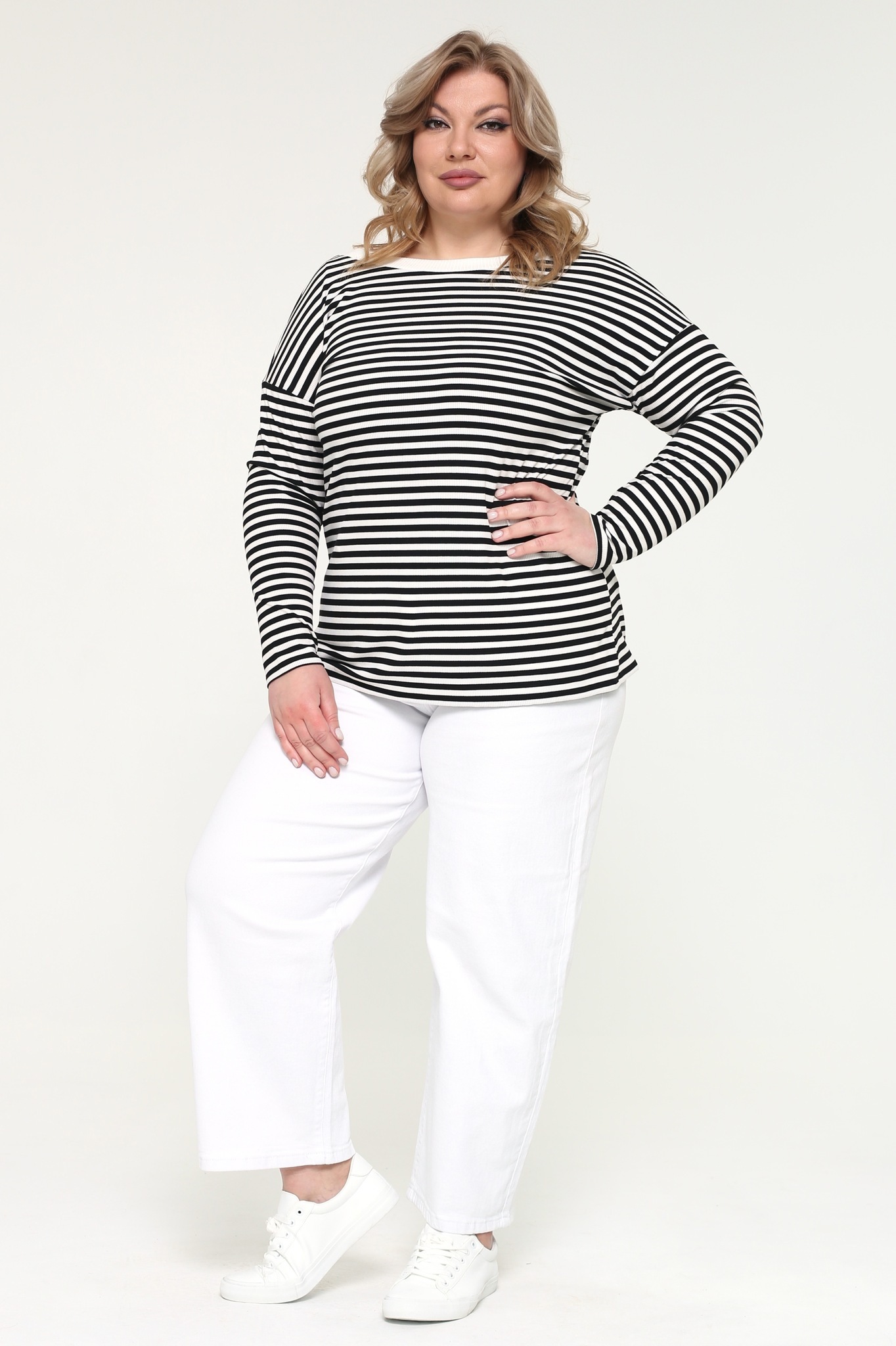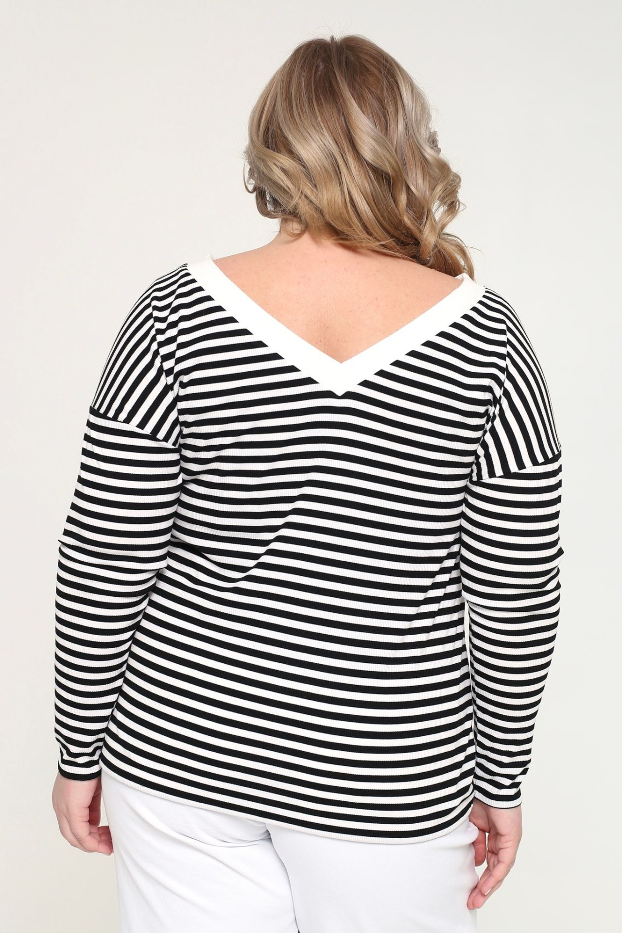 Стильный лонгслив из мягкого трикотажа отличается женственным круглым вырезом, украшенным узким однотонным кантом. рукава длиной 3/4 слегка приспущены. полосатый принт придает модели динамичность. вытачки на груди обеспечивают идеальную посадку. материал приятен к телу, хорошо облегает фигуру и подчеркивает её достоинства. лонгслив прекрасно сочетается с юбками разной длины, брюками и джинсами.