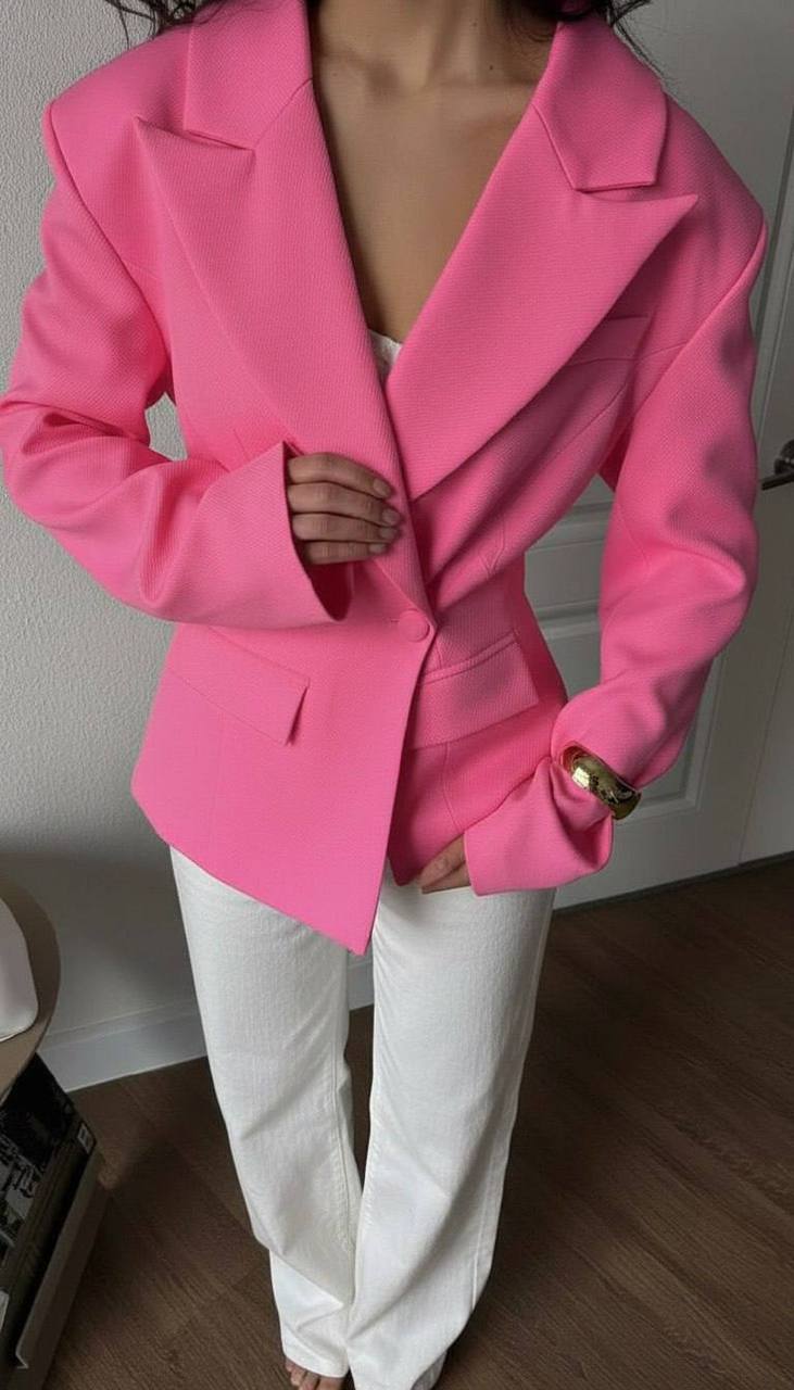 приталенный пиджак с широкими лацканами и акцентными плечами — стильный вариант на каждый день и на выход.