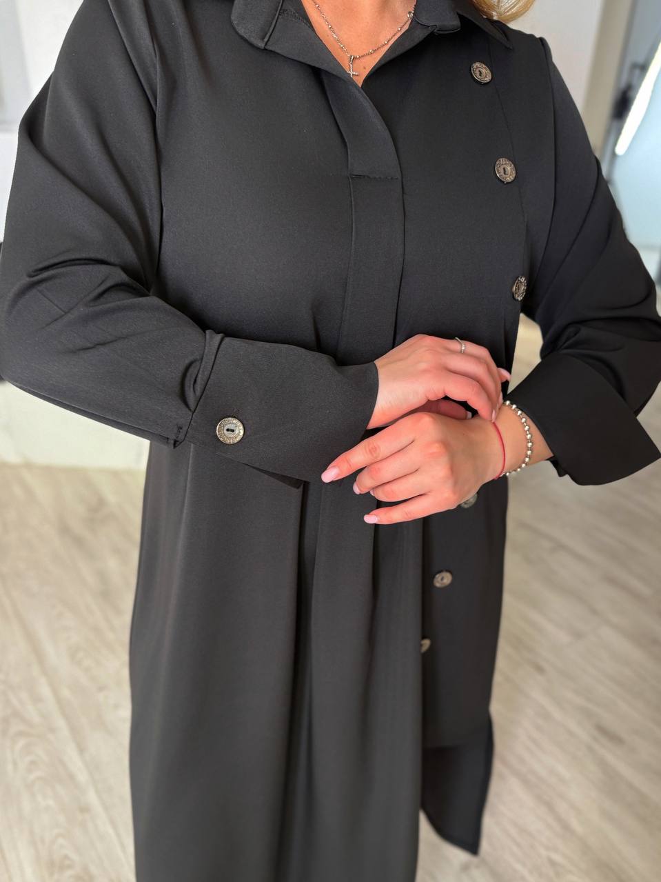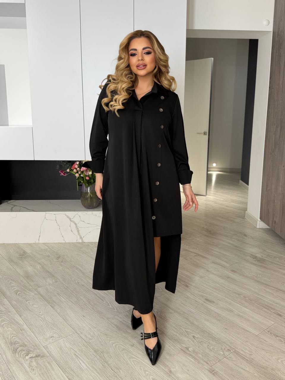 Платье свободного кроя с интересными элементами: со стороны разрез на одну ножку + планка с пуговицами, такое сочетание делает удлиненным силуэт и привлекает внимание. на спинке есть декоративная пуговица со складкой. впереди также складка, которая прекрасно скрывает лишние объемы. воротник, как на рубашках, на рукавах широкие манжеты на пуговицах (застегиваются, как запонки).