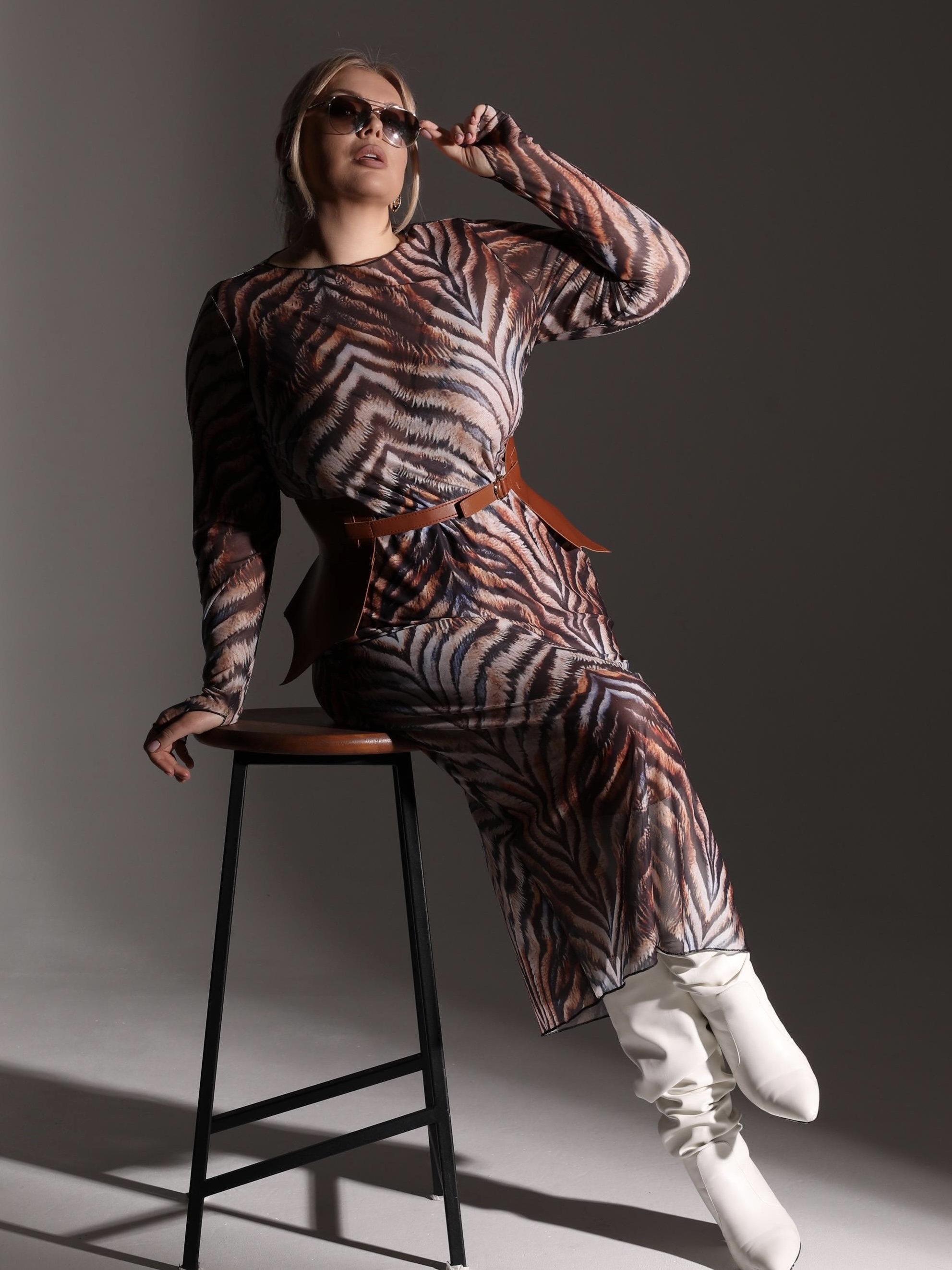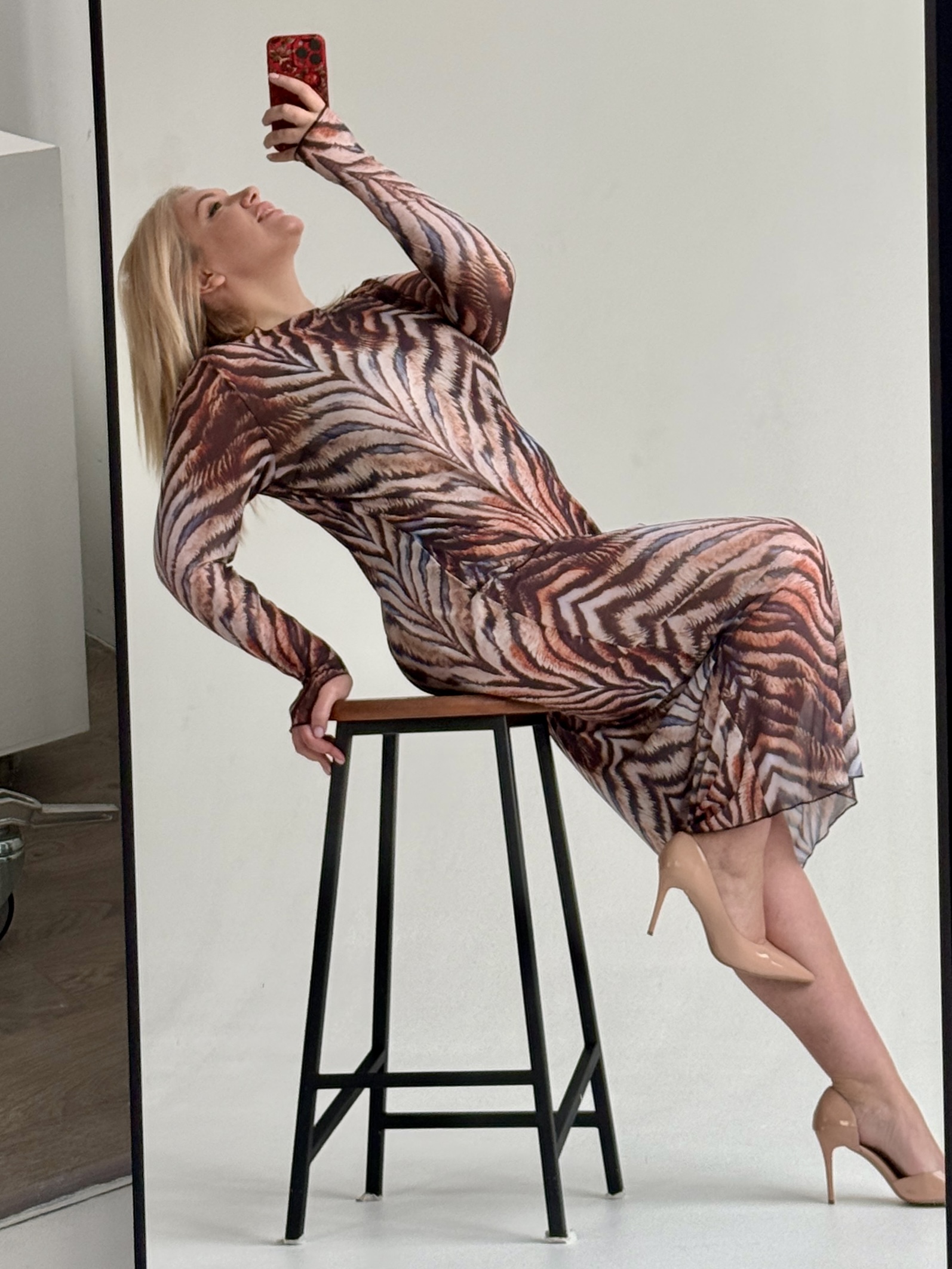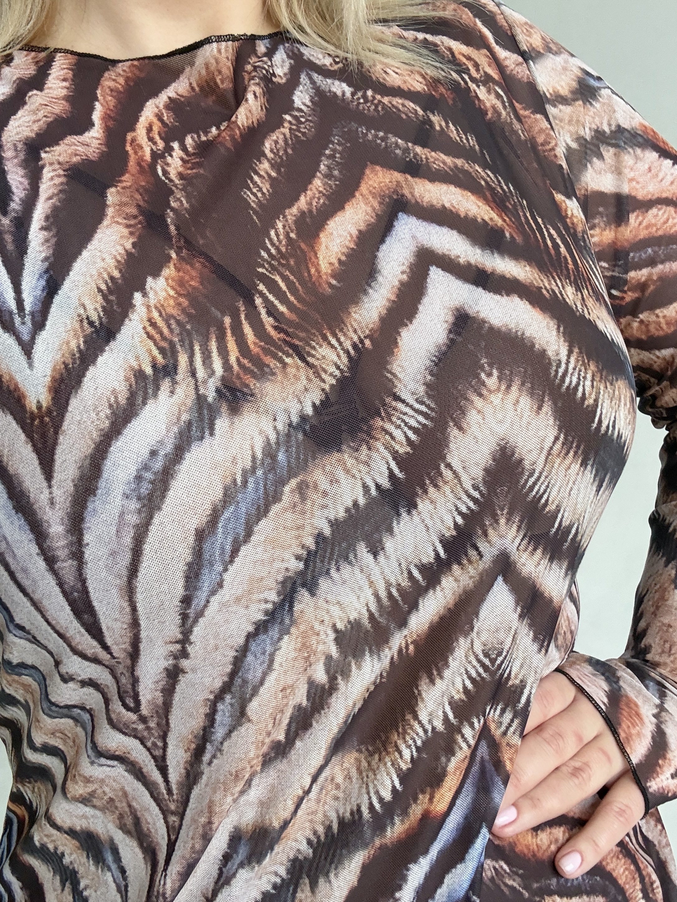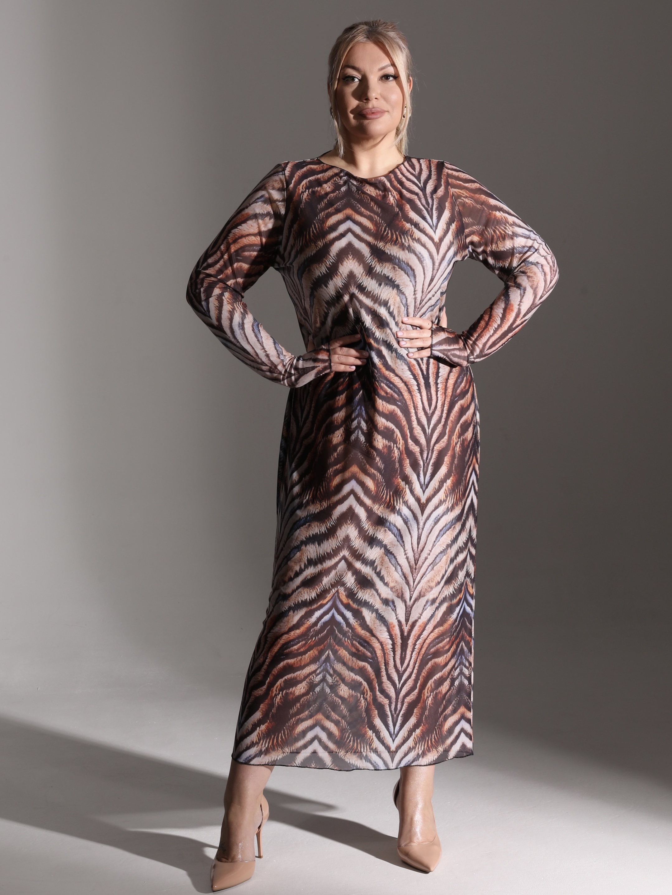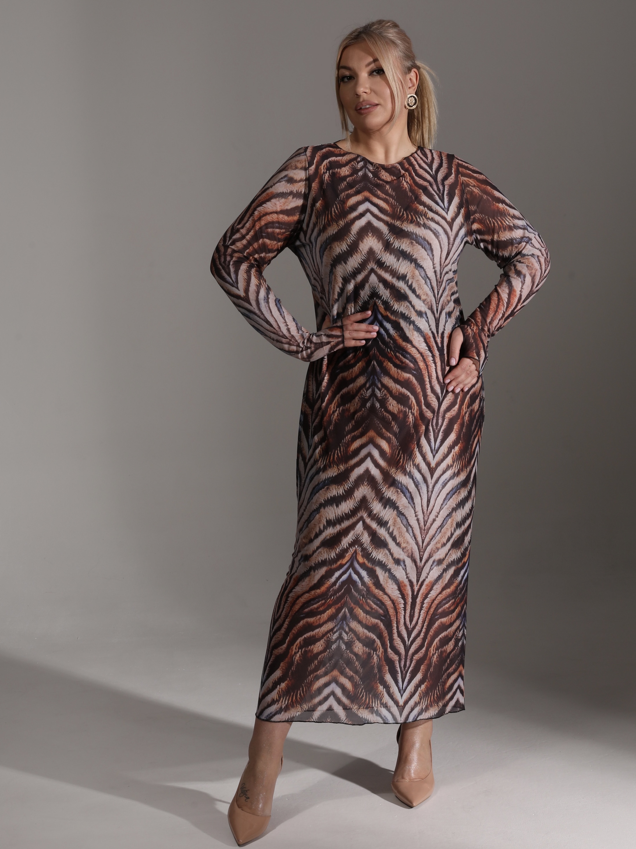 Платье миди прямого кроя из мягкого фатина имеет круглый вырез и удлиненные рукава с вырезом для пальцев, что добавляет дополнительный комфорт. обтягивающий крой и уникальный фасон делают его стильным выбором, подчеркивая фигуру. базовая модель сочетается со всеми элементами гардероба. материал с добавлением эластичных волокон хорошо тянется, тем самым не сковывает движений. актуальный принт добавляет динамичности. мягкий, приятный телу материал подарит комфорт на весь день, тонкая сетчатая ткань придает модели особую выразительность: играет со светом, создает эффект невесомости. сочетайте модель с минималистичными аксессуарами — и получите по-настоящему трендовый и современный лук на праздник.