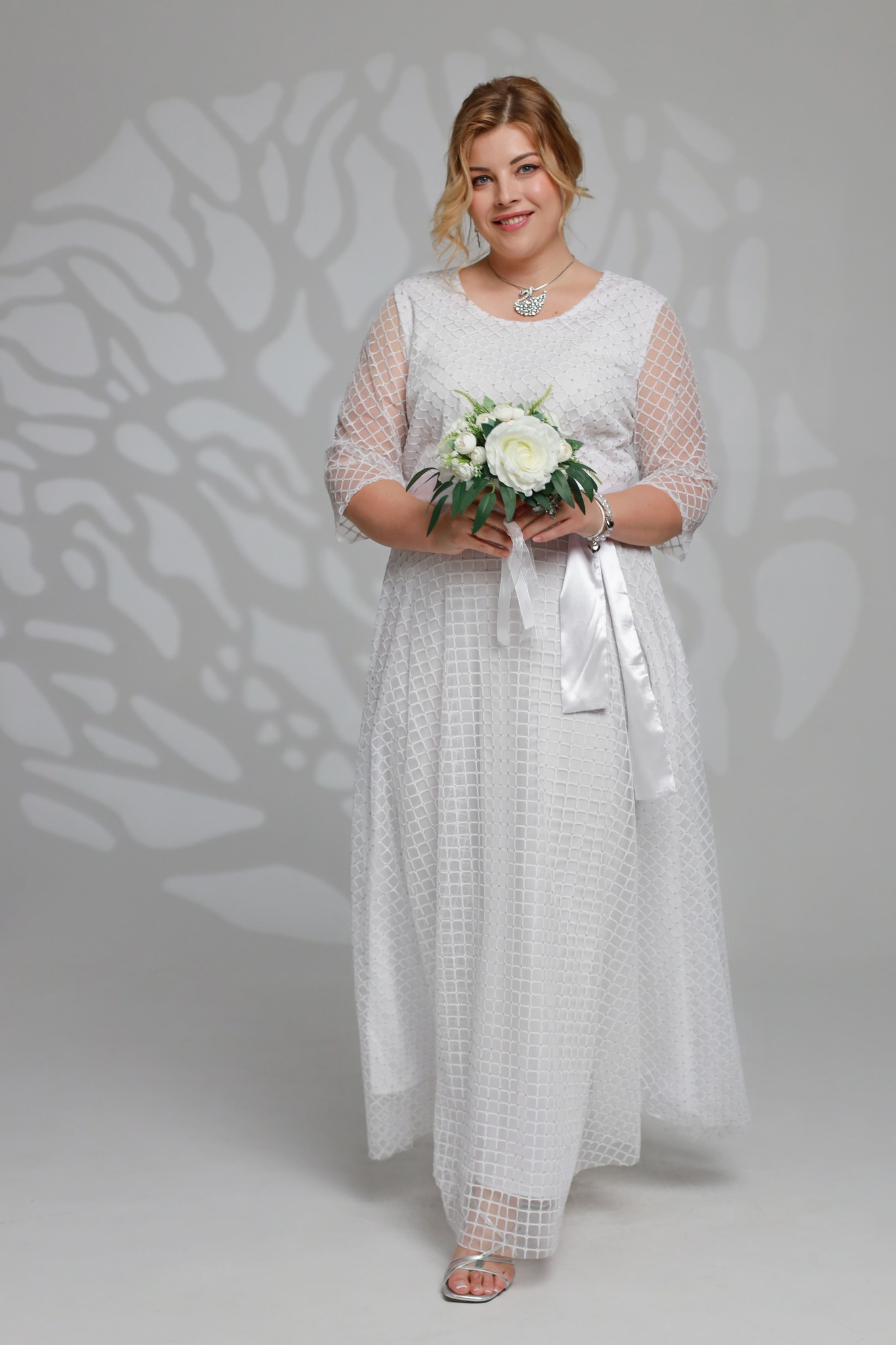 Платье длинное круглый вырез "ромбики" двойное белое