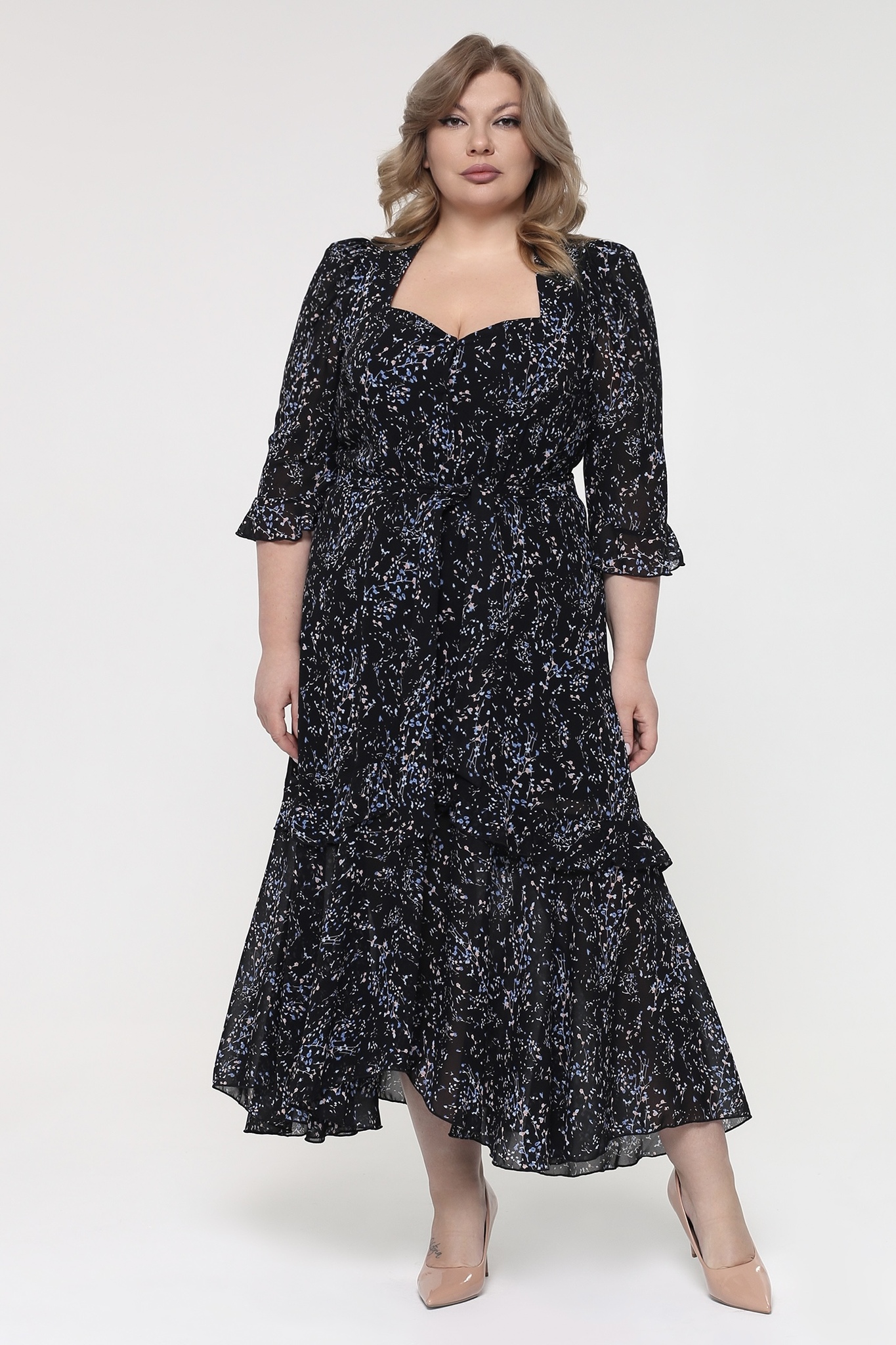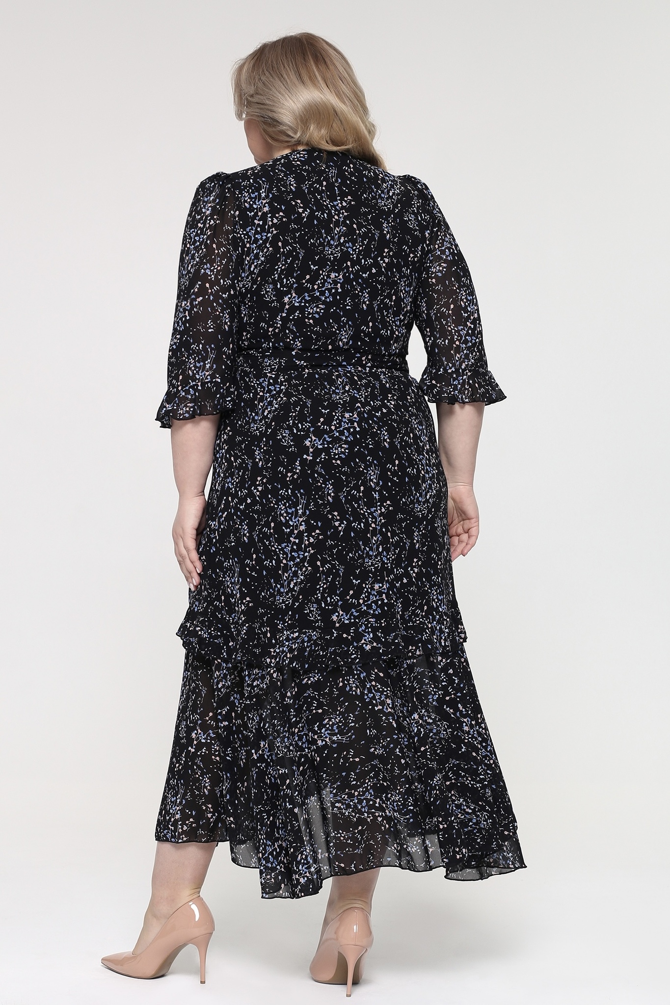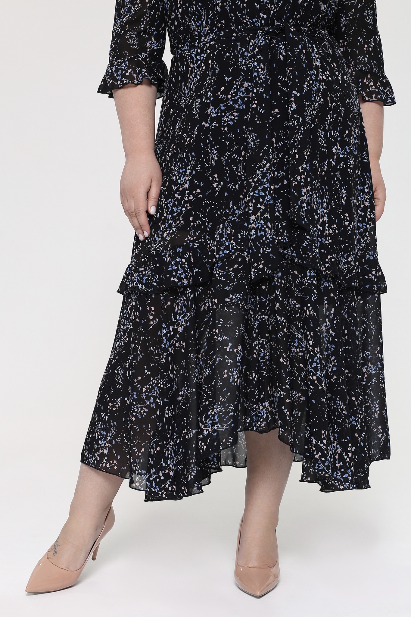 Нежное платье из шифона на эластичной основе. его изящный вырез на груди плавно переходит в планку с пуговицами, добавляя образу утонченности. рукава длиной три четверти украшены оборкой, гармонично сочетающейся с основным цветом. благодаря швам на спине и вытачкам на груди, платье идеально садится по фигуре. юбка, расклешенная от бедра и декорированная воланом, создает женственный силуэт. эффектный растительный узор оживляет наряд, придавая ему динамичность. пояс в тон подчеркивает талию. это платье подходит как для ежедневного ношения, так и для особых мероприятий. яркий клатч и туфли на каблуке станут отличным дополнением к образу.