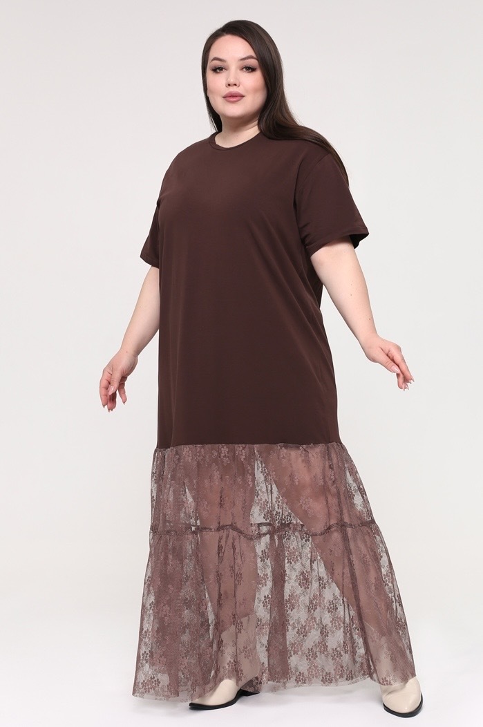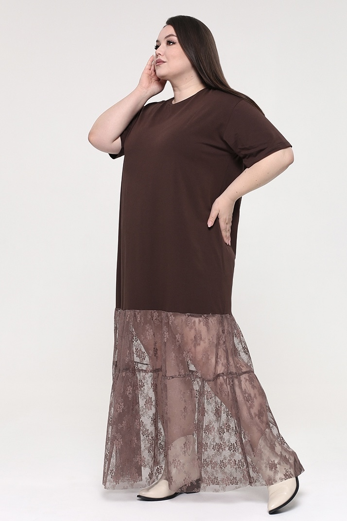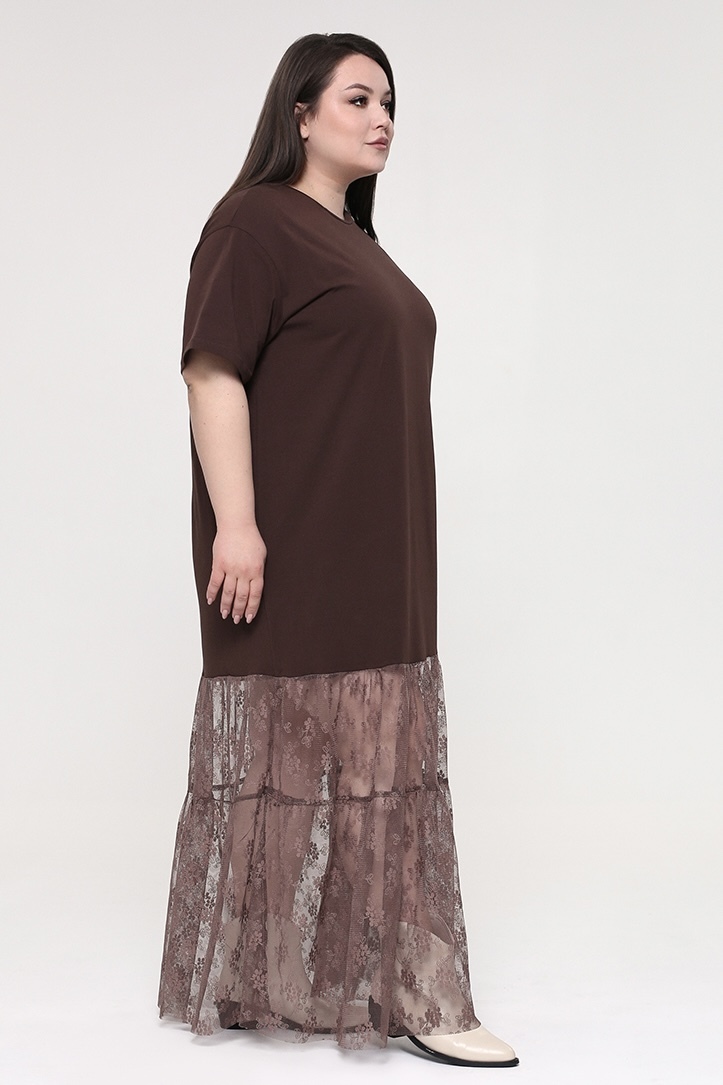 Платье однотонное с гипюровой юбкой в цветочный узор шоколад