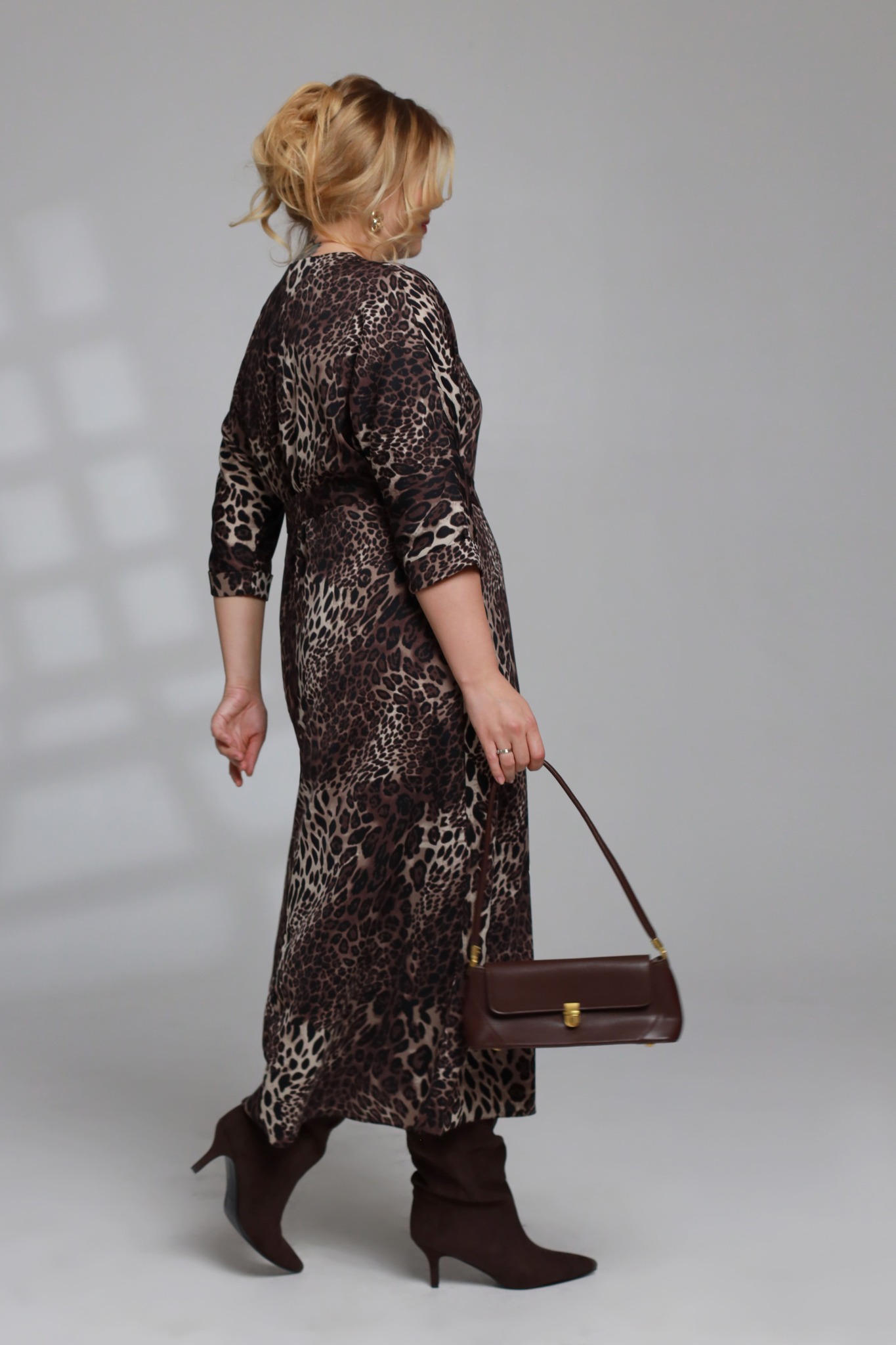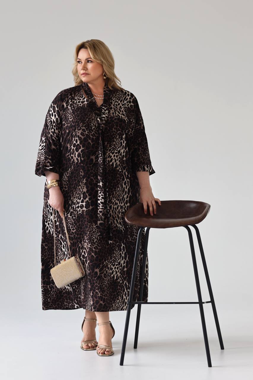 Платье v-вырез с завязкой на вороте "мелкий леопард" коричневое