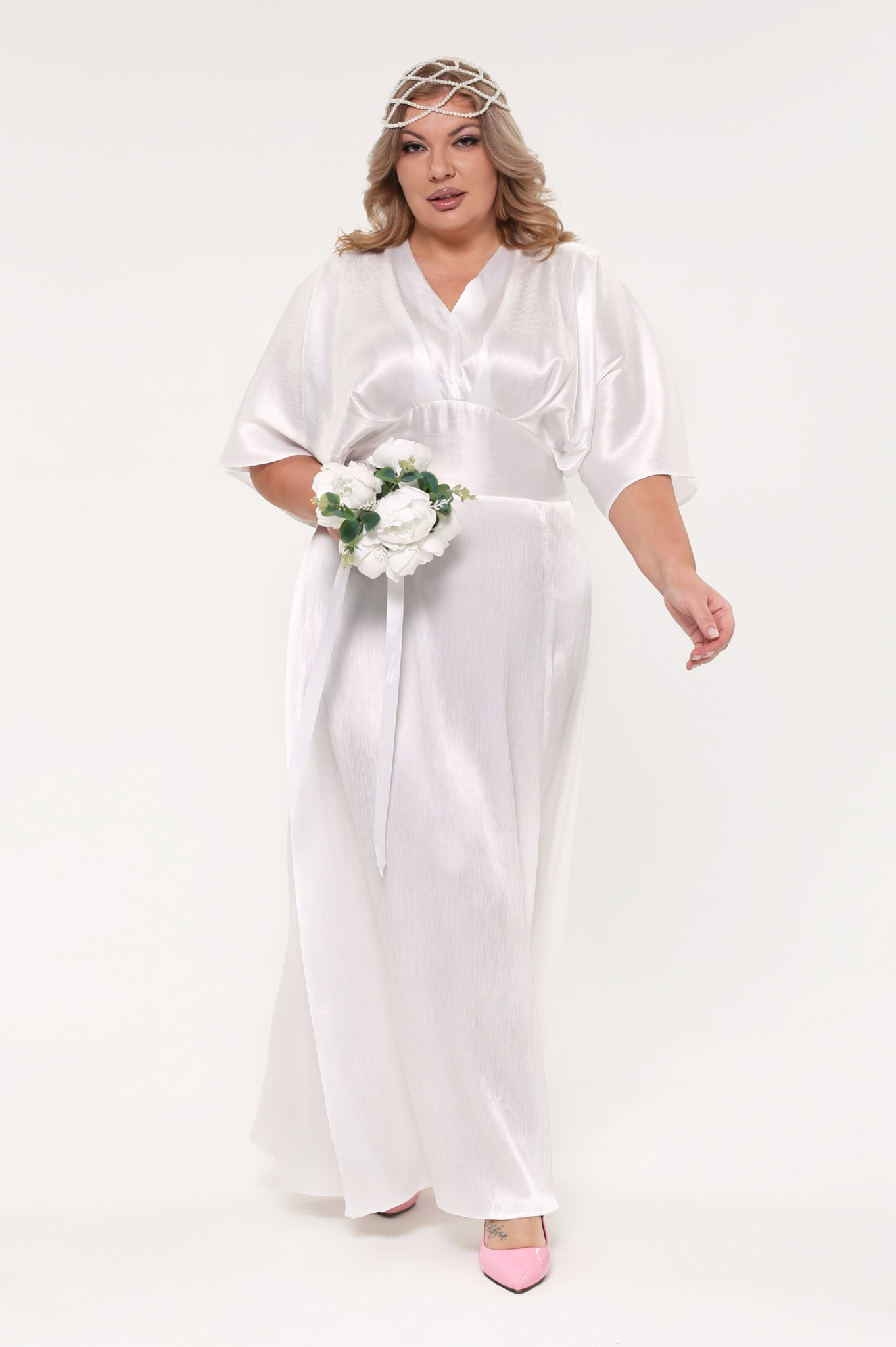 Платье шелковое v-вырез со сборкой под грудью с разрезом белое свадебное