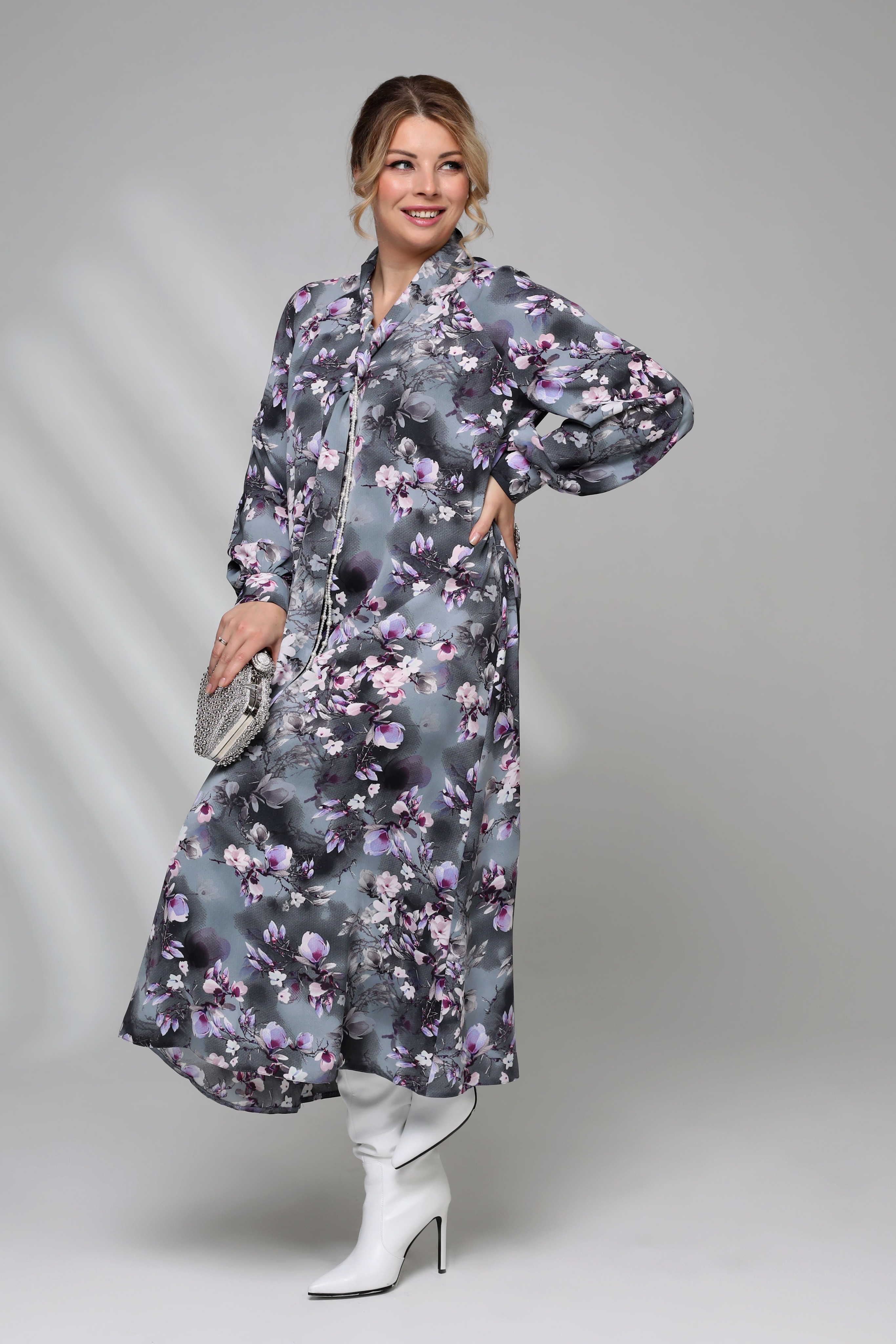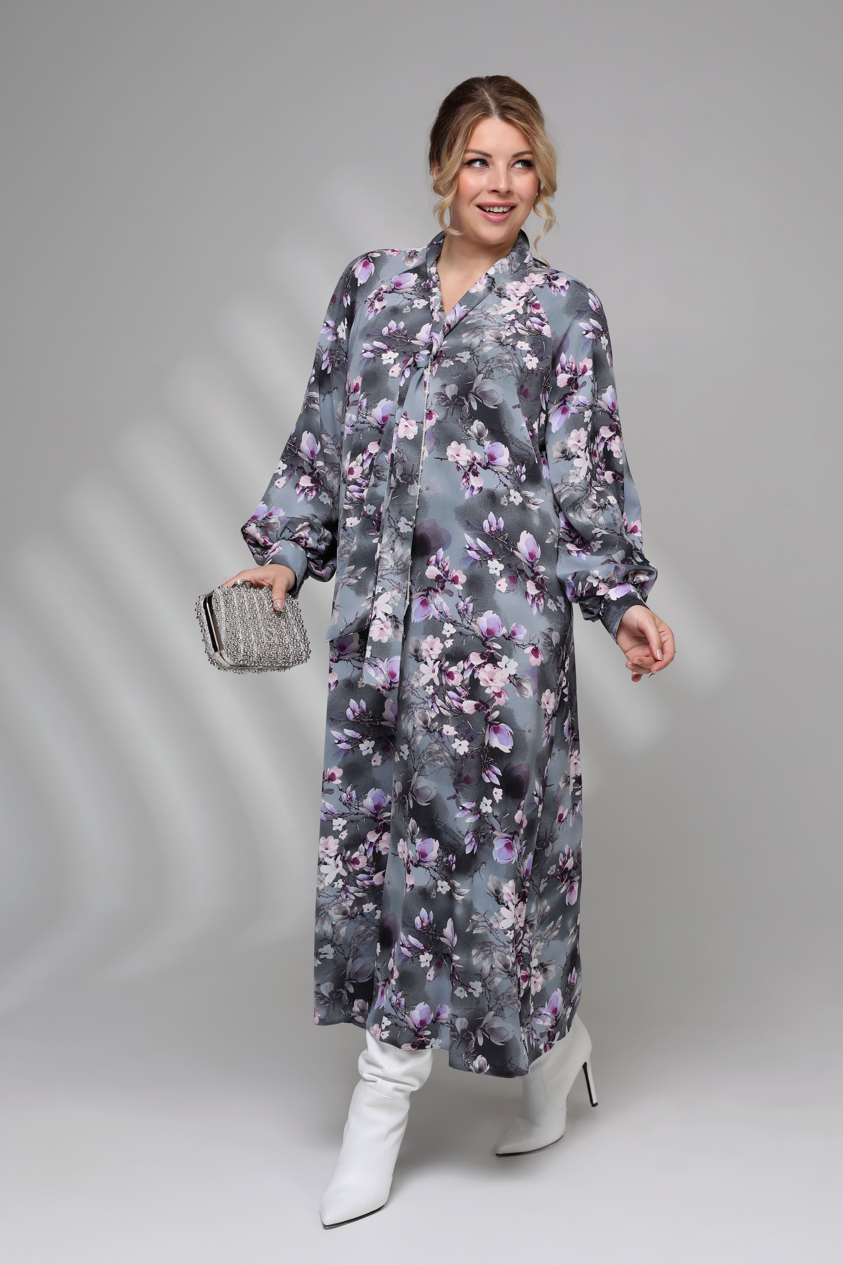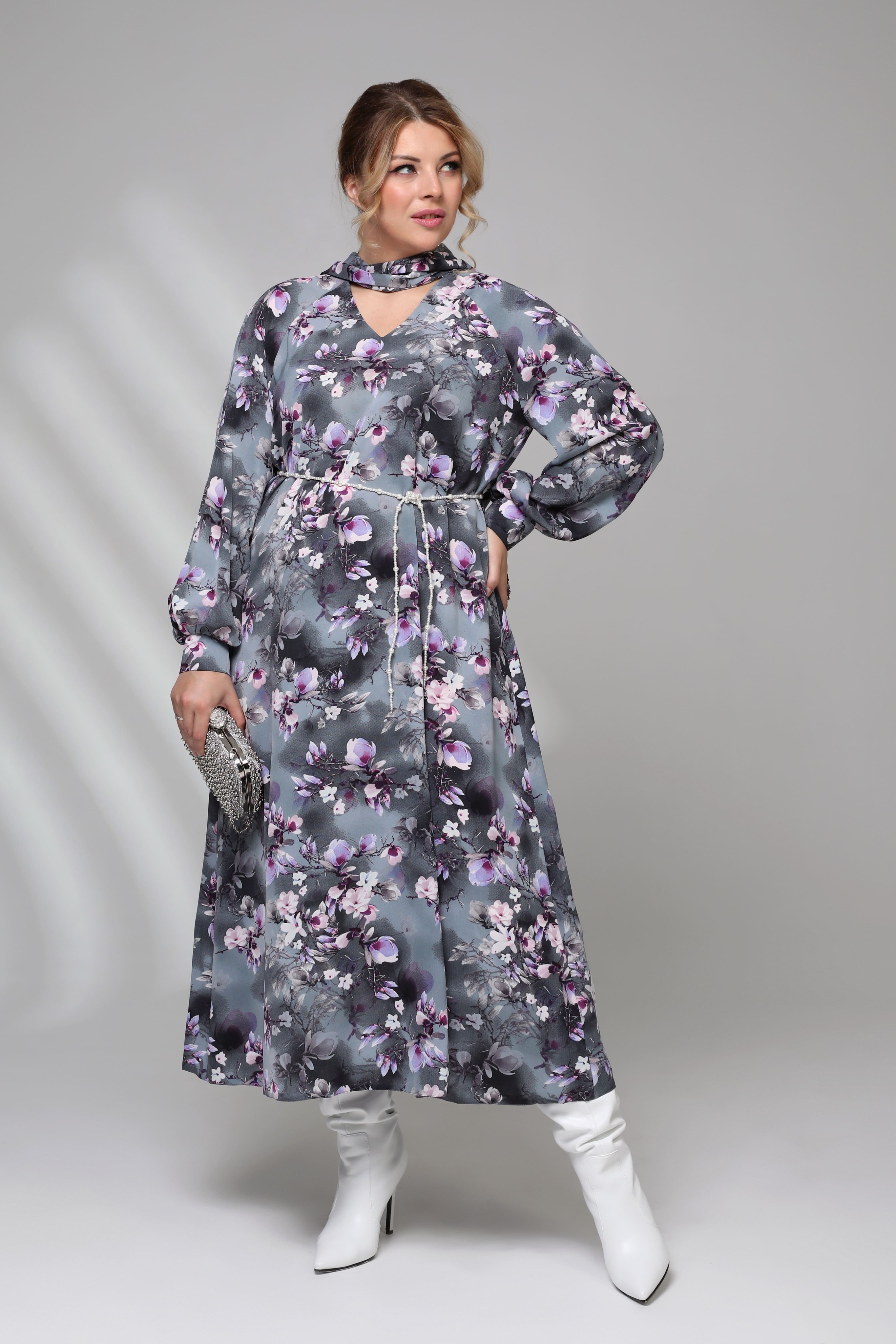 Платье v-вырез с завязкой на вороте "цветочки" серое