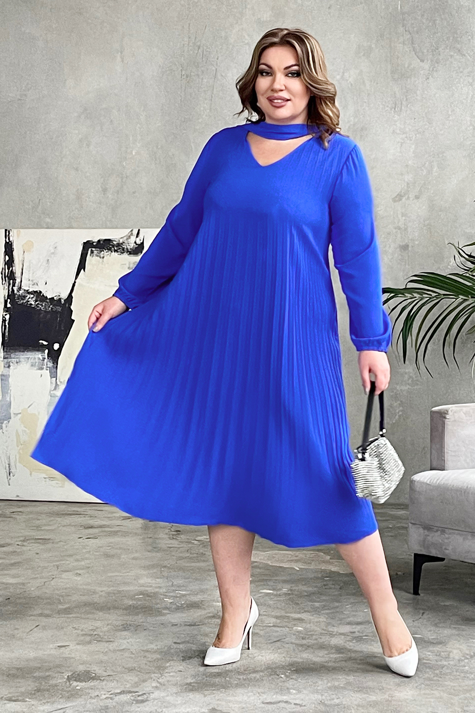 Стильное женское платье трапеция из мягкого гофрированного материала. имеет классический v-образный вырез. рукава полной длины по низу дополнены тонкой резинкой. аккуратная плиссировка зрительно вытягивает силуэт и визуально стройнит. полуприлегающий силуэт и мягкий материал искусно обыгрывают фигуру и дарят комфорт в течение всего дня. стильный клатч и туфли на каблуках станут идеальным дополнением к нарядному образу.