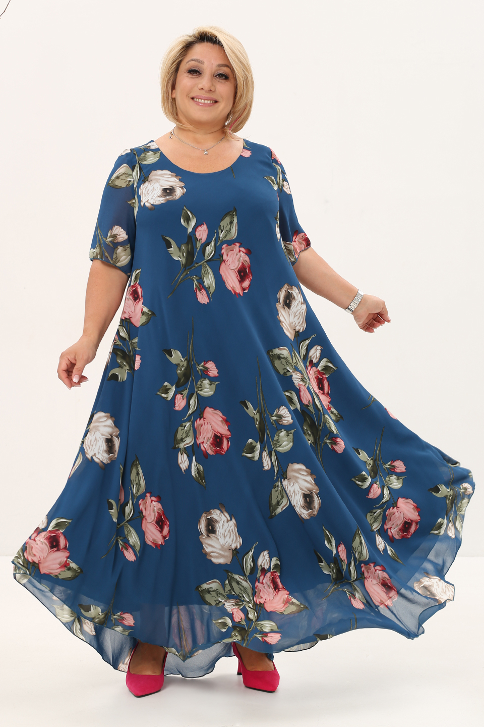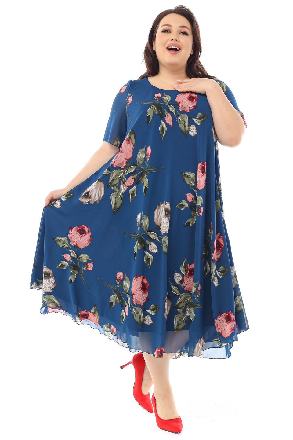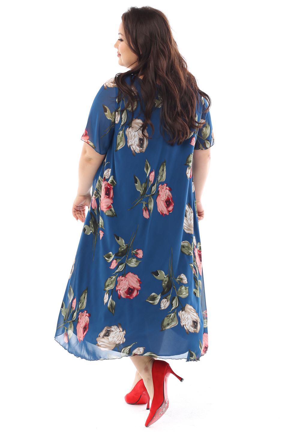 Платье "розовые розы" шифон длинное расклешенное синее