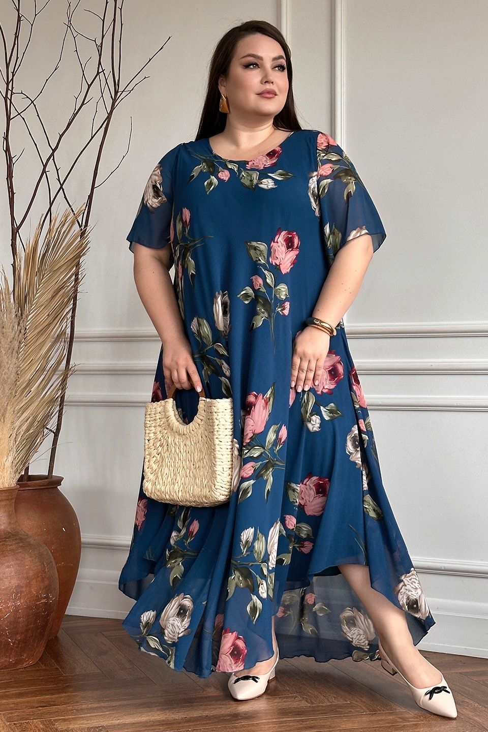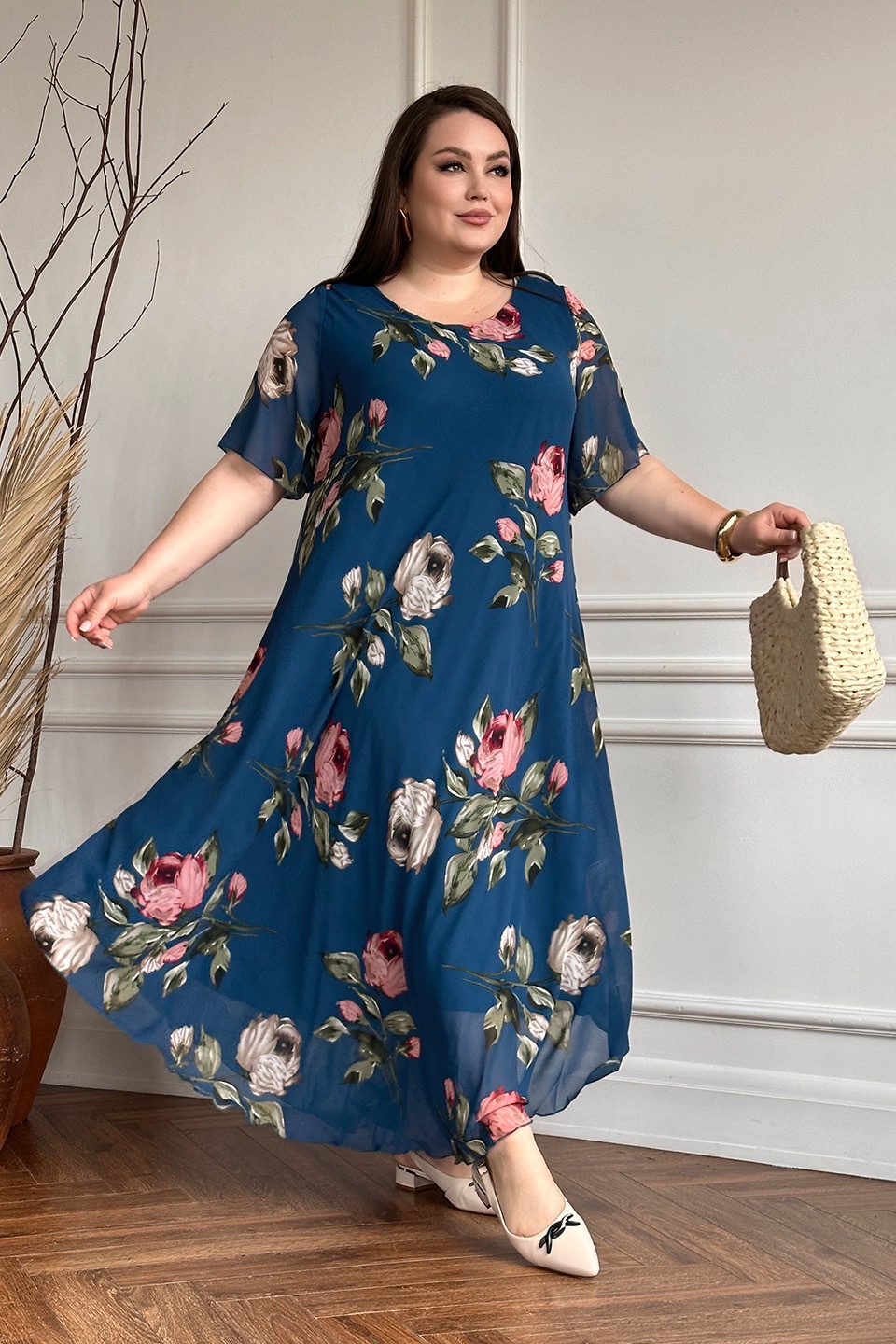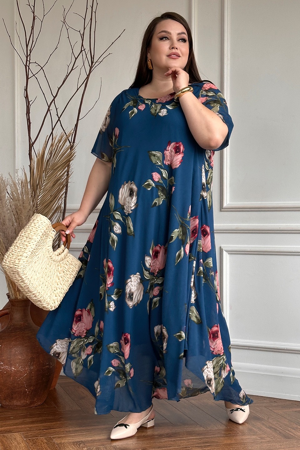 Платье "розовые розы" шифон длинное расклешенное синее
