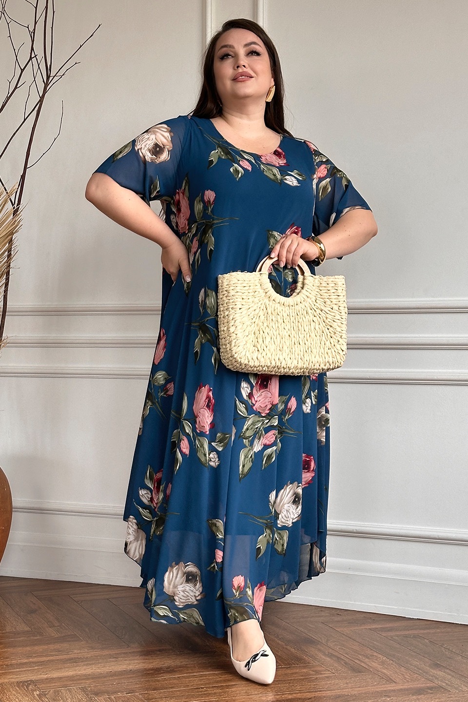 Элегантное платье миди из полупрозрачного шифона на подкладке. модель имеет широкий круглый вырез и короткие воздушные рукава. свободная юбка с асимметричными краями искусно обыгрывает фигуру и подчеркивает женственность образа. яркий цветочный принт добавляет нежности и романтичности.