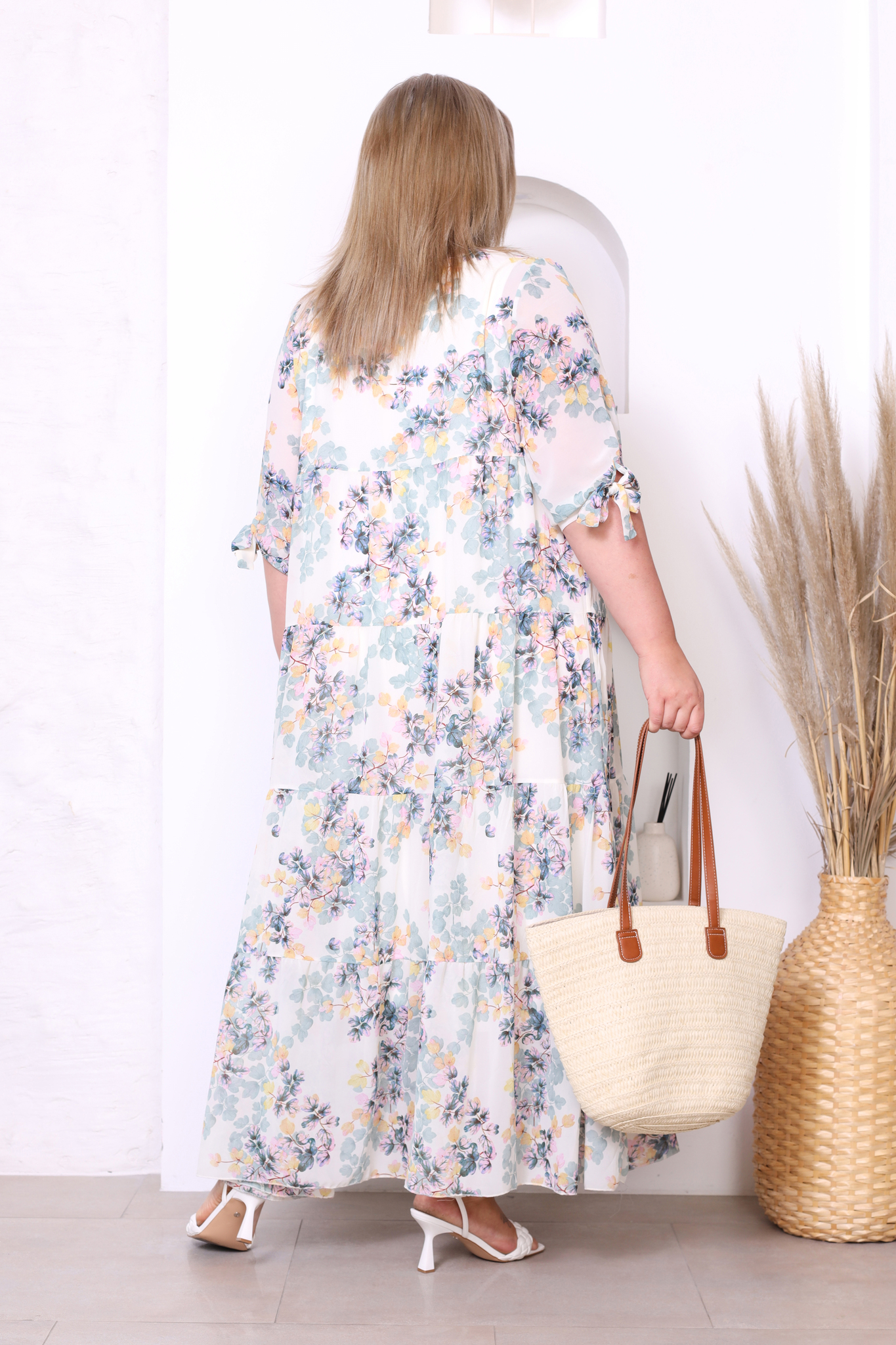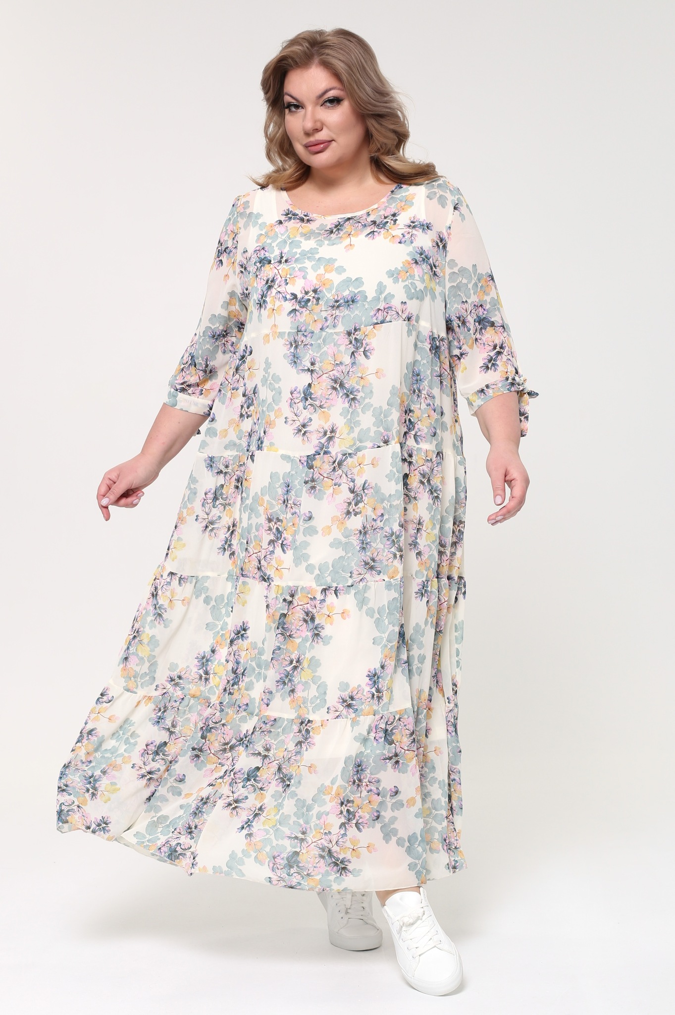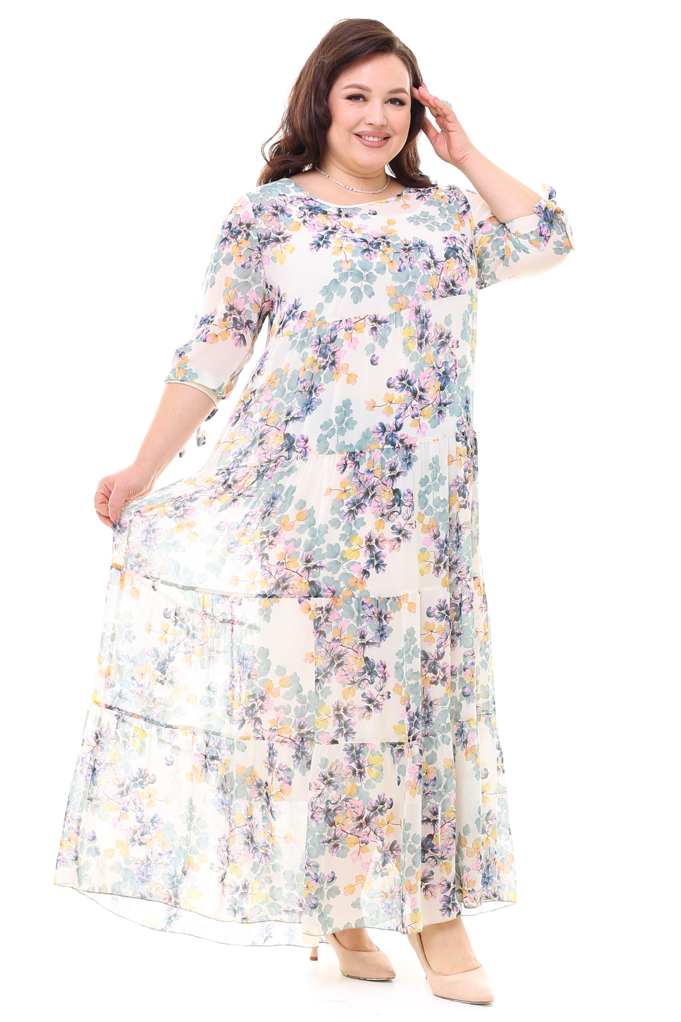 Платье длинное шифон ярусы "яркие цветы" айвори