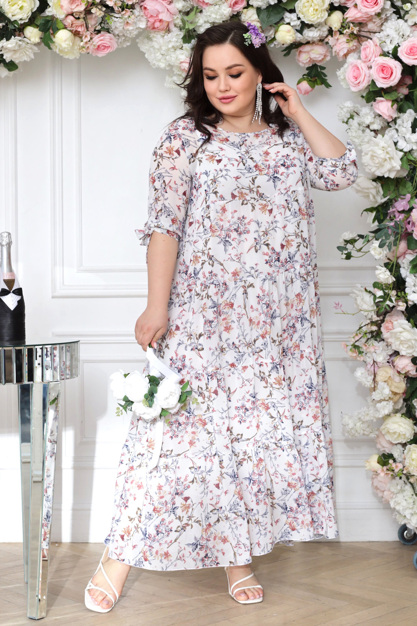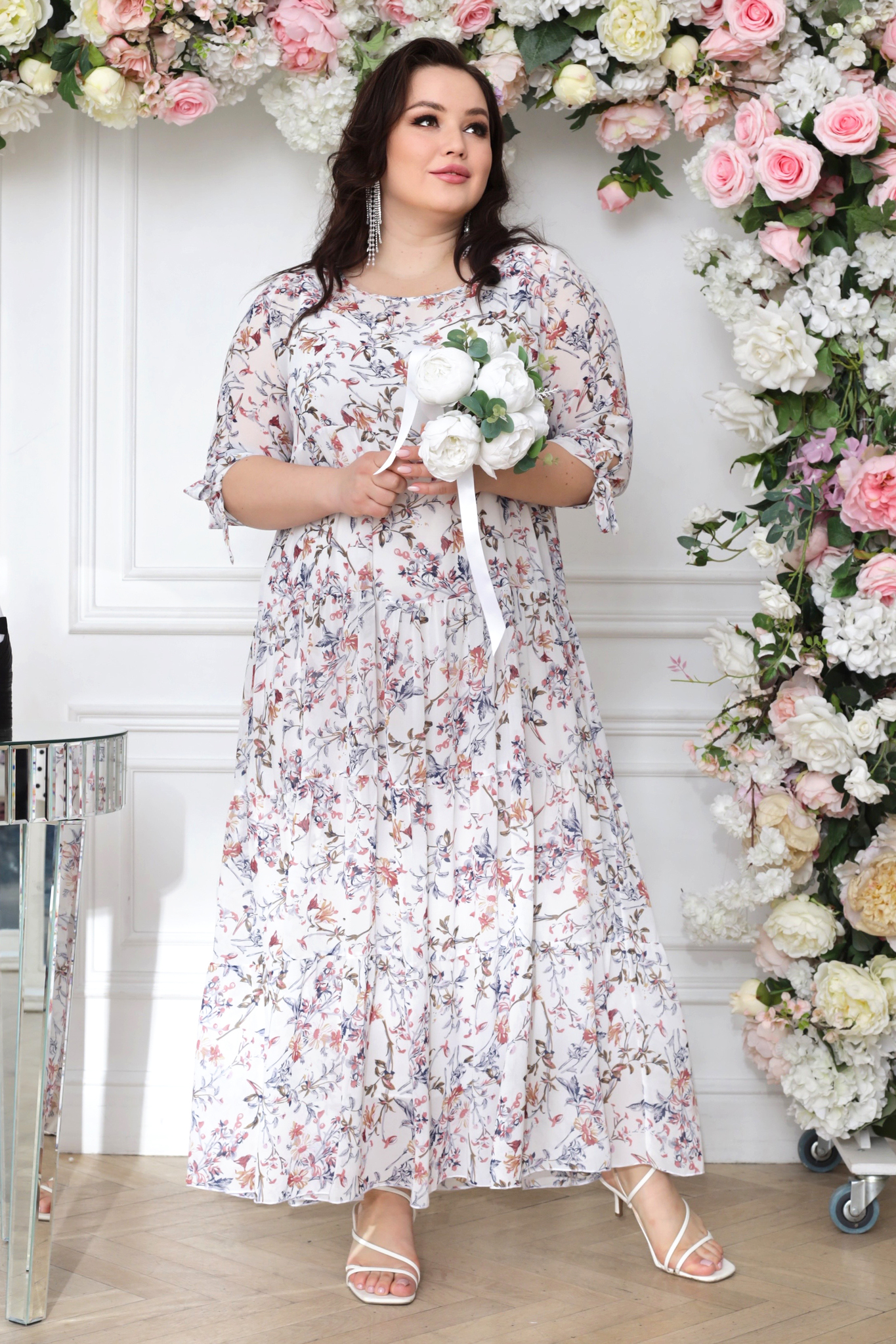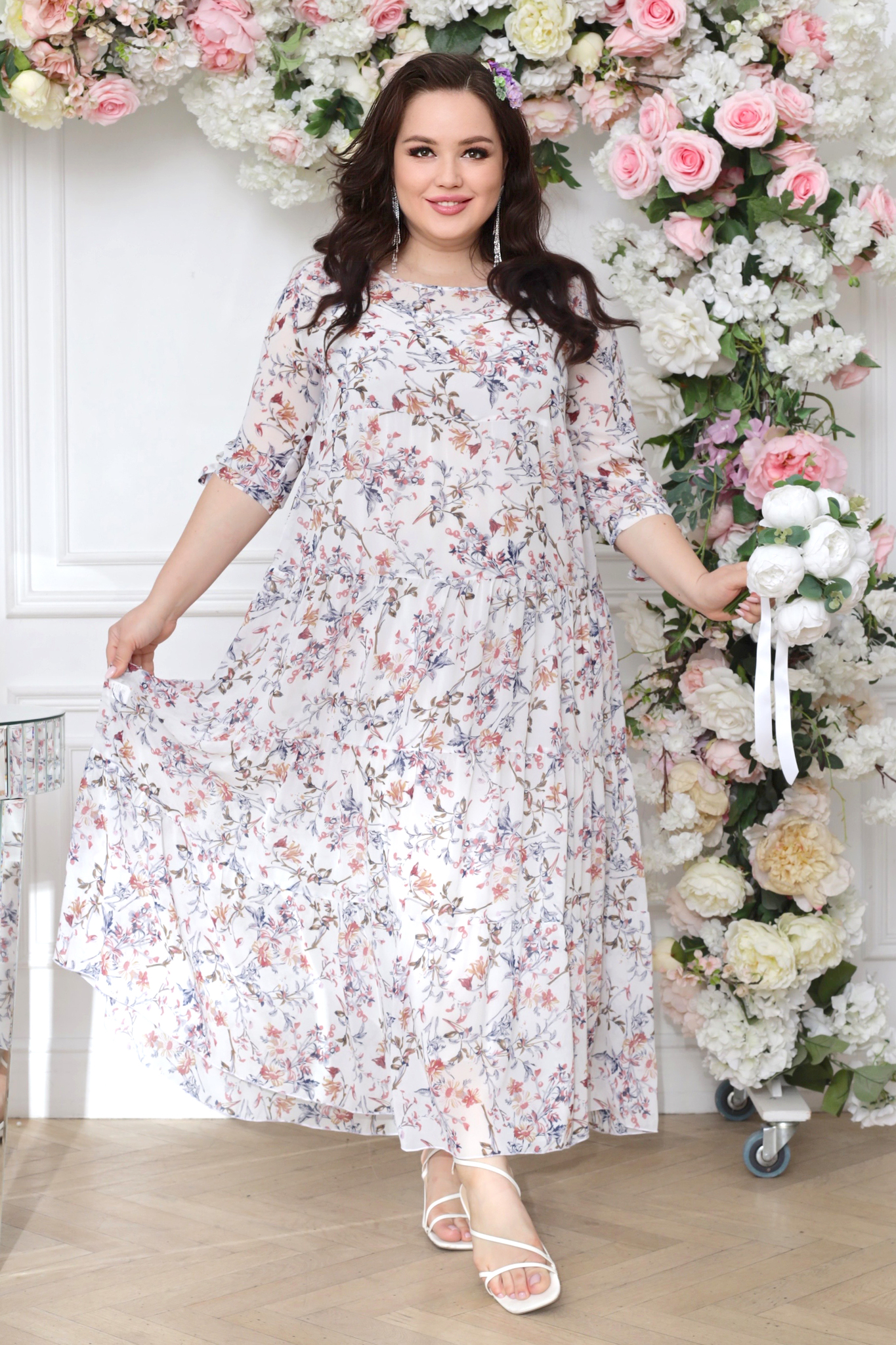 Платье длинное шифон ярусы "бежевые цветы" белое свадебное