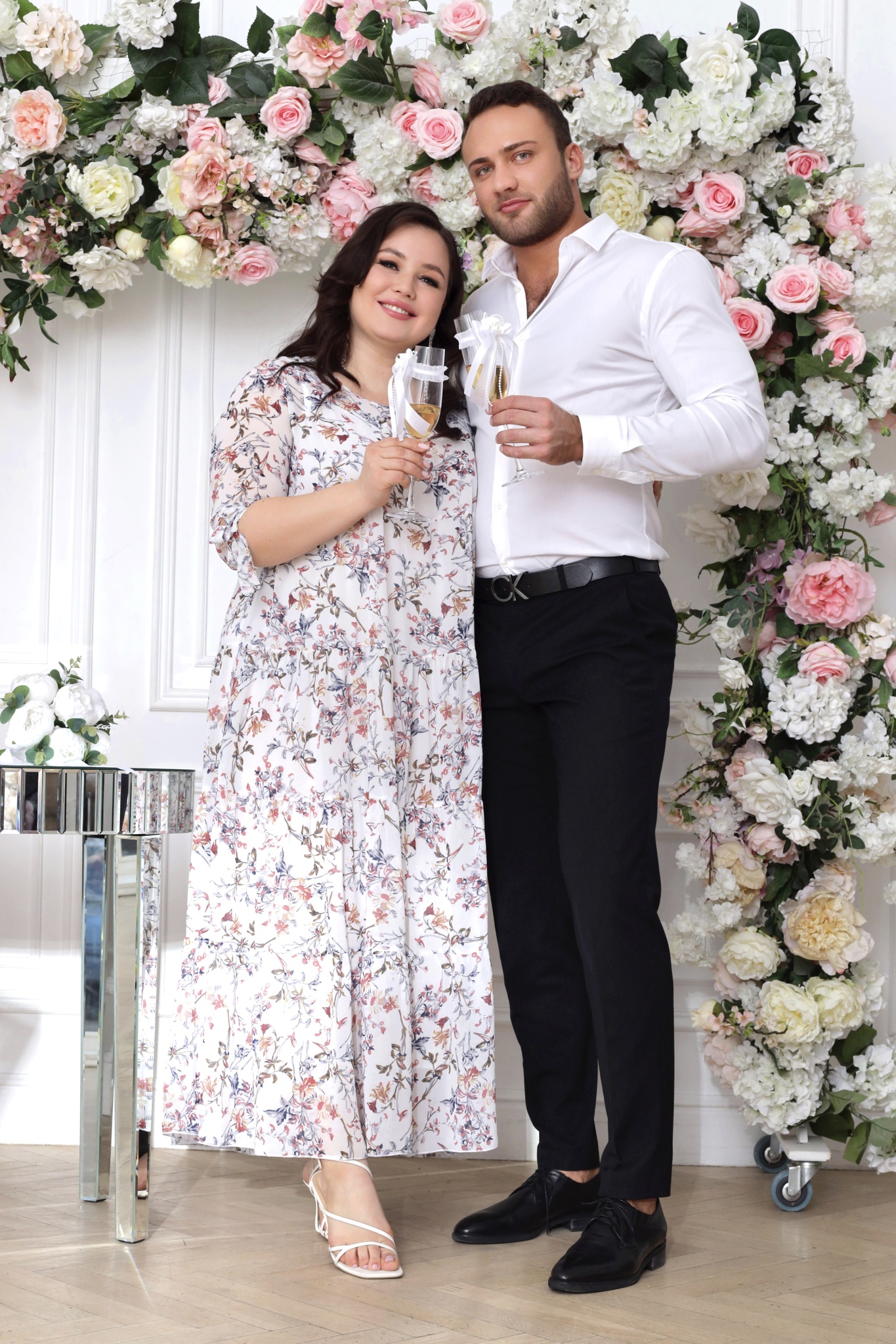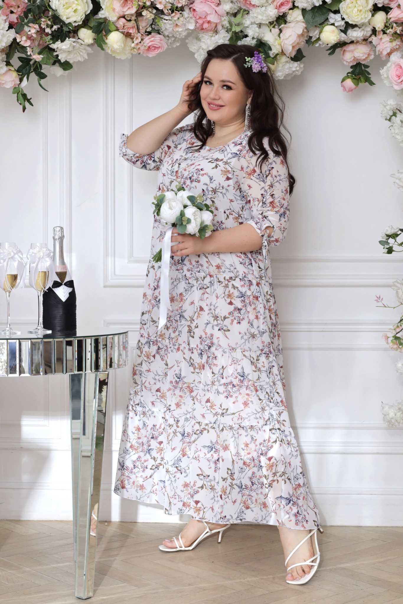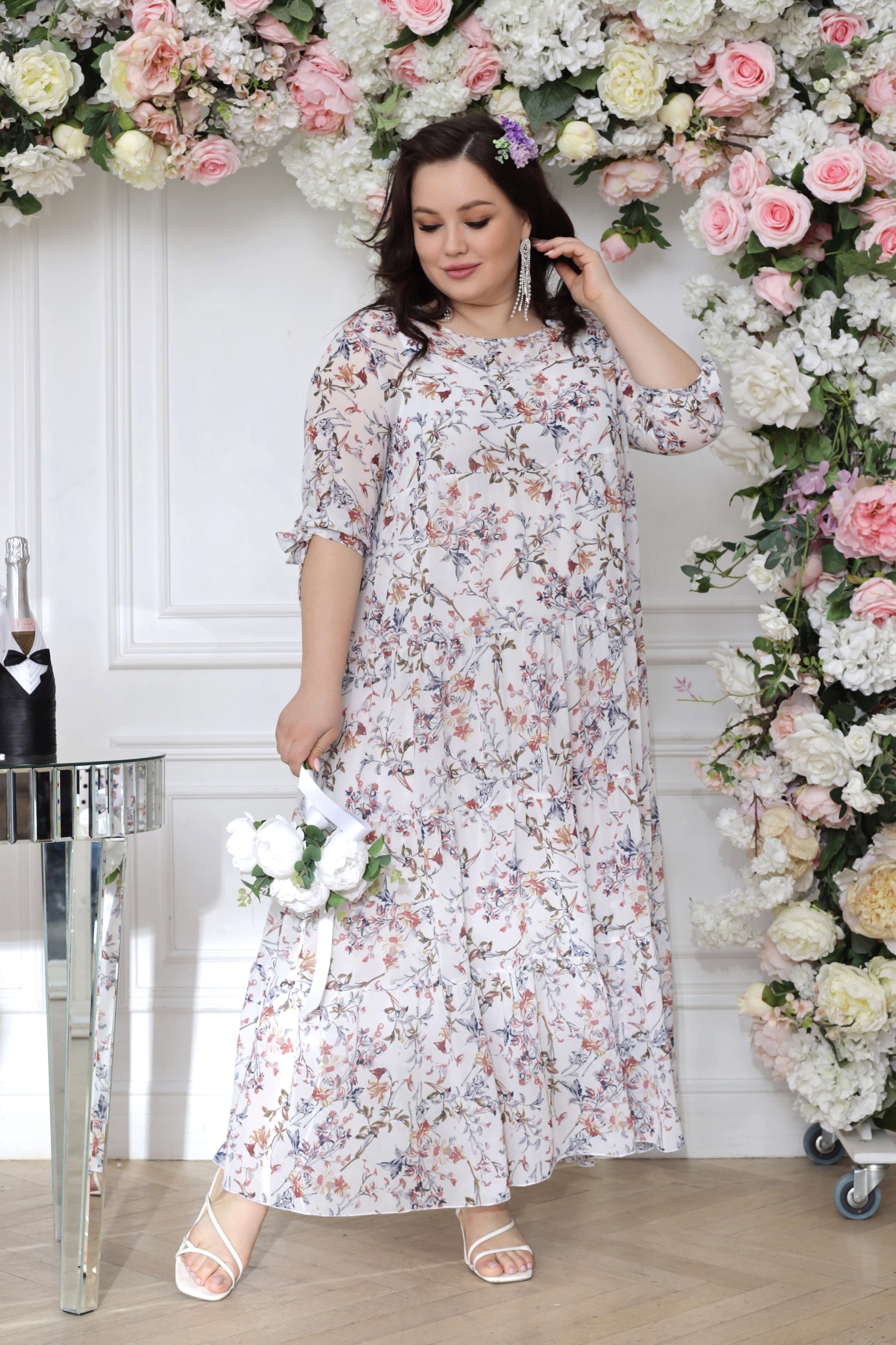Платье длинное шифон ярусы "бежевые цветы" белое свадебное