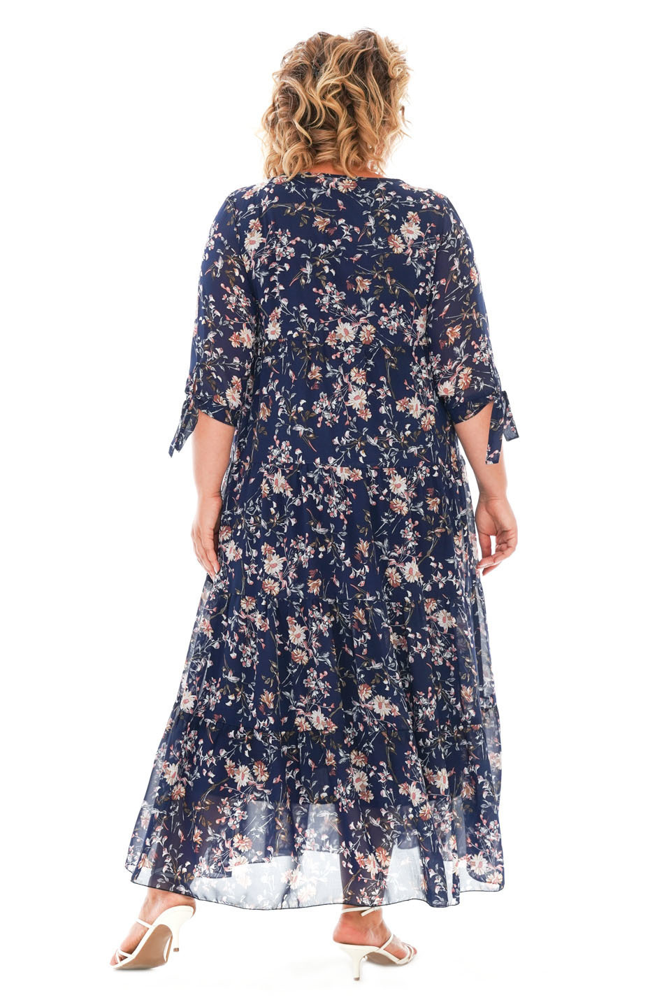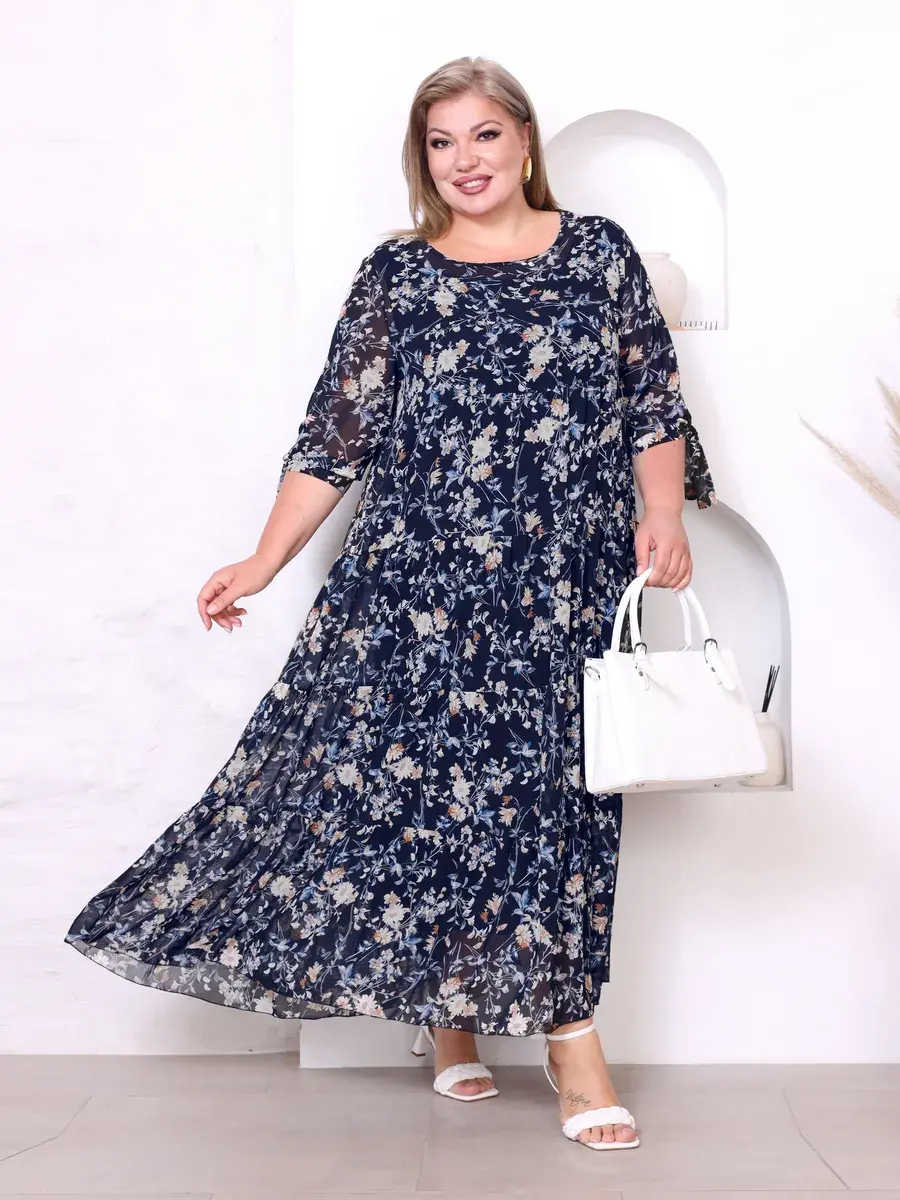 Платье длинное шифон ярусы "цветы" синее