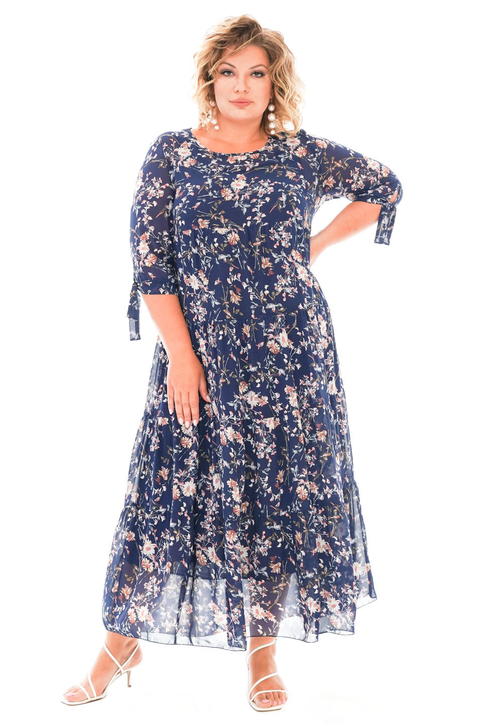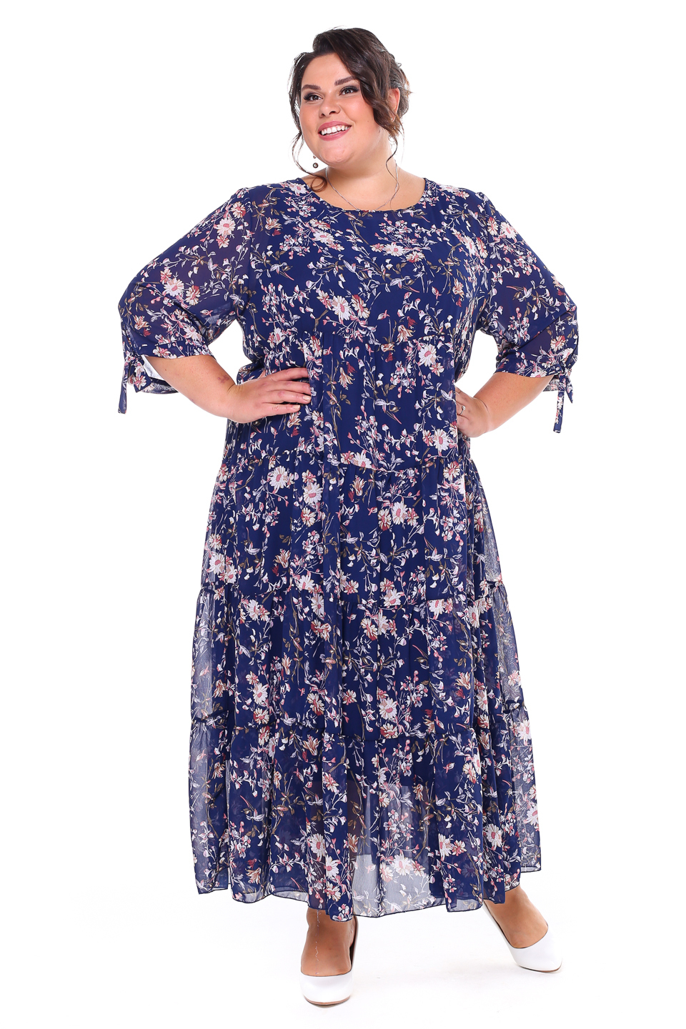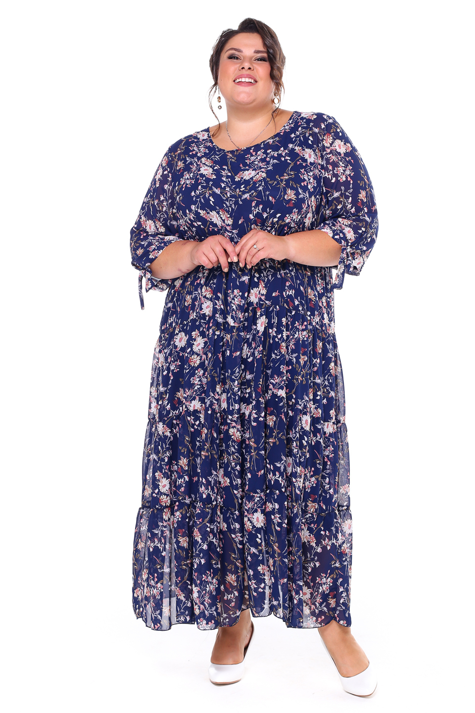 Легкое шифоновое платье "макси" свободного силуэта на съемной подкладе. имеет круглый вырез и рукава с манжетами на завязках. платье отрезное по линии груди с многоярусной расклешенной юбкой. свободный крой не сковывает движений и скрывает несовершенства фигуры. модель приятна телу, хорошо сидит и красиво обыгрывает фигуру. нежный принт по всему изделию добавляет образу динамичности. стильное платье в пол идеально подойдет для торжественных мероприятий разного характера и для летних прогулок. подчеркните лаконичность образа длинными серьгами и туфлями на высоких каблуках.