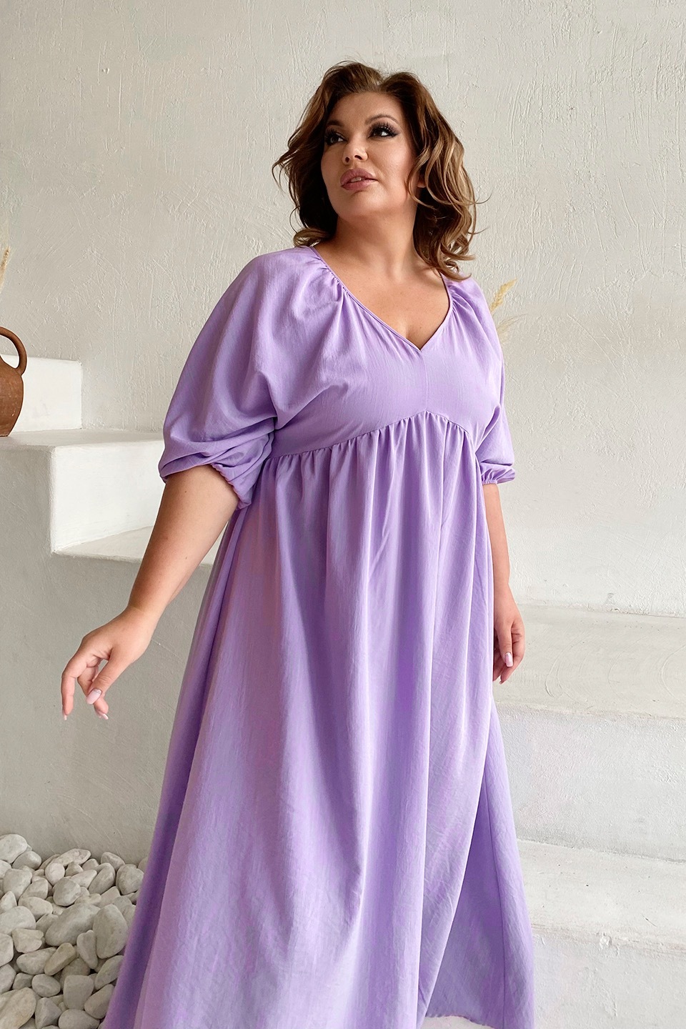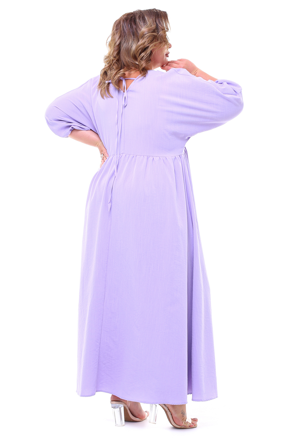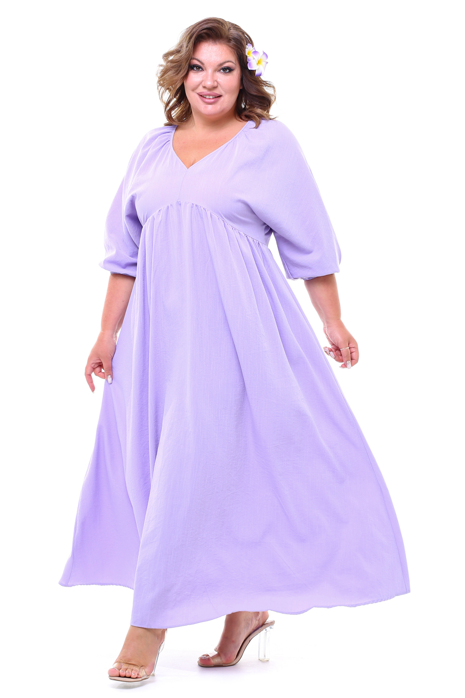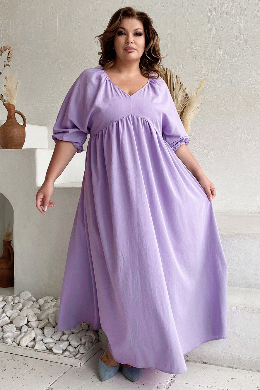 Платье жатое v-вырез со сборкой под грудью длинное лаванда