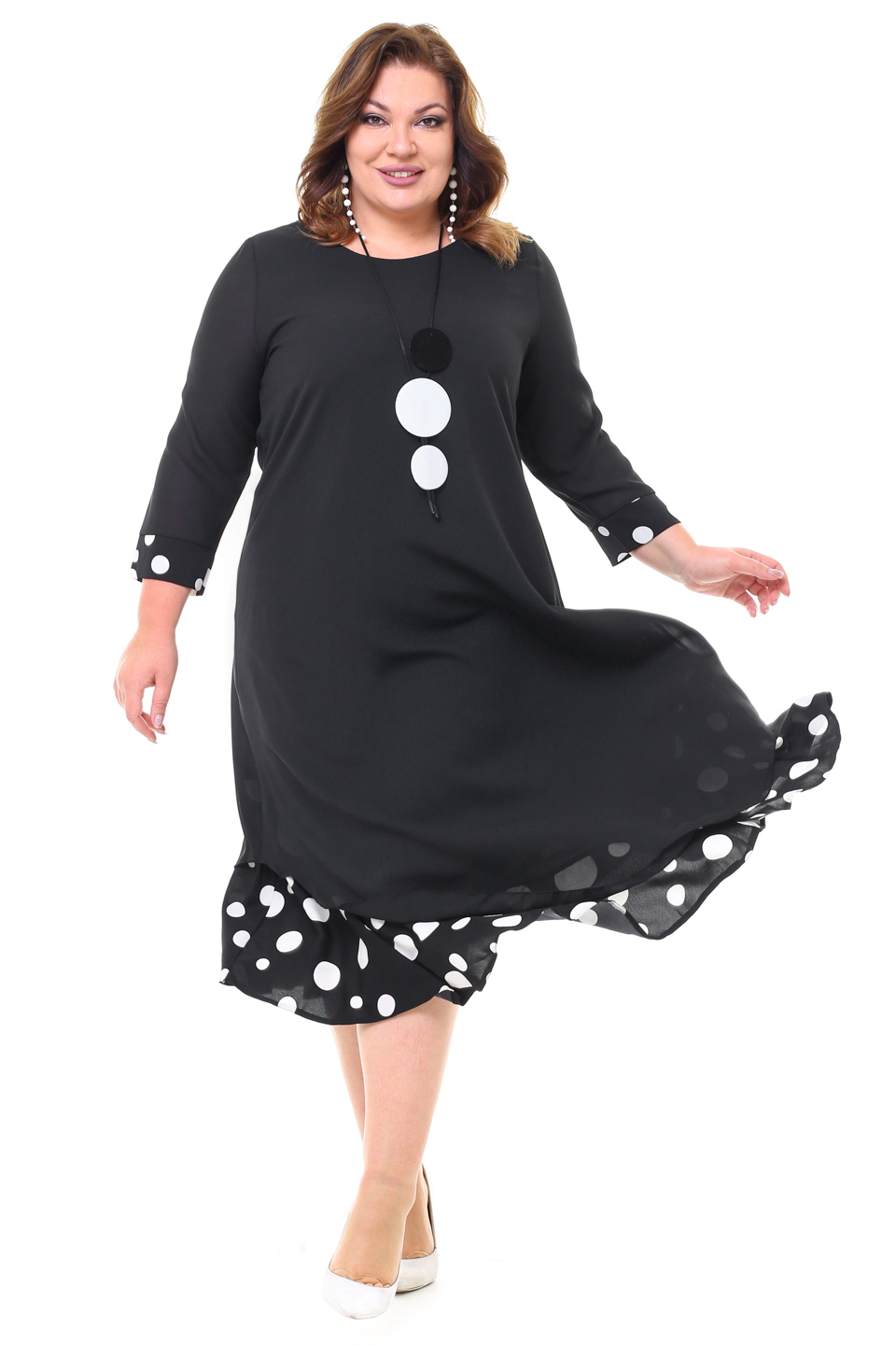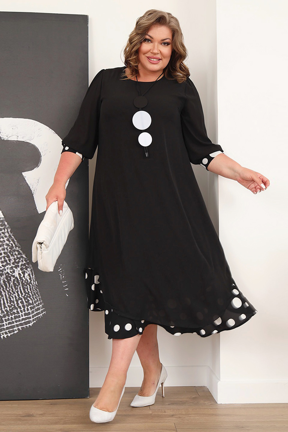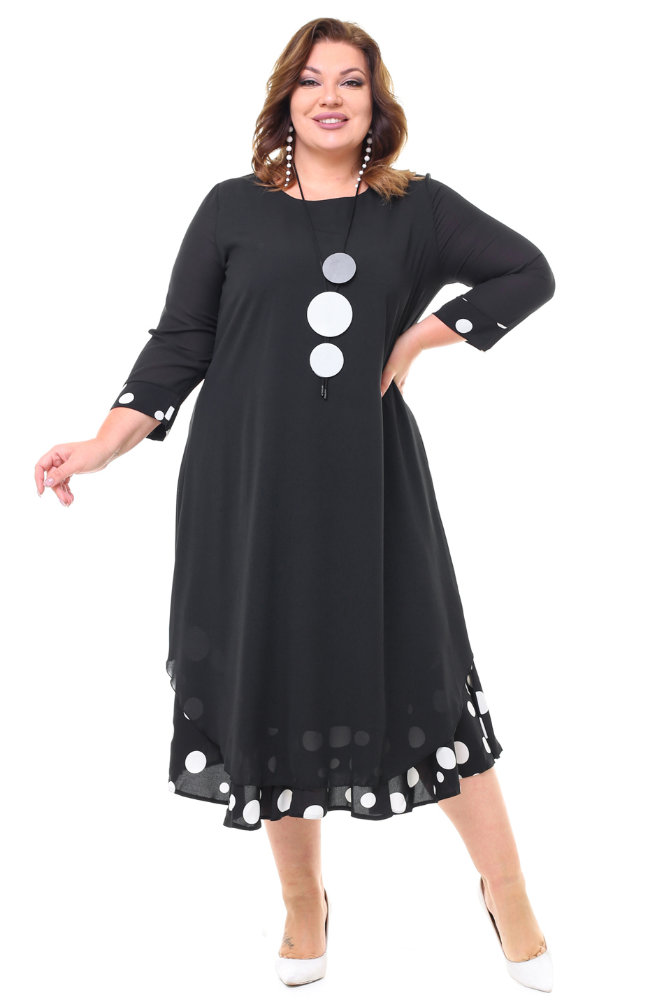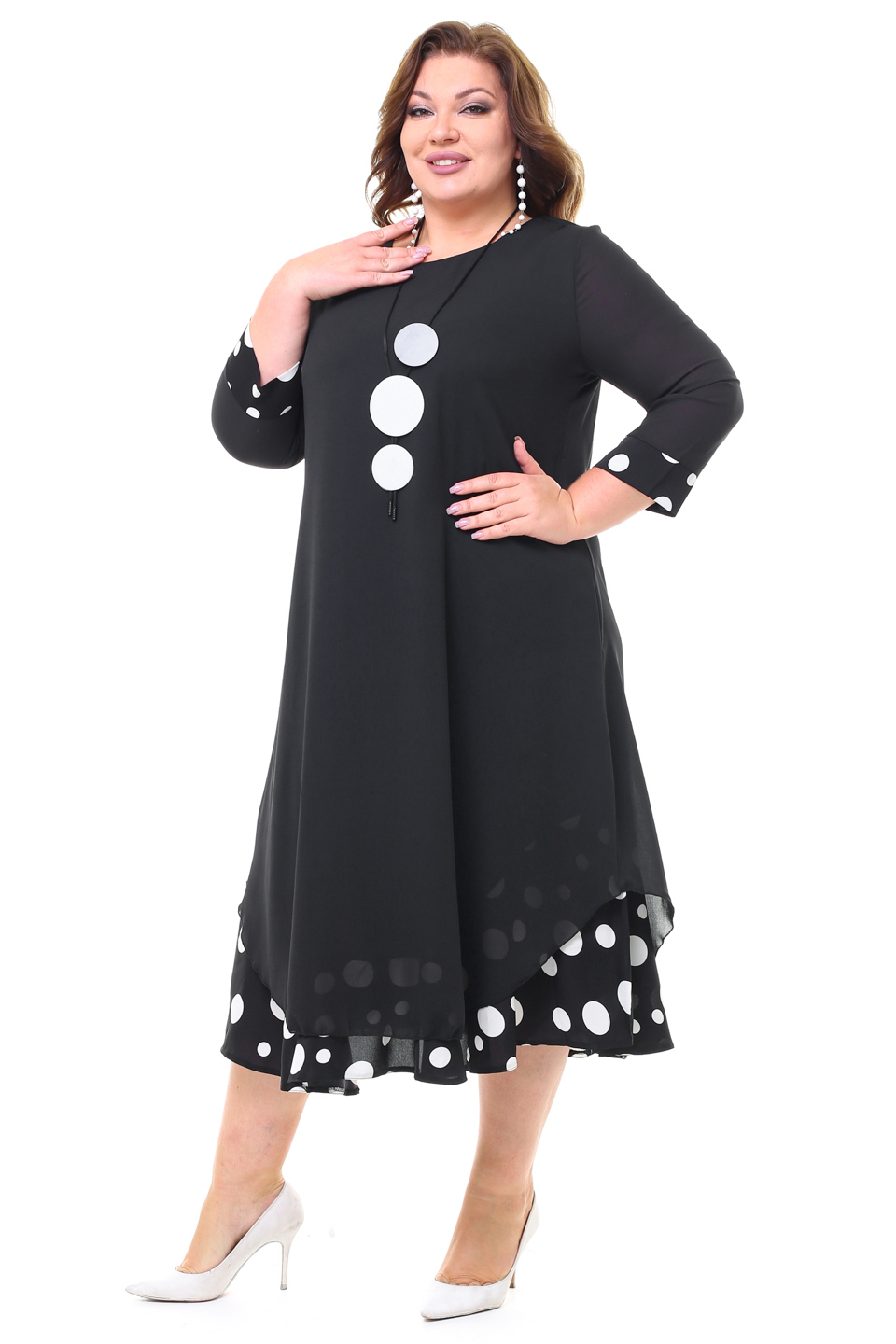Элегантное платье мягкого материала на подкладке. модель имеет круглый вырез и рукава длиной 3/4, оформленные контрастным кантом по низу. свободная юбка верха с асимметричными краями искусно обыгрывает фигуру и подчеркивает женственность образа. подол нижней юбки с гороховым принтом придает модели женственности и романтизма. полуприлегающий силуэт искусно обыгрывает фигуру и визуально стройнит. нарядности добавляет оригинальное ожерелье. платье станет идеальным нарядом для любого повода. стильный клатч и туфли на каблуках станут идеальным дополнением к нарядному образу.