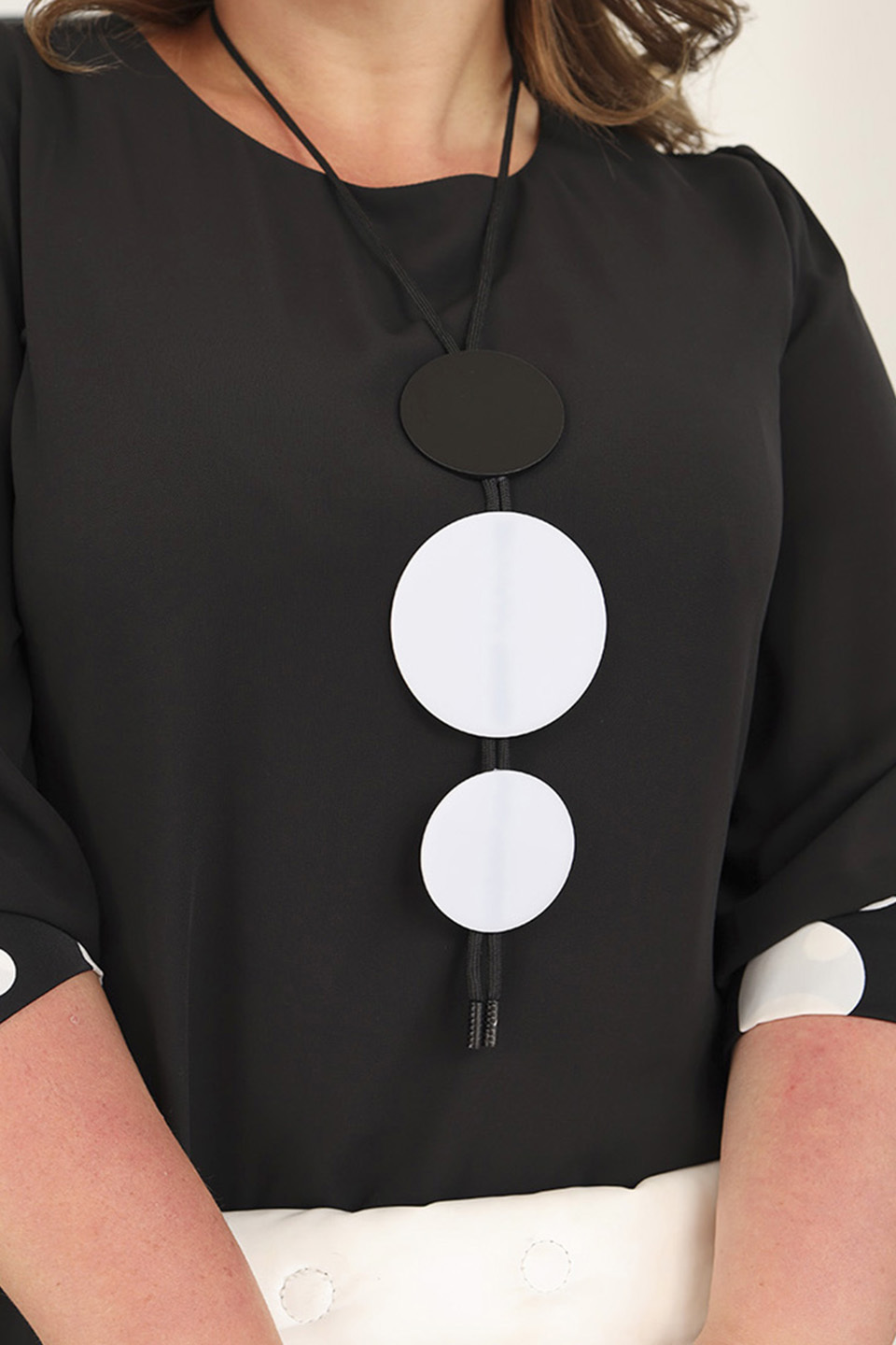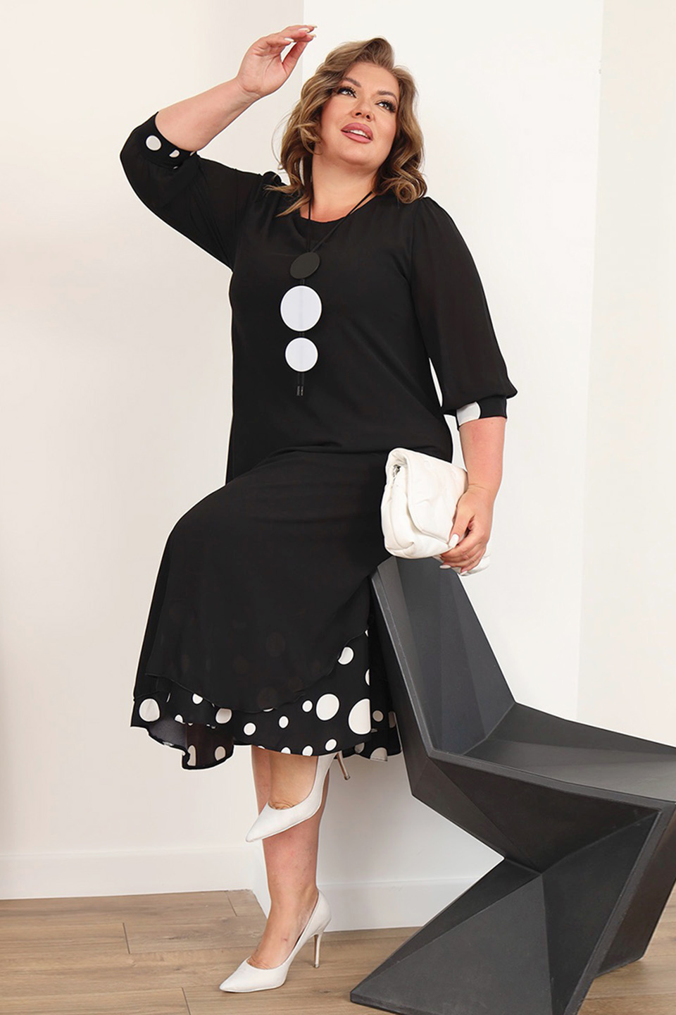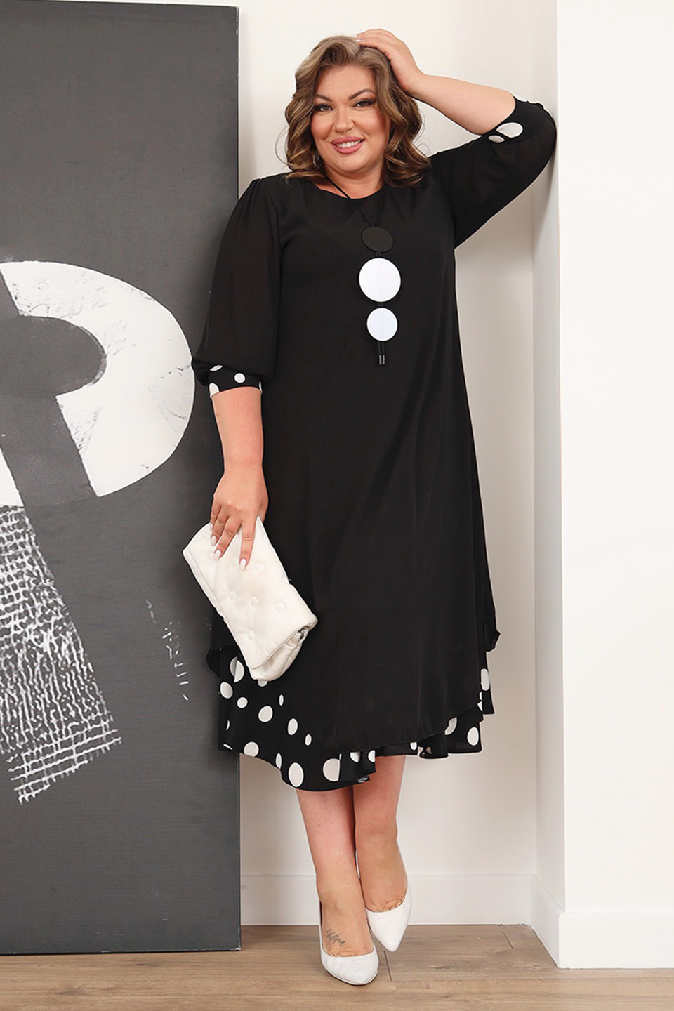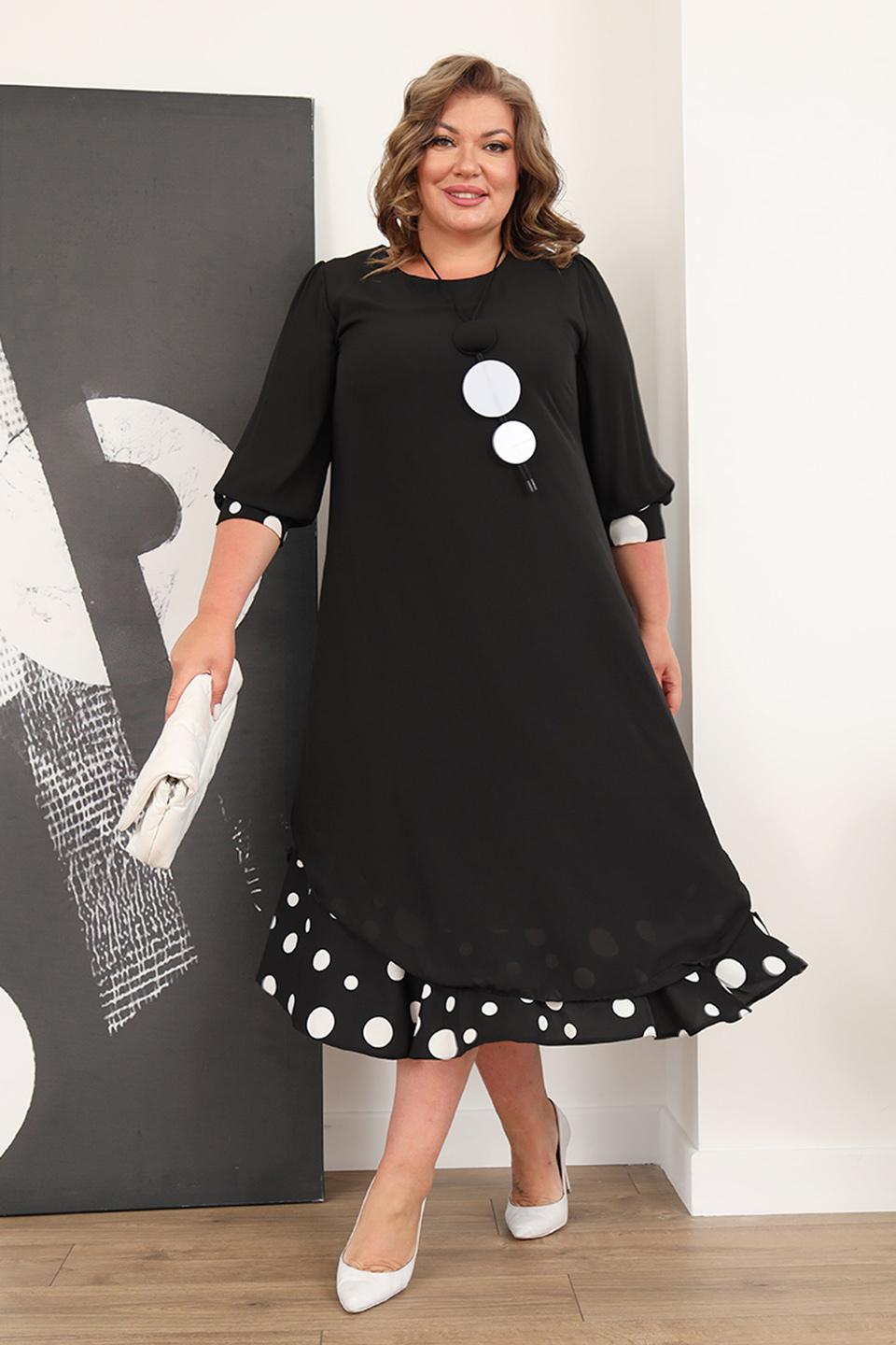 Элегантное платье мягкого материала на подкладке. модель имеет круглый вырез и рукава длиной 3/4, оформленные контрастным кантом по низу. свободная юбка верха с асимметричными краями искусно обыгрывает фигуру и подчеркивает женственность образа. подол нижней юбки с гороховым принтом придает модели женственности и романтизма. полуприлегающий силуэт искусно обыгрывает фигуру и визуально стройнит. нарядности добавляет оригинальное ожерелье. платье станет идеальным нарядом для любого повода. стильный клатч и туфли на каблуках станут идеальным дополнением к нарядному образу.