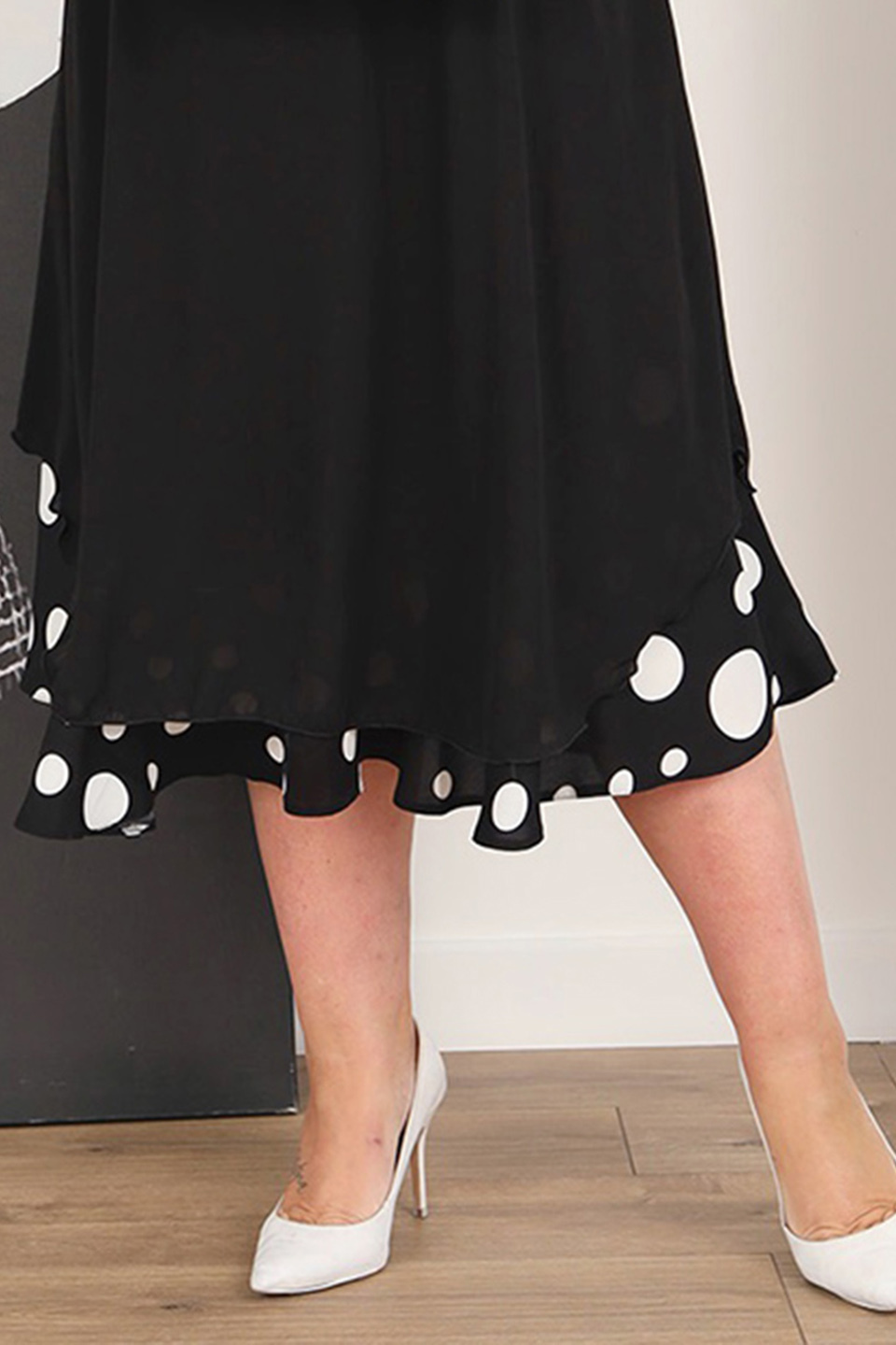 Платье шифон двойное с белым горошком снизу черное