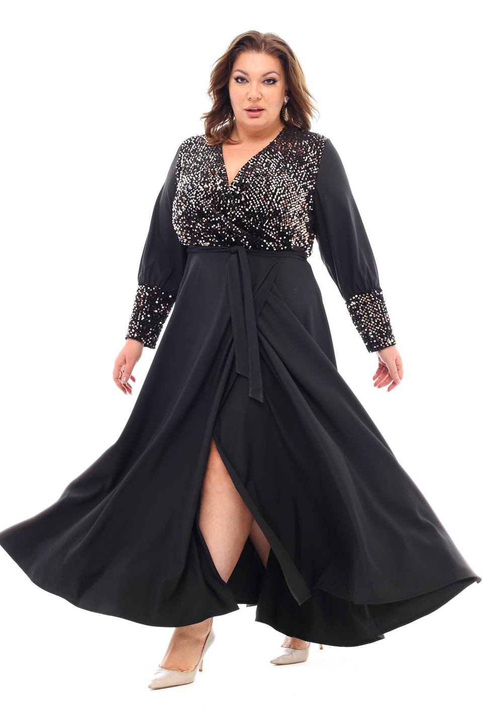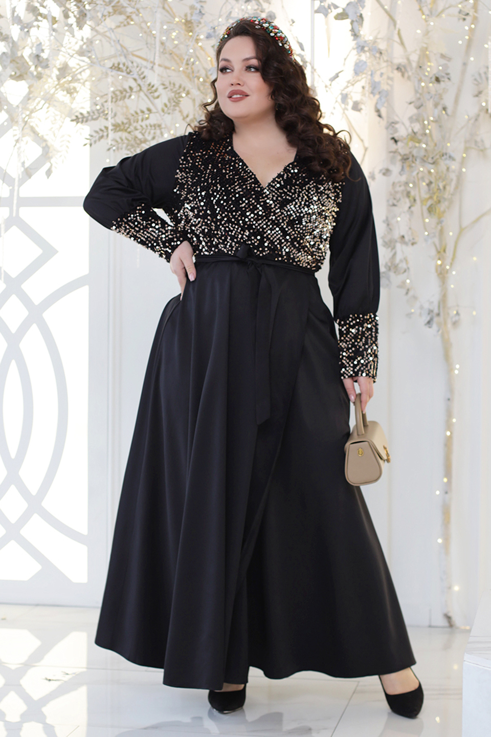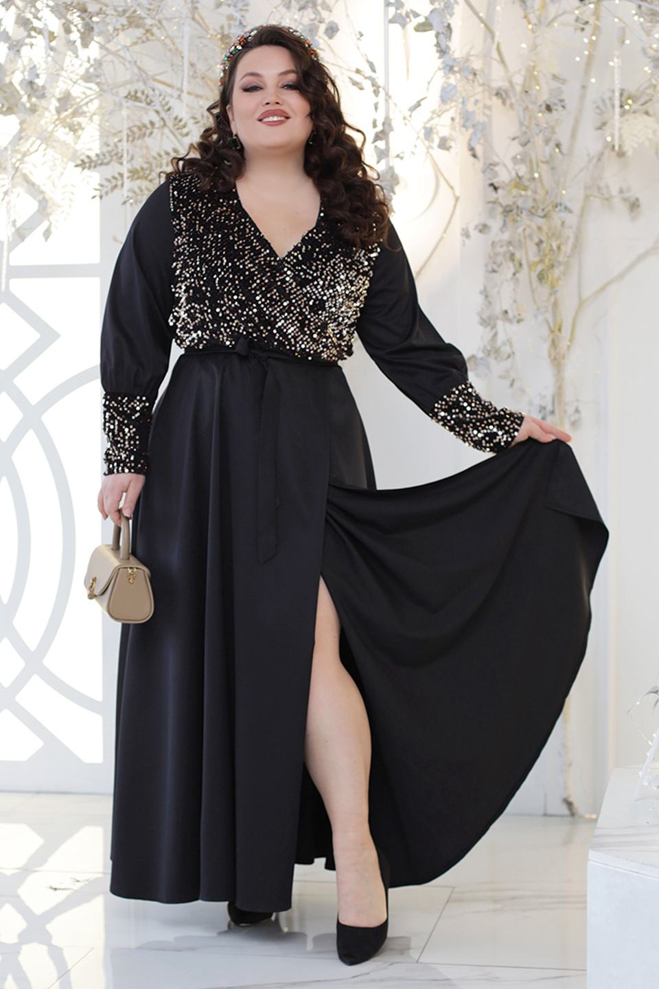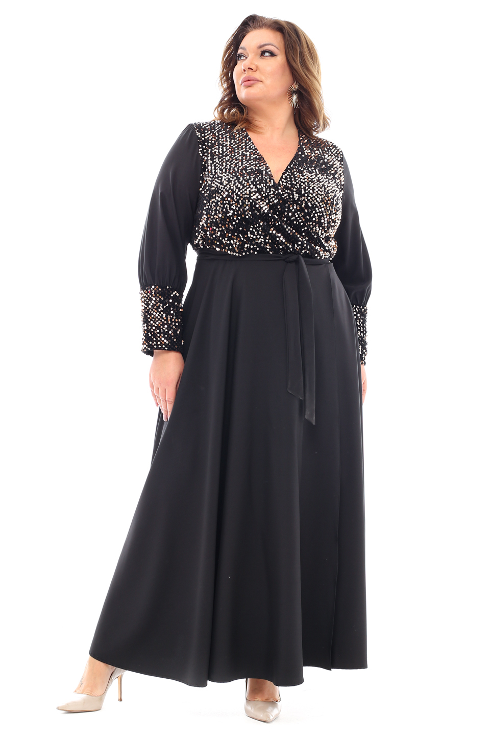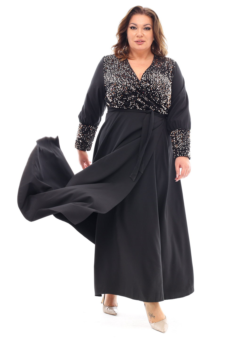 Платье длинное с запахом с пайеточным верхом черное с бронзой