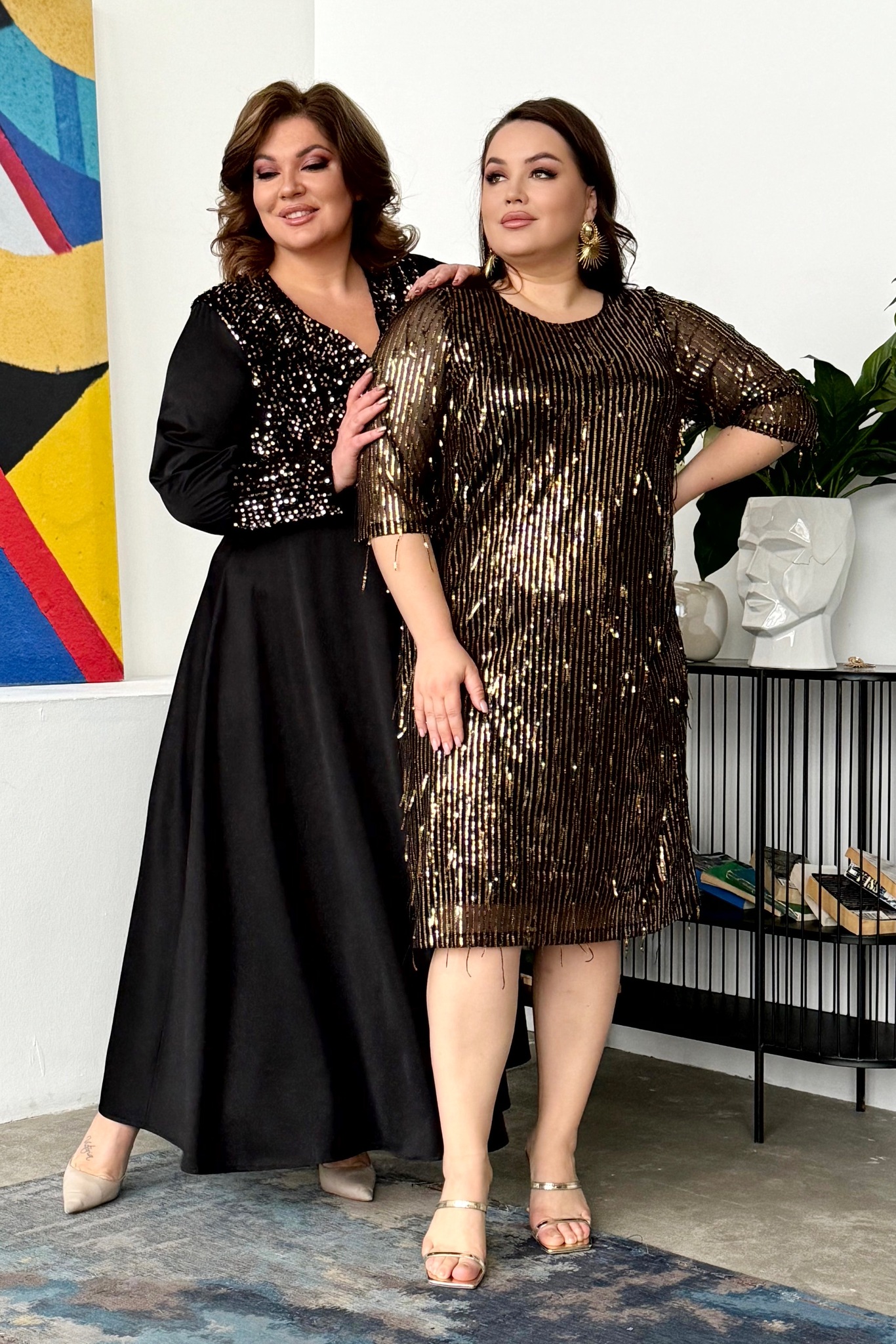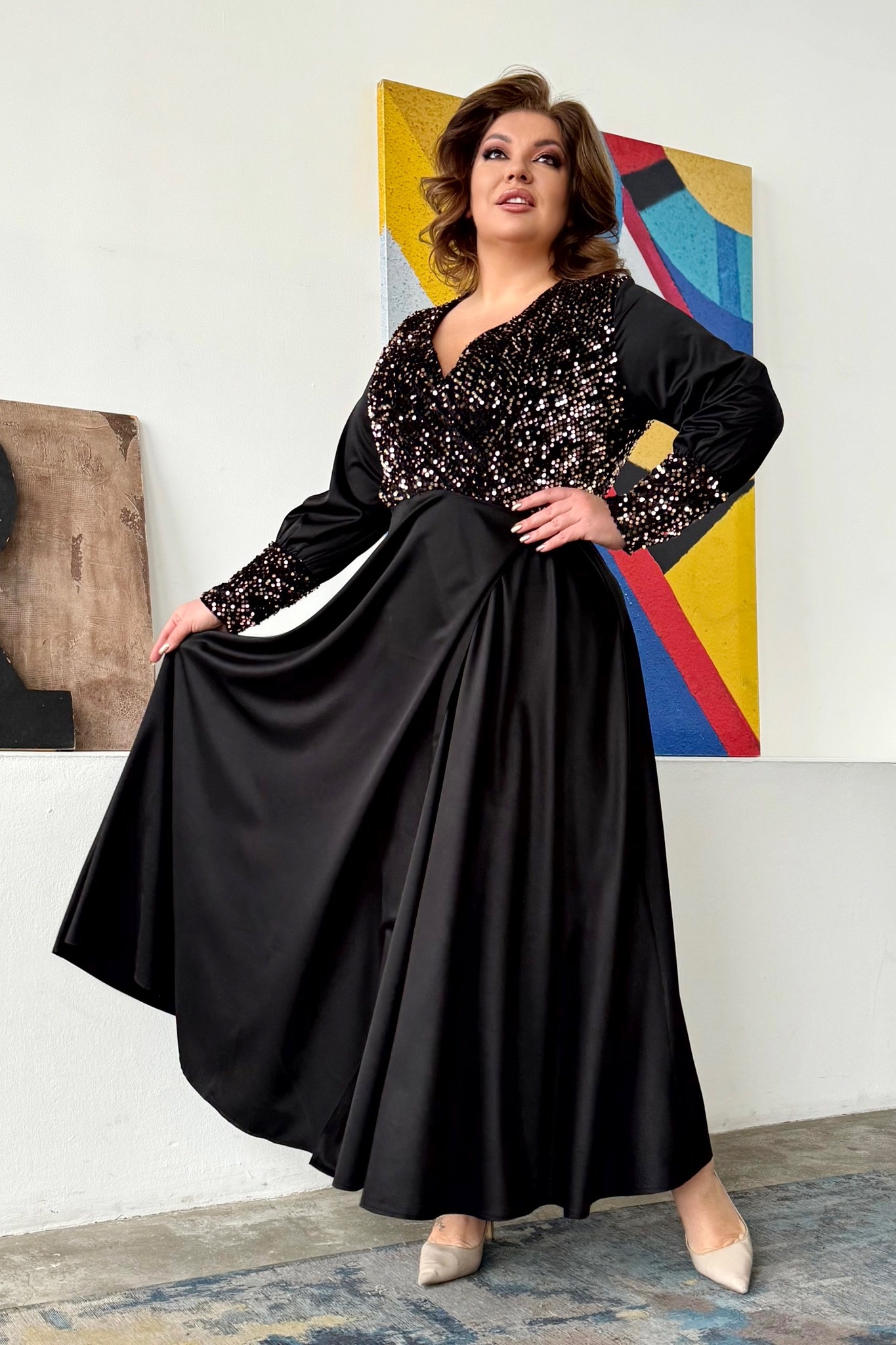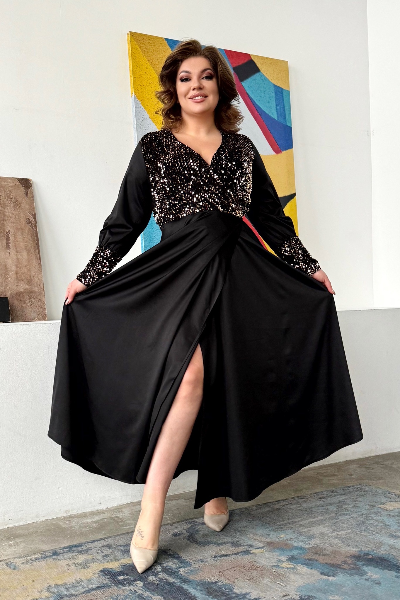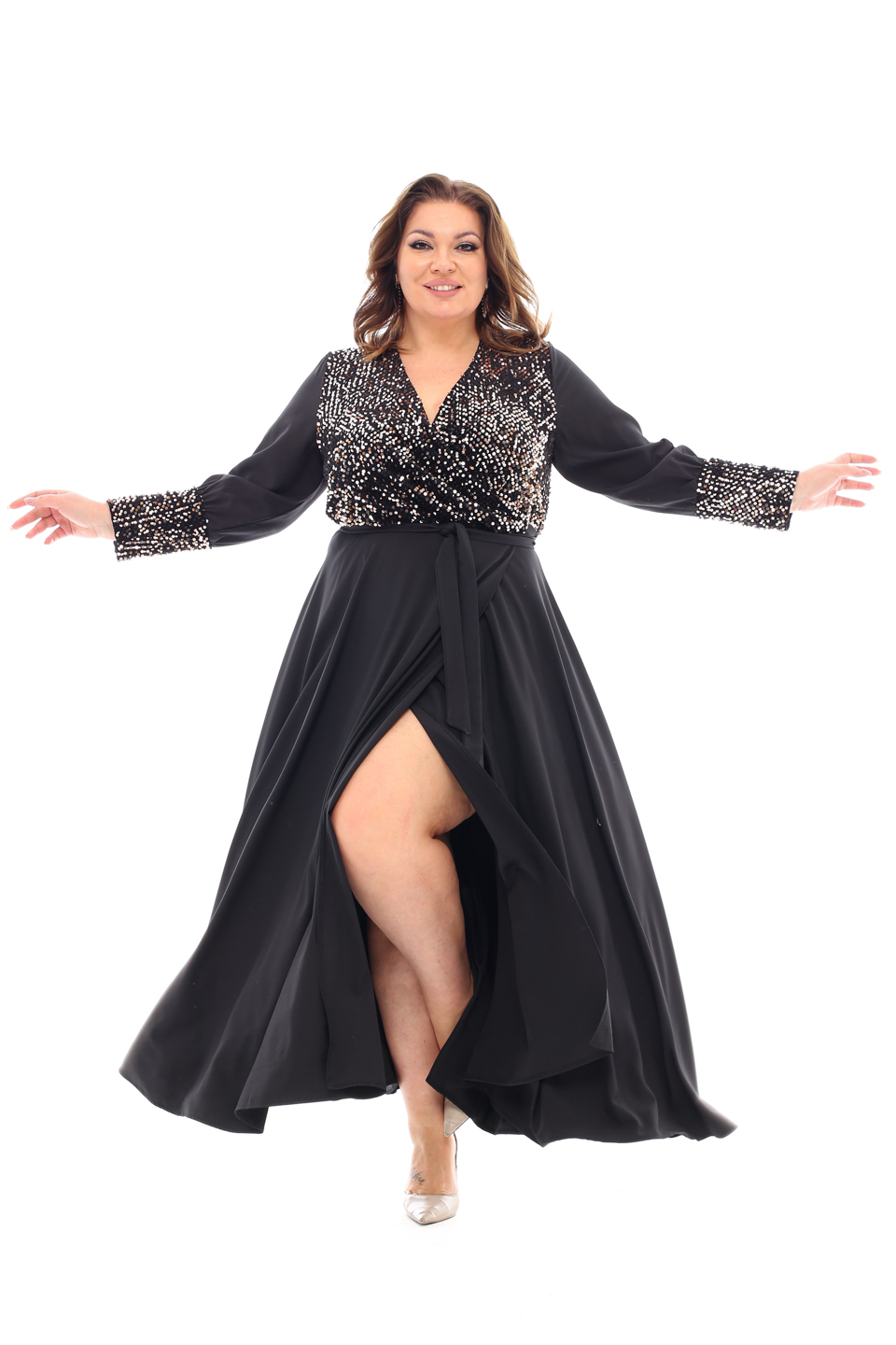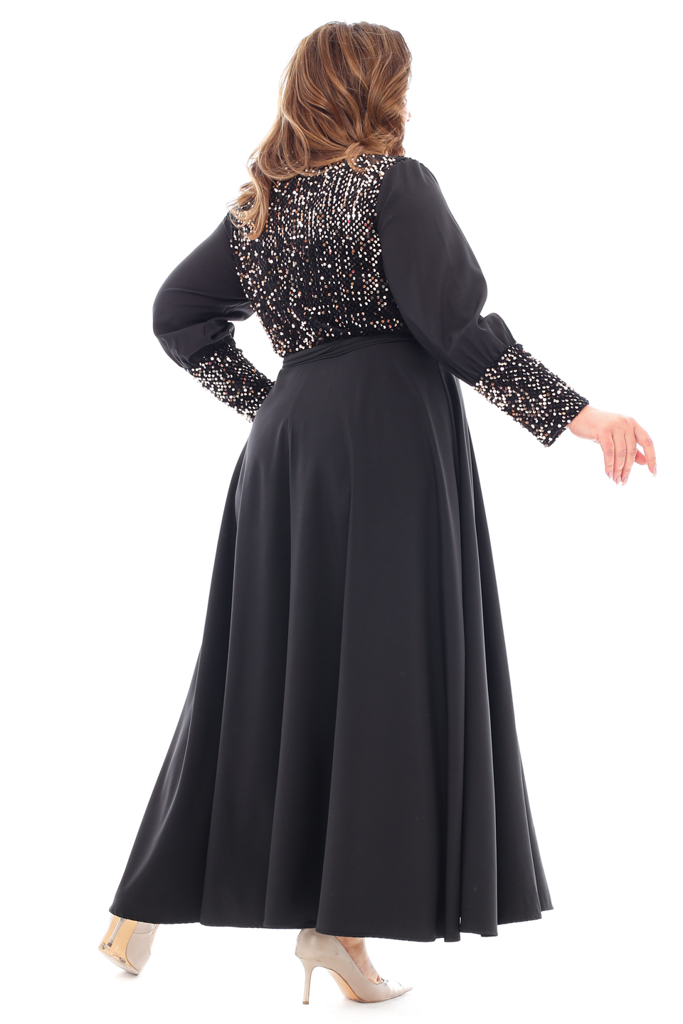 Платье длинное с запахом с пайеточным верхом черное с бронзой