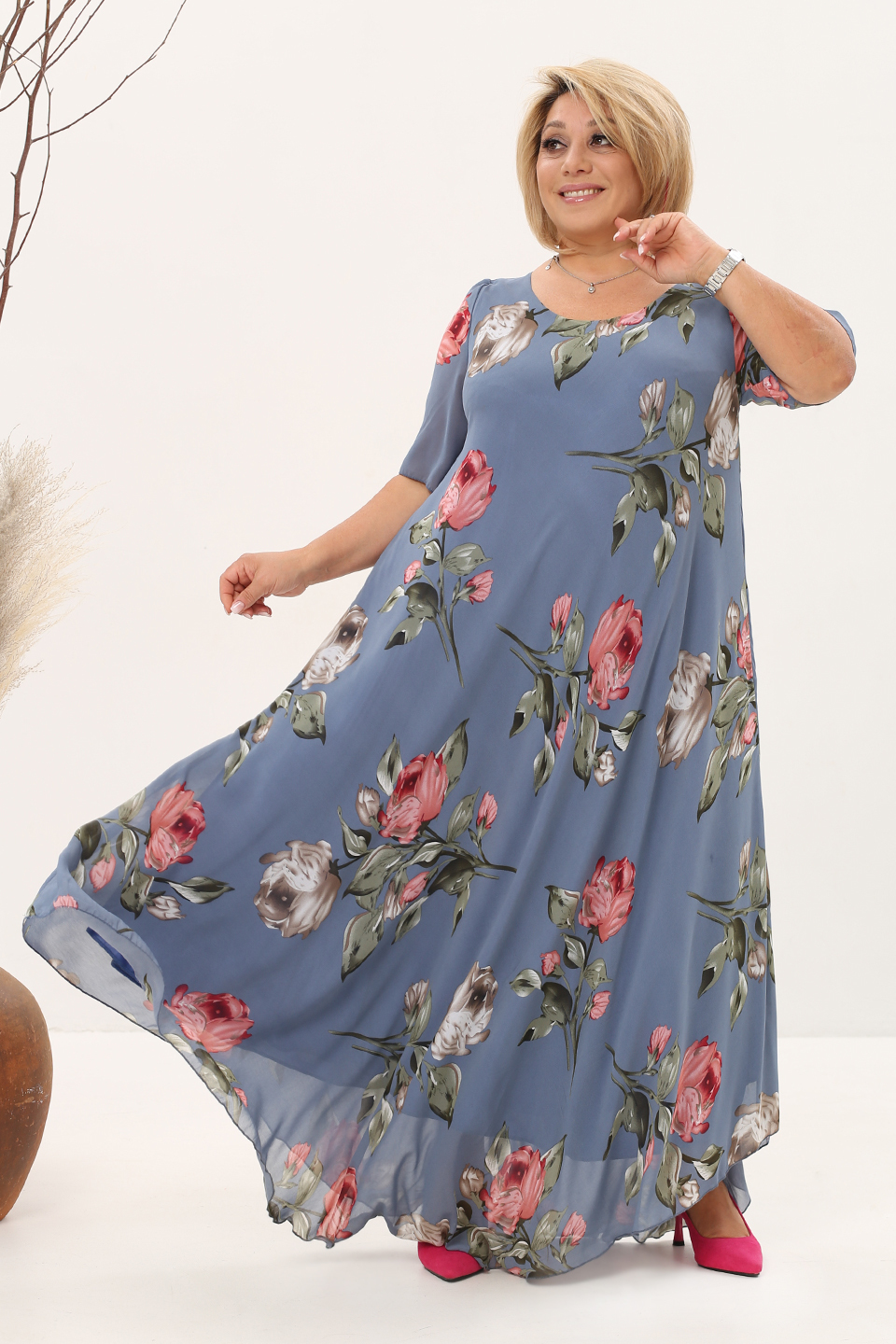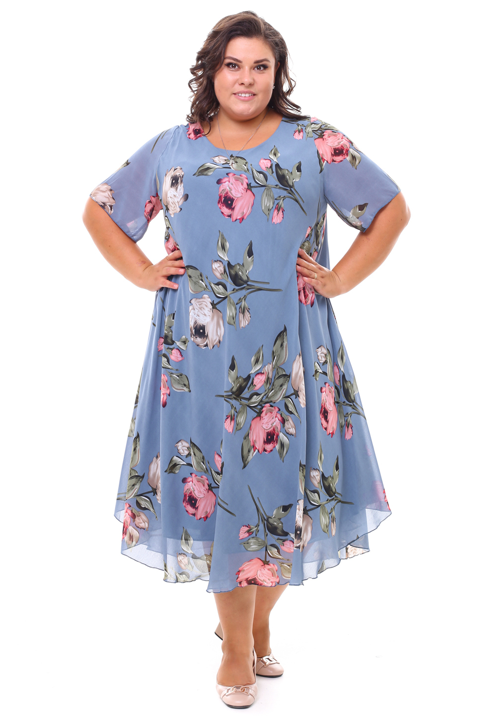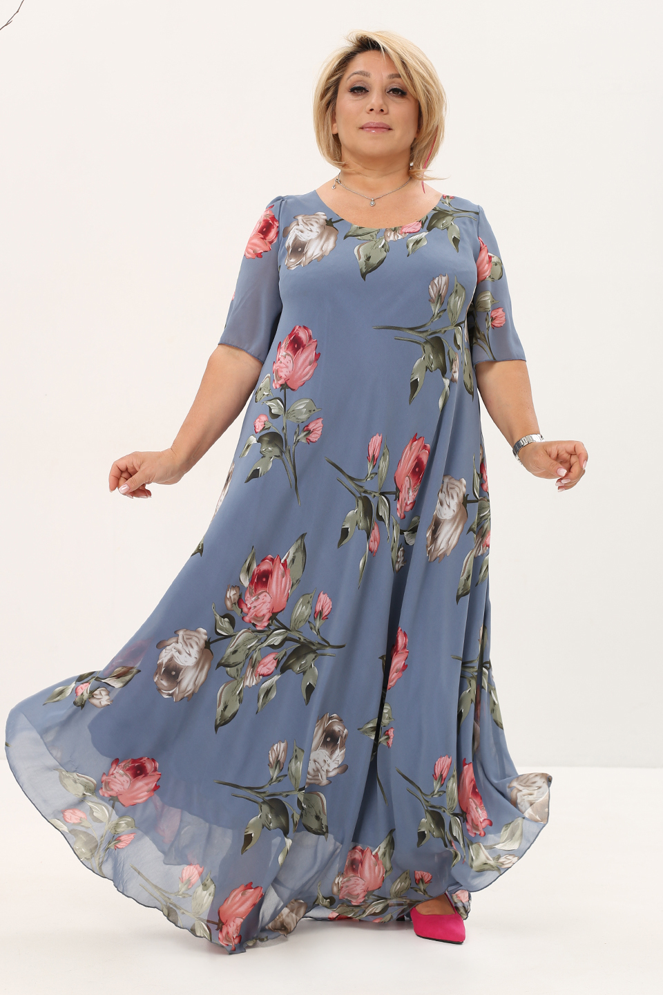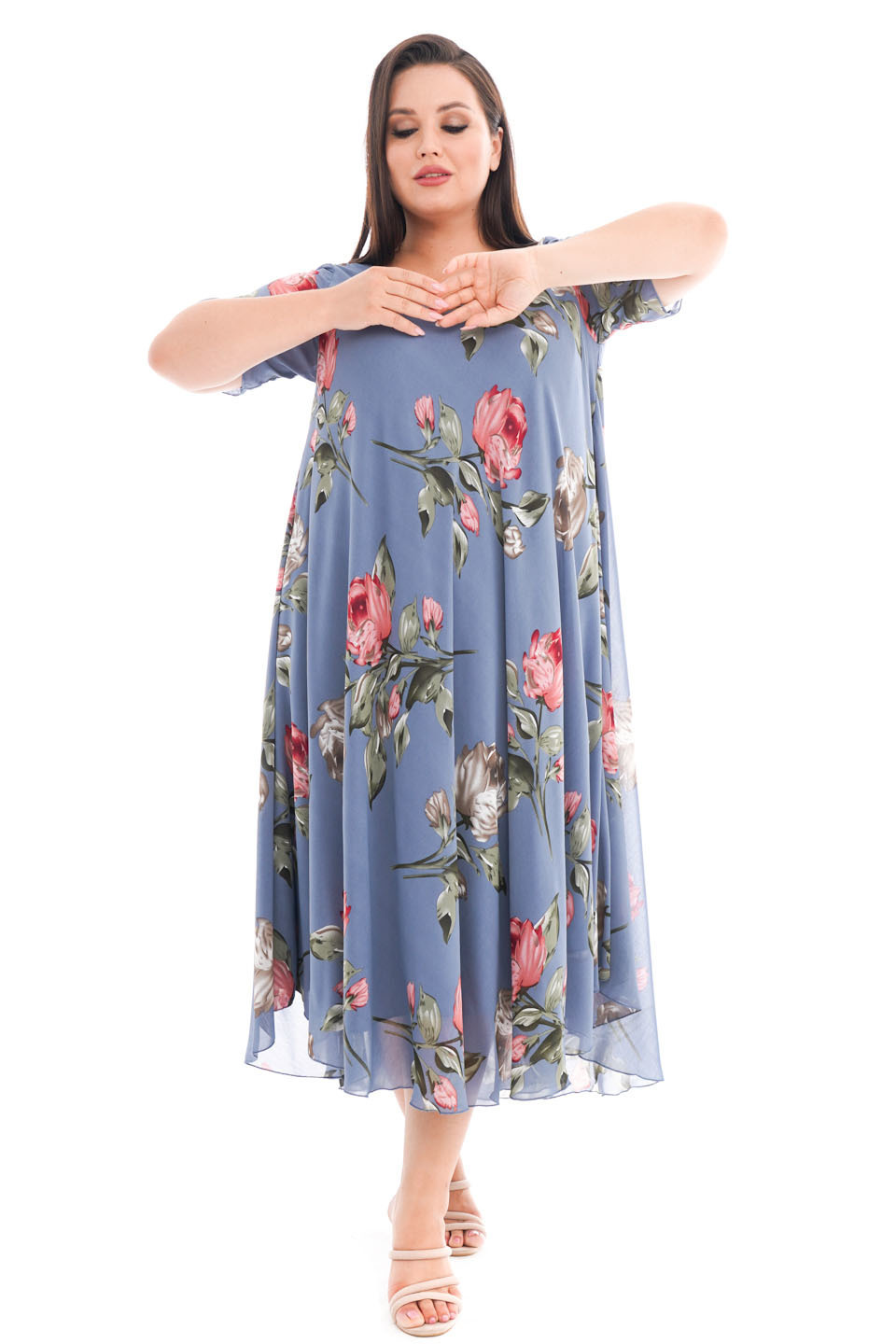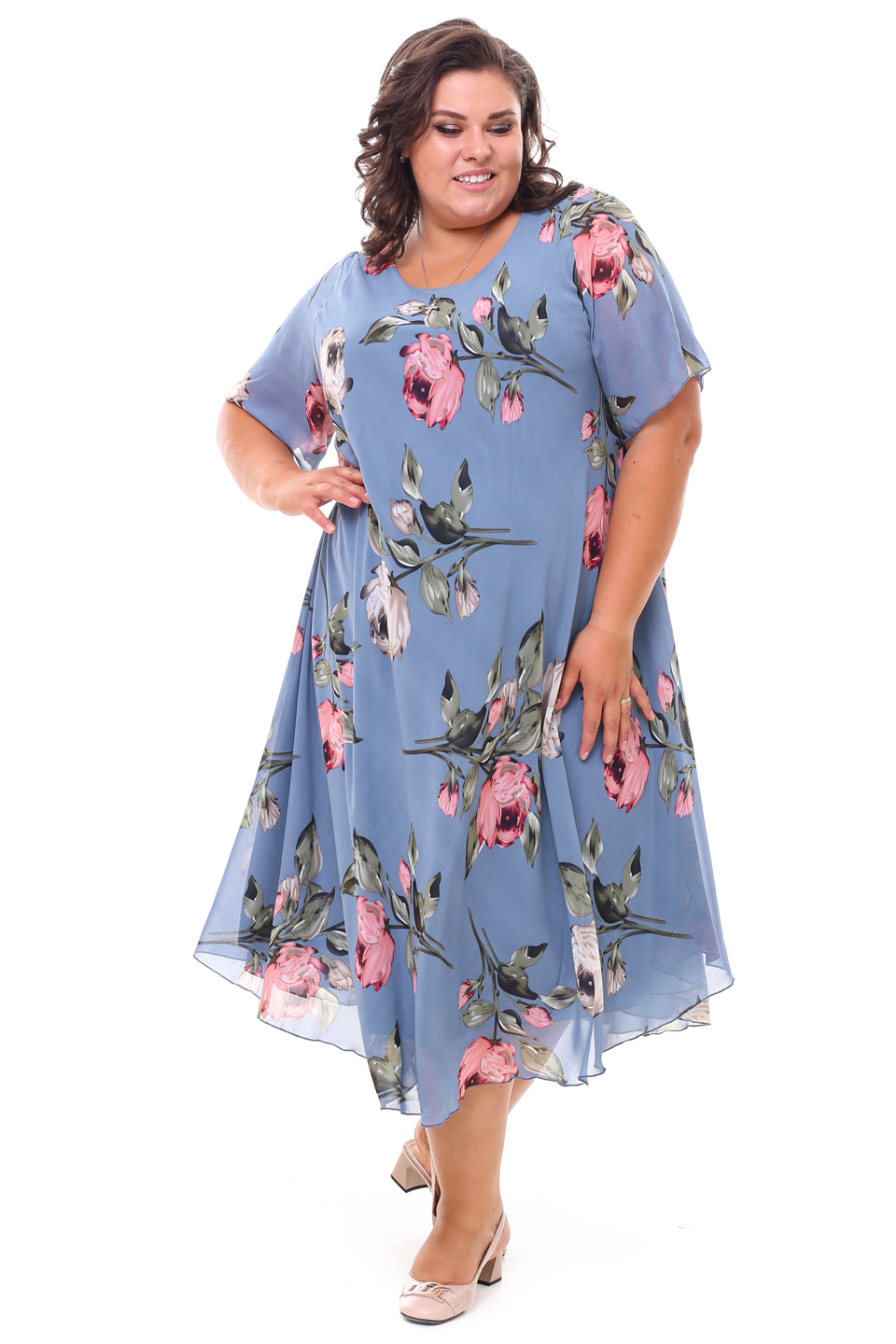 Платье "розовые розы" шифон длинное расклешенное индиго