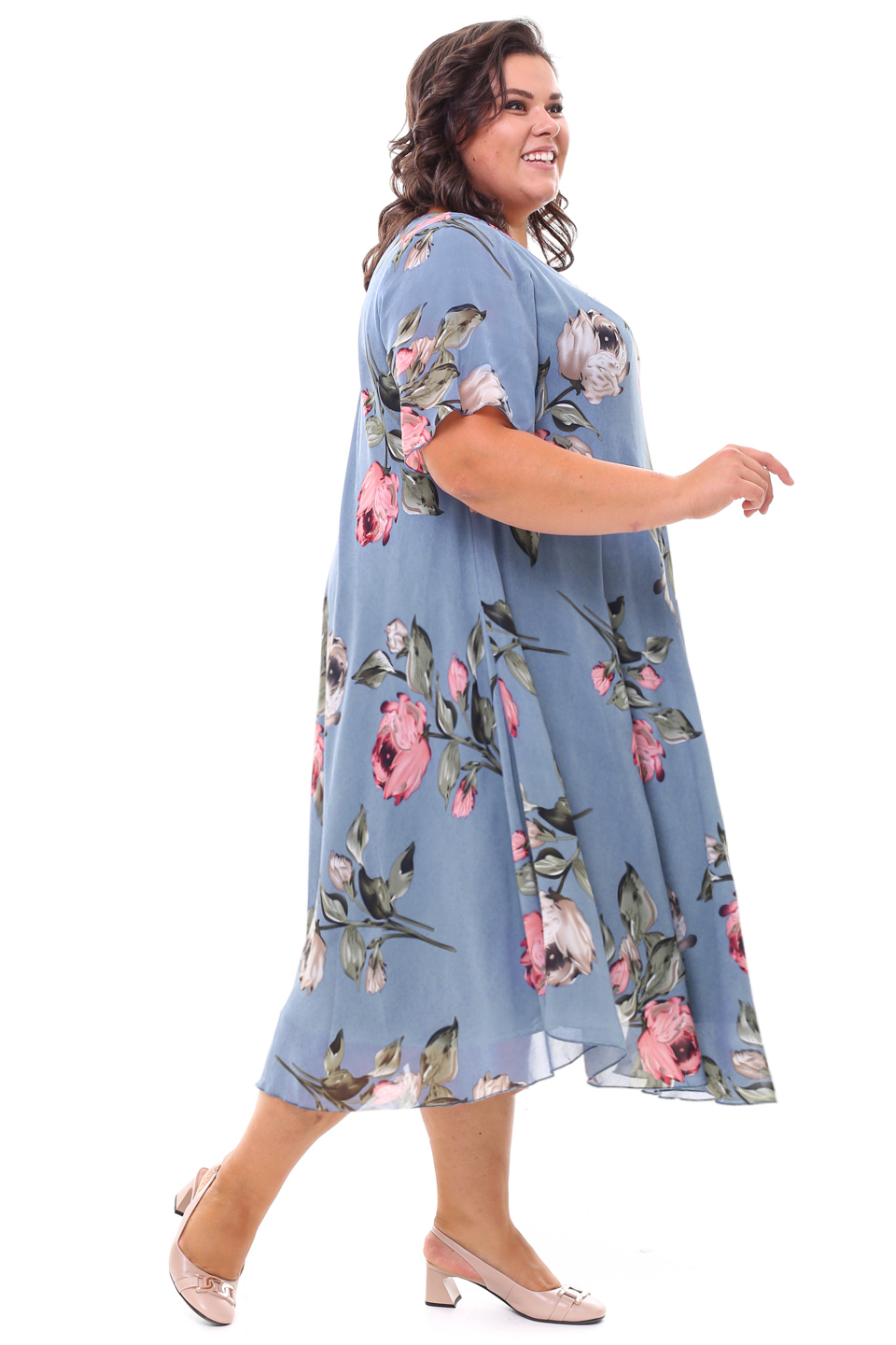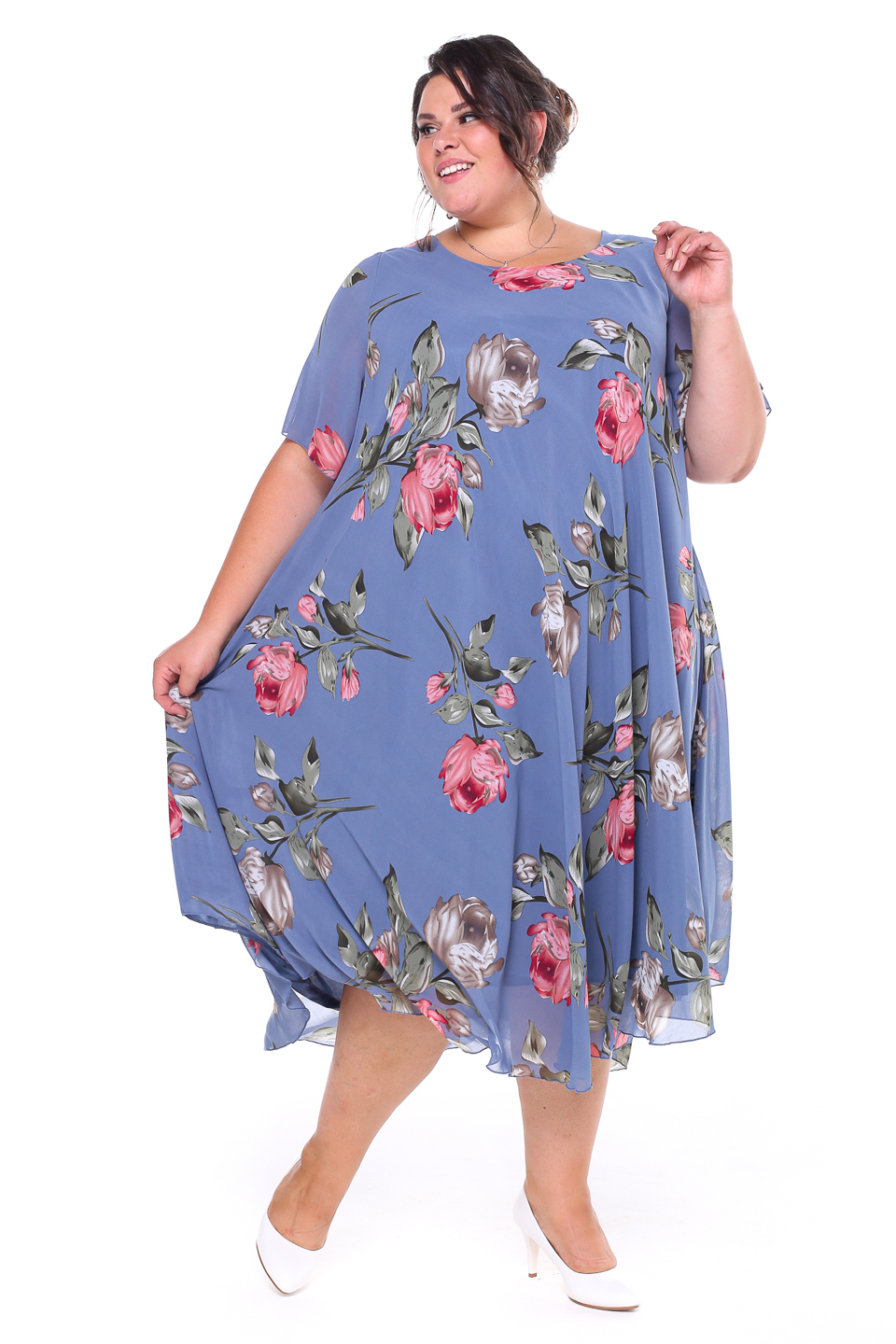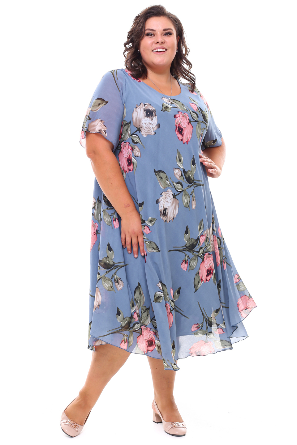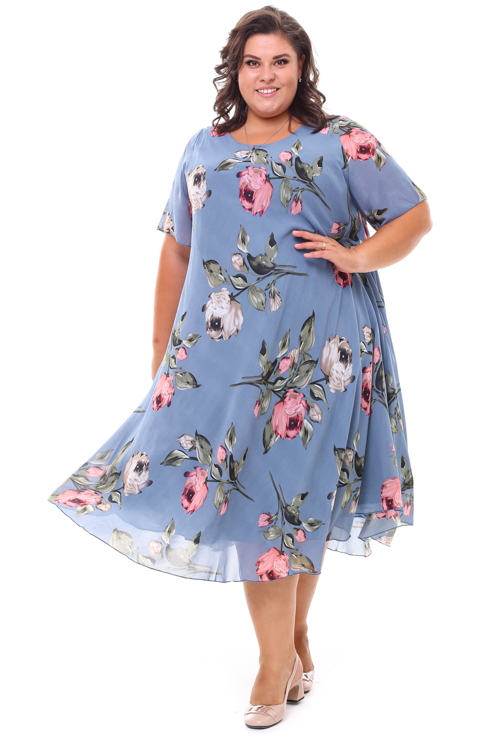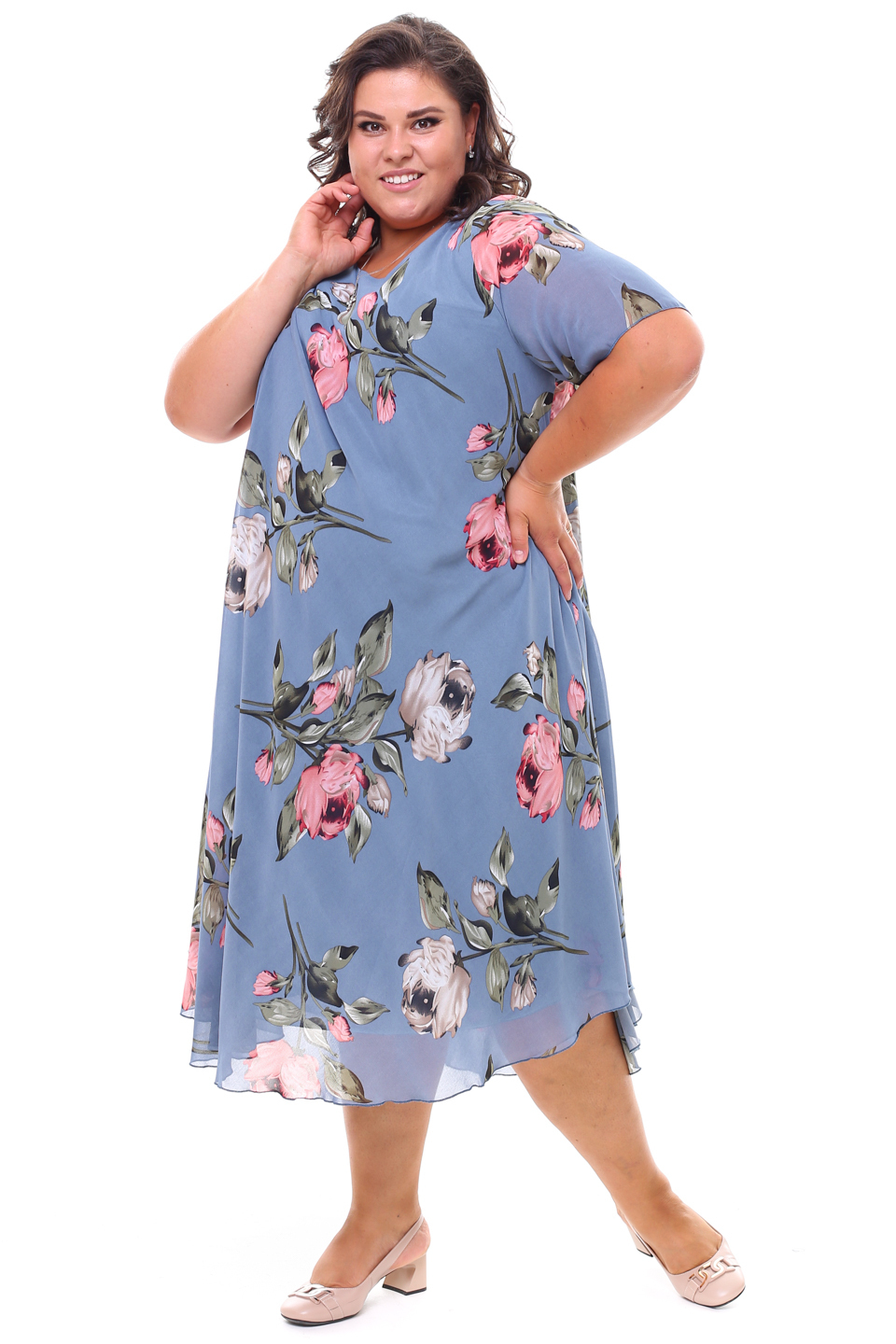 Платье "розовые розы" шифон длинное расклешенное индиго