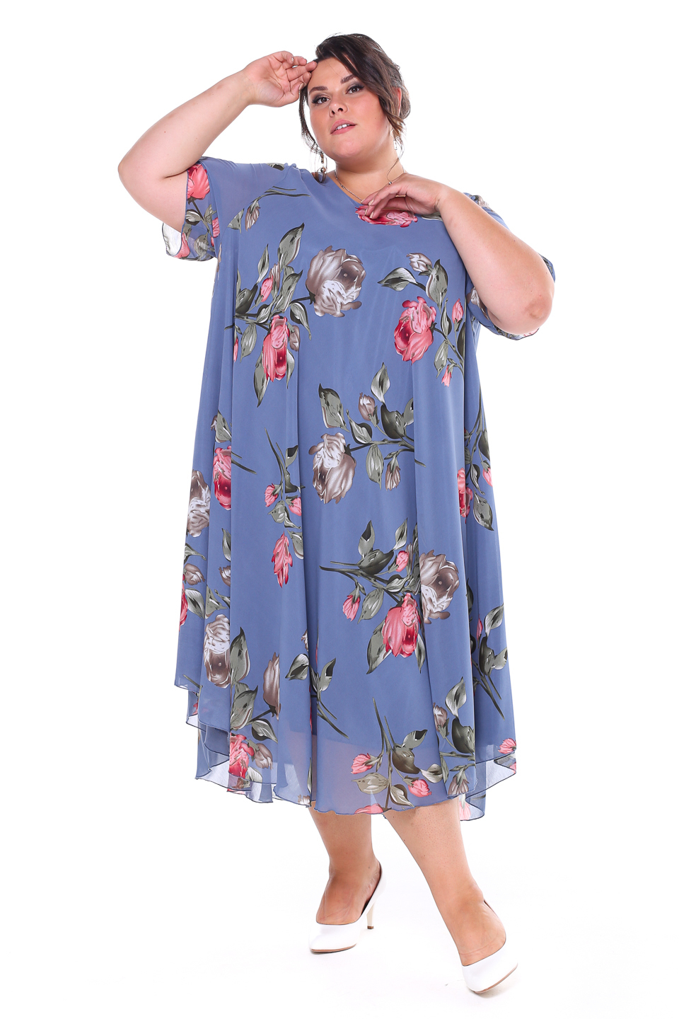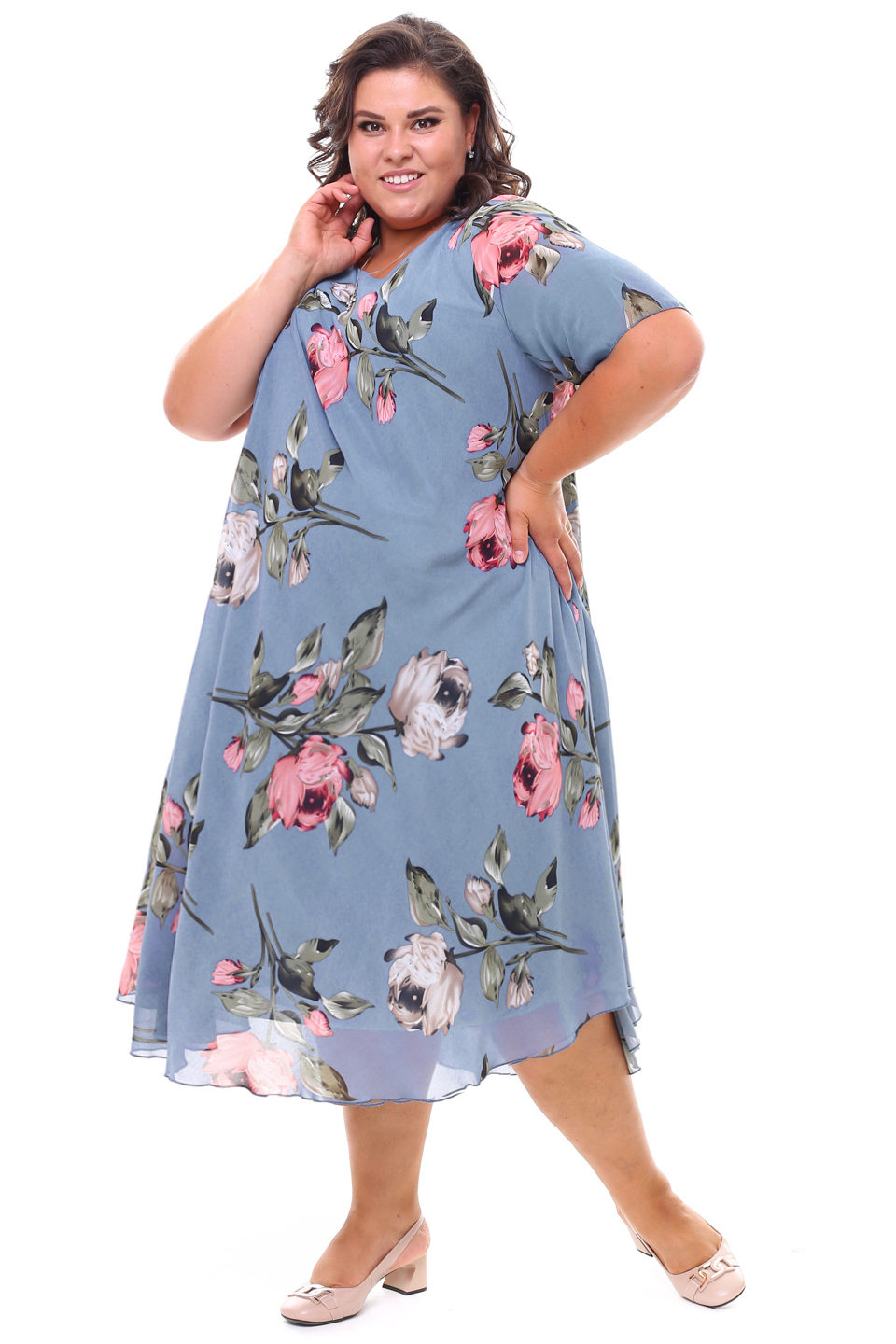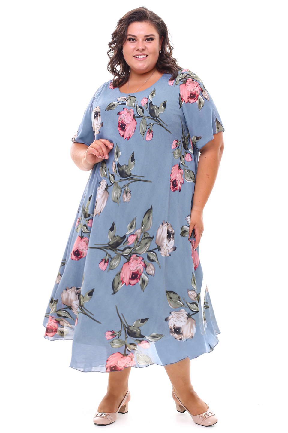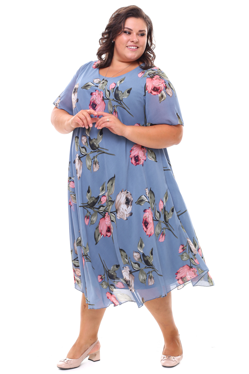 Платье "розовые розы" шифон длинное расклешенное индиго