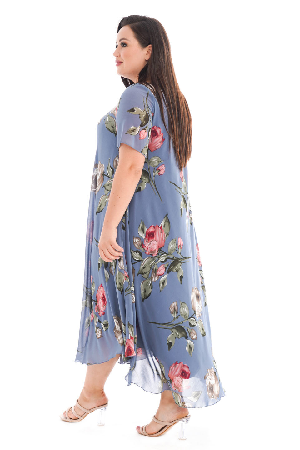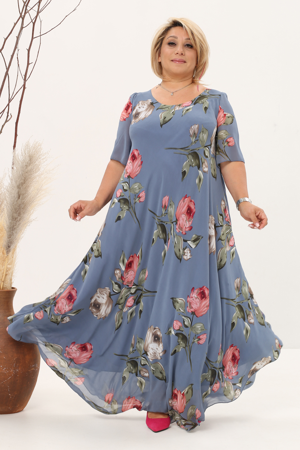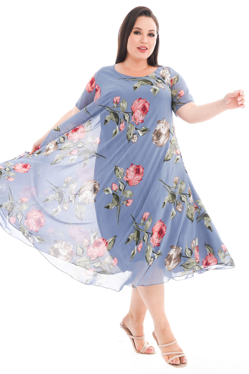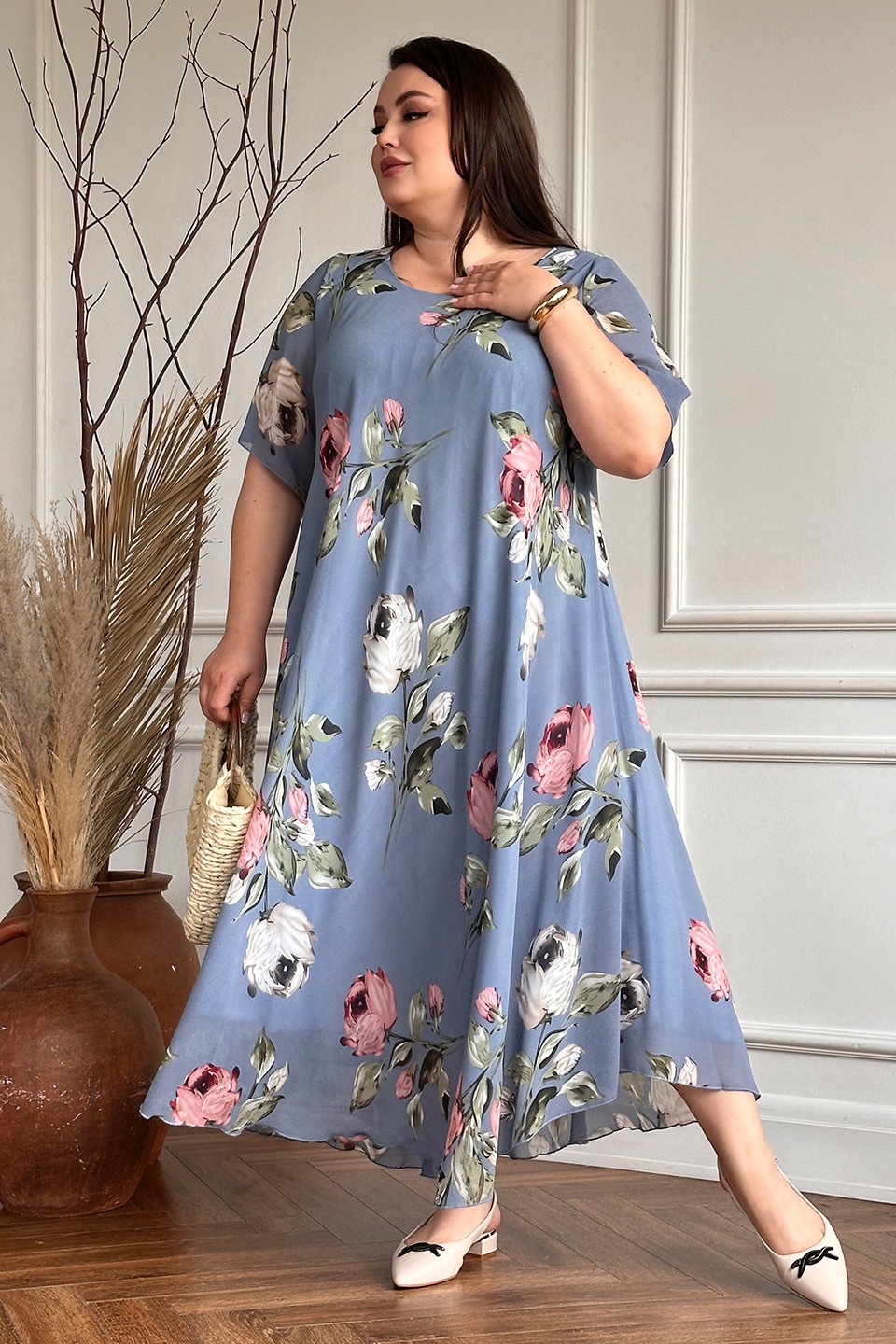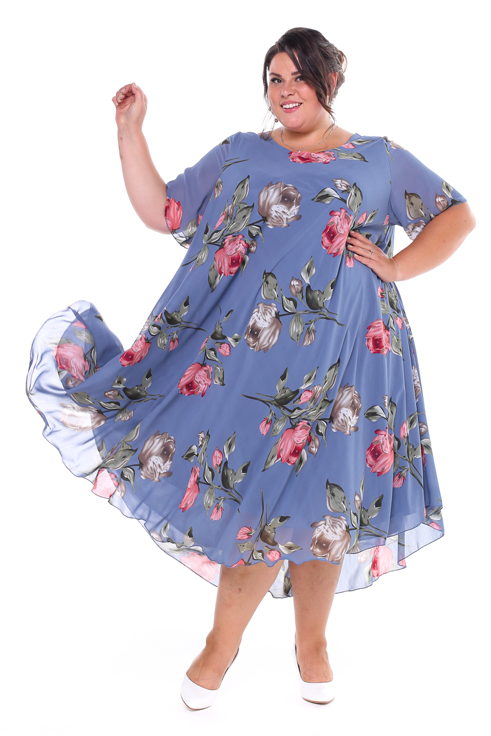 Платье "розовые розы" шифон длинное расклешенное индиго