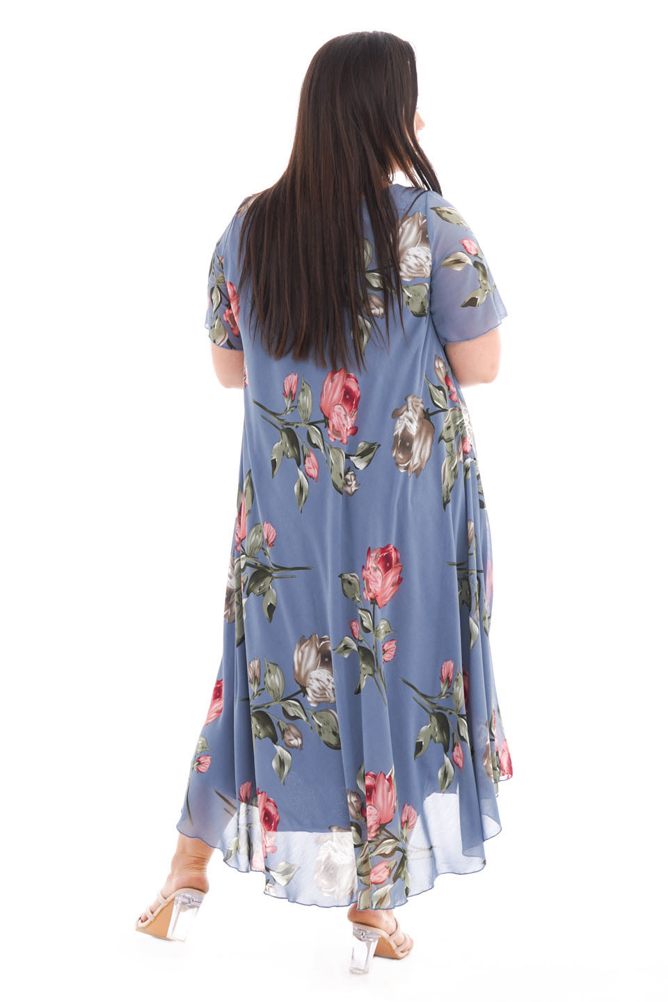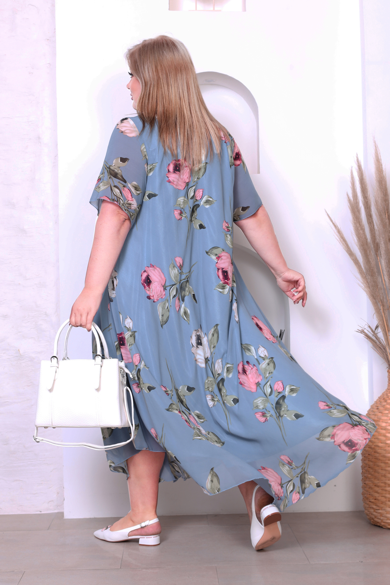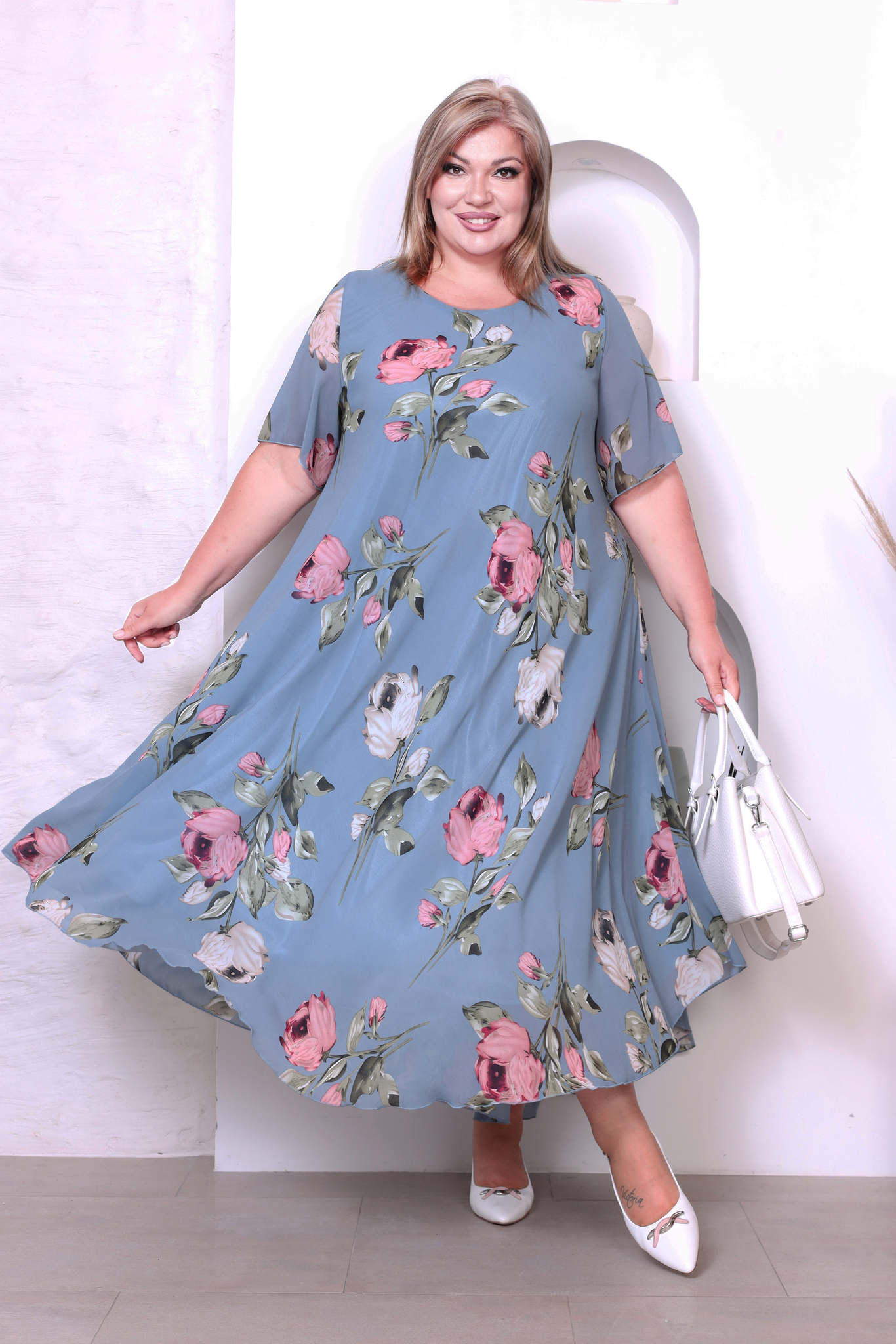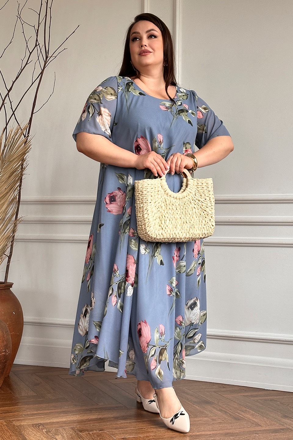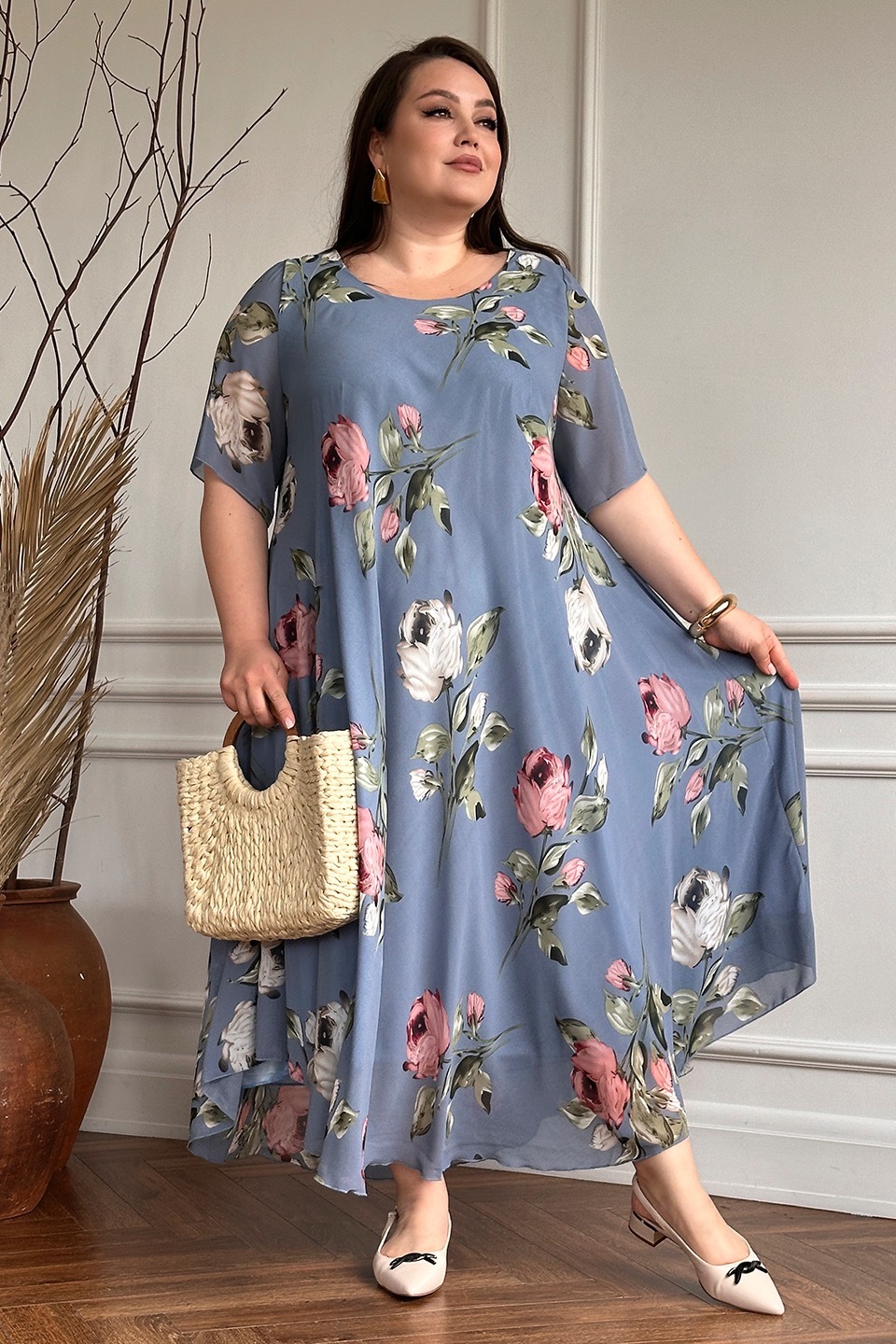Платье "розовые розы" шифон длинное расклешенное индиго