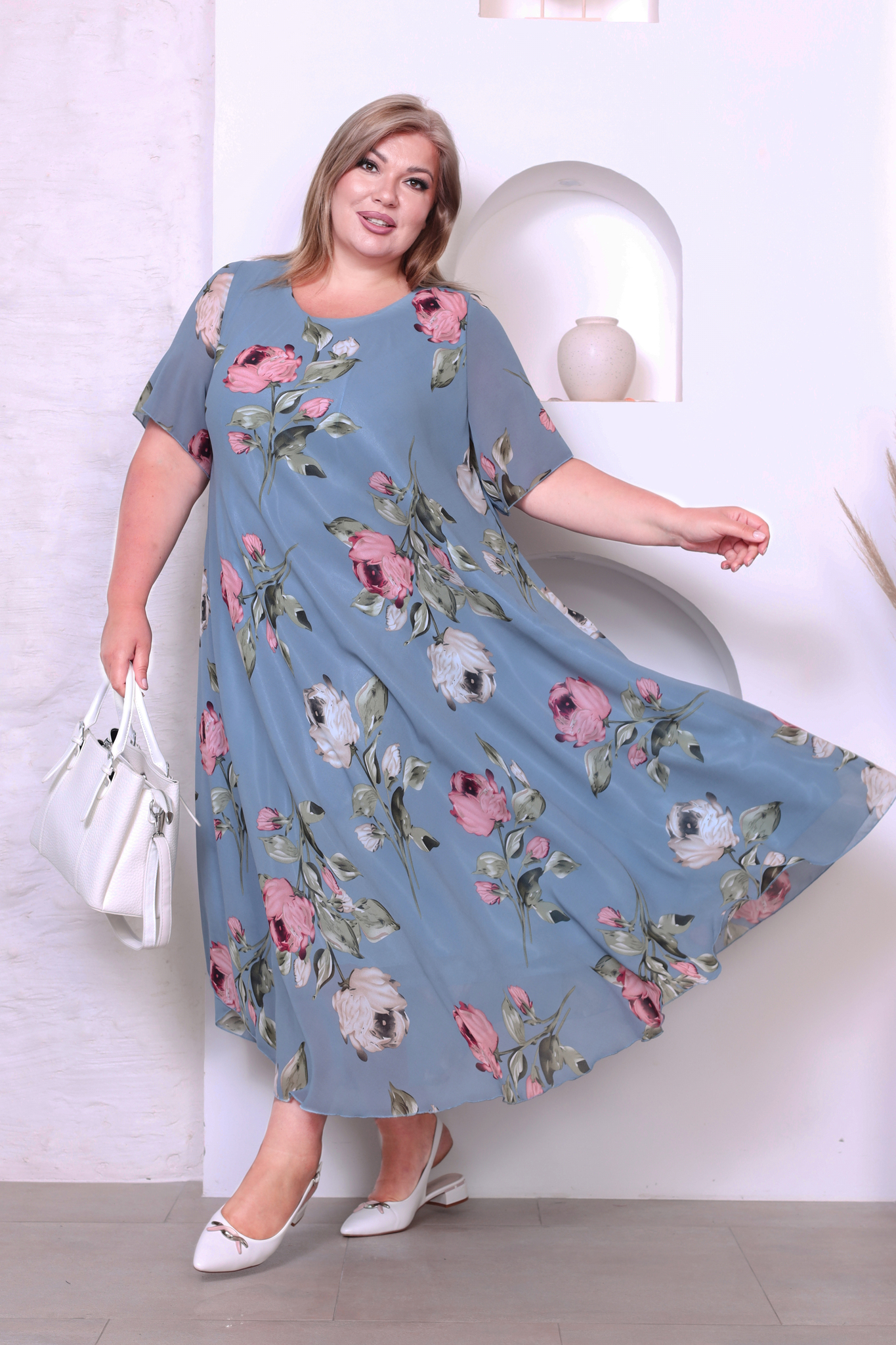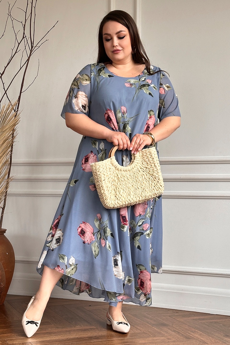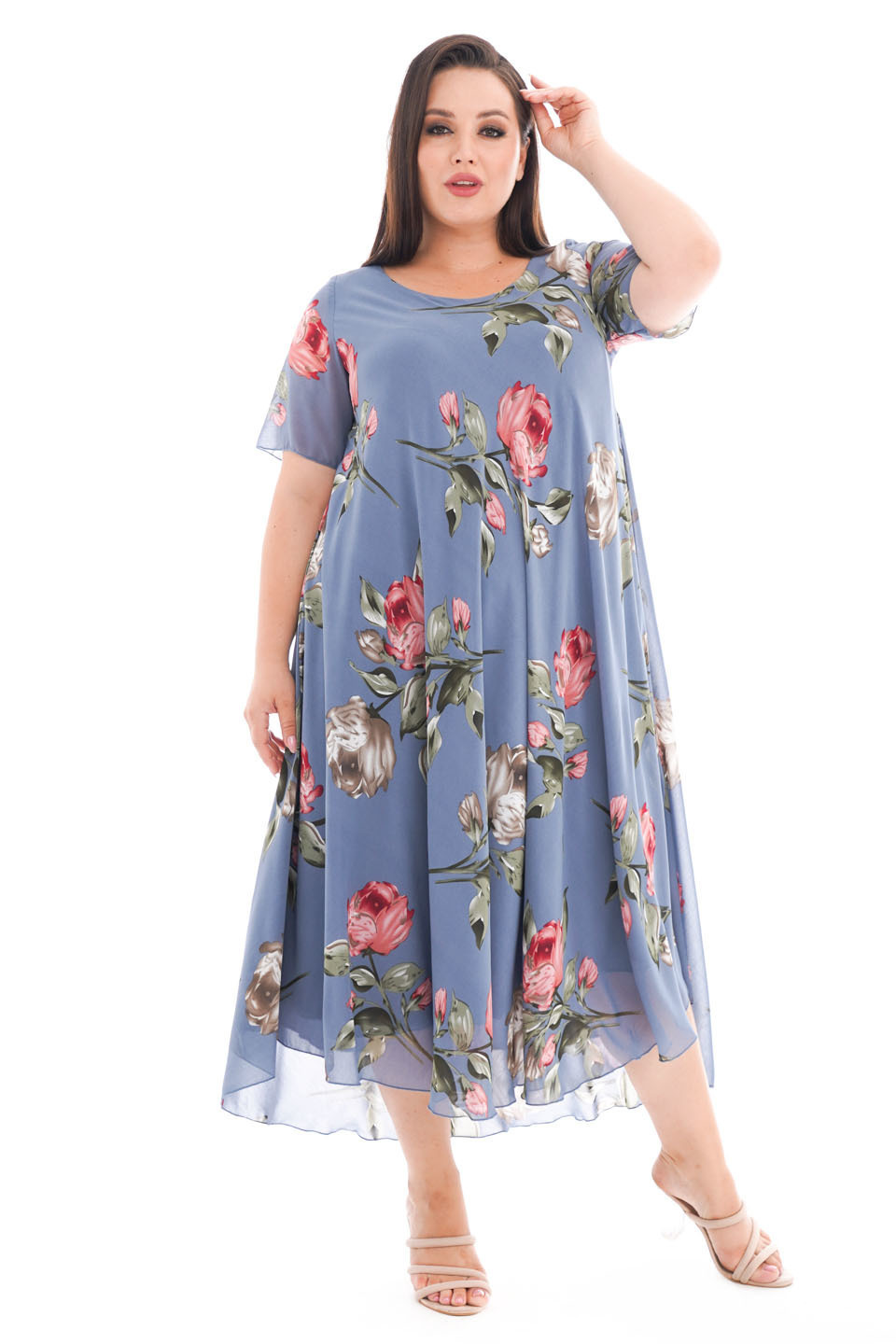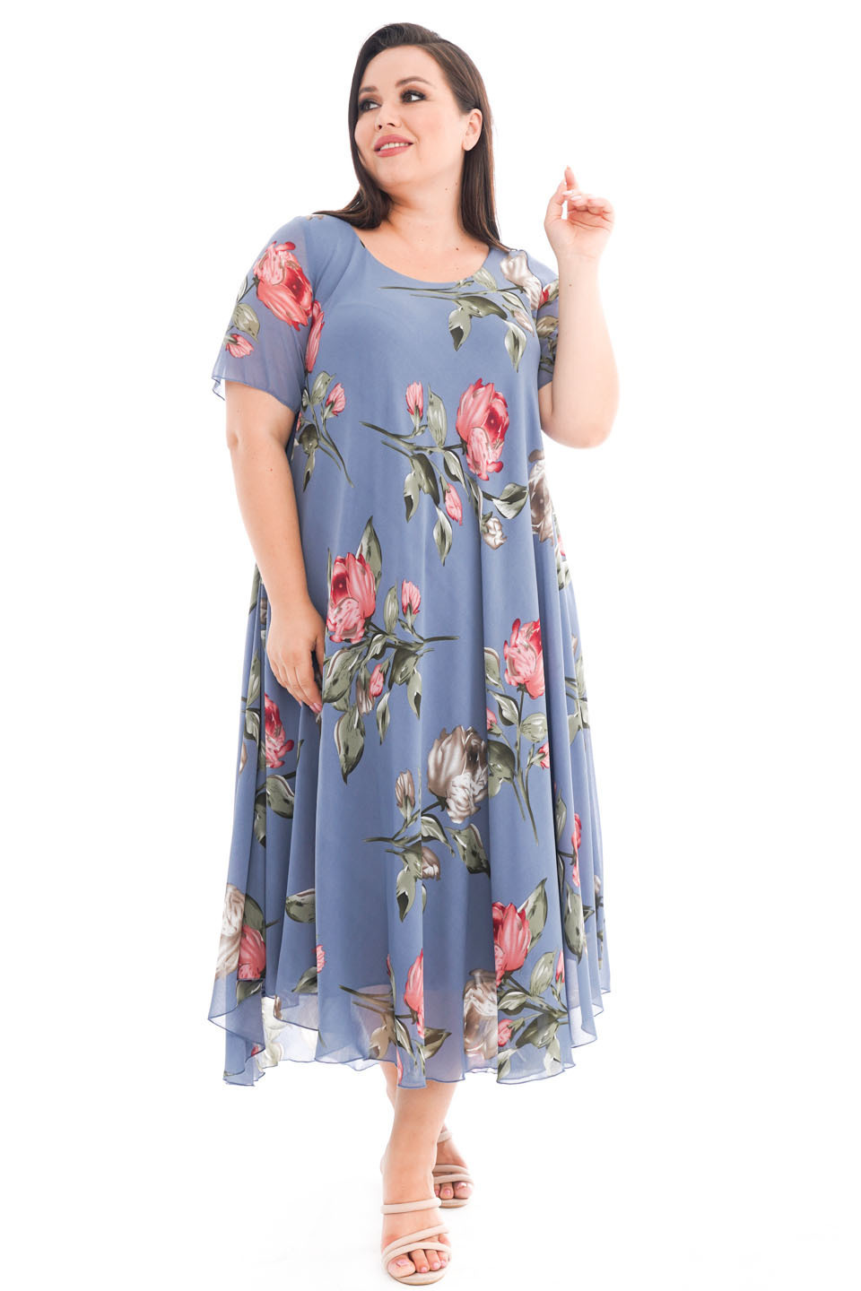 Элегантное платье миди из полупрозрачного шифона на подкладке. модель имеет широкий круглый вырез и короткие воздушные рукава. свободная юбка с асимметричными краями искусно обыгрывает фигуру и подчеркивает женственность образа. яркий цветочный принт добавляет нежности и романтичности.